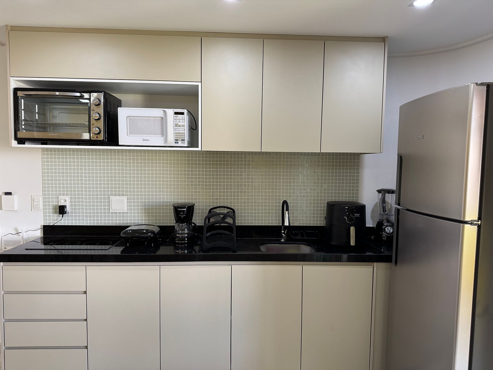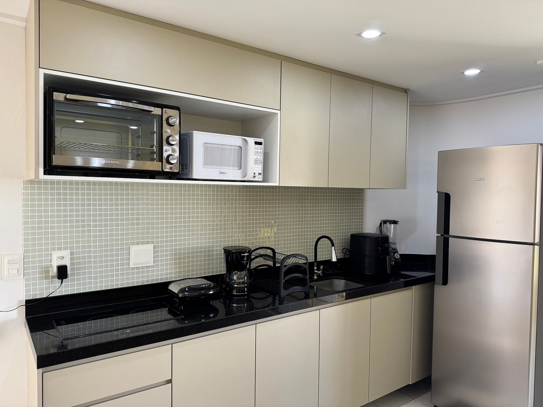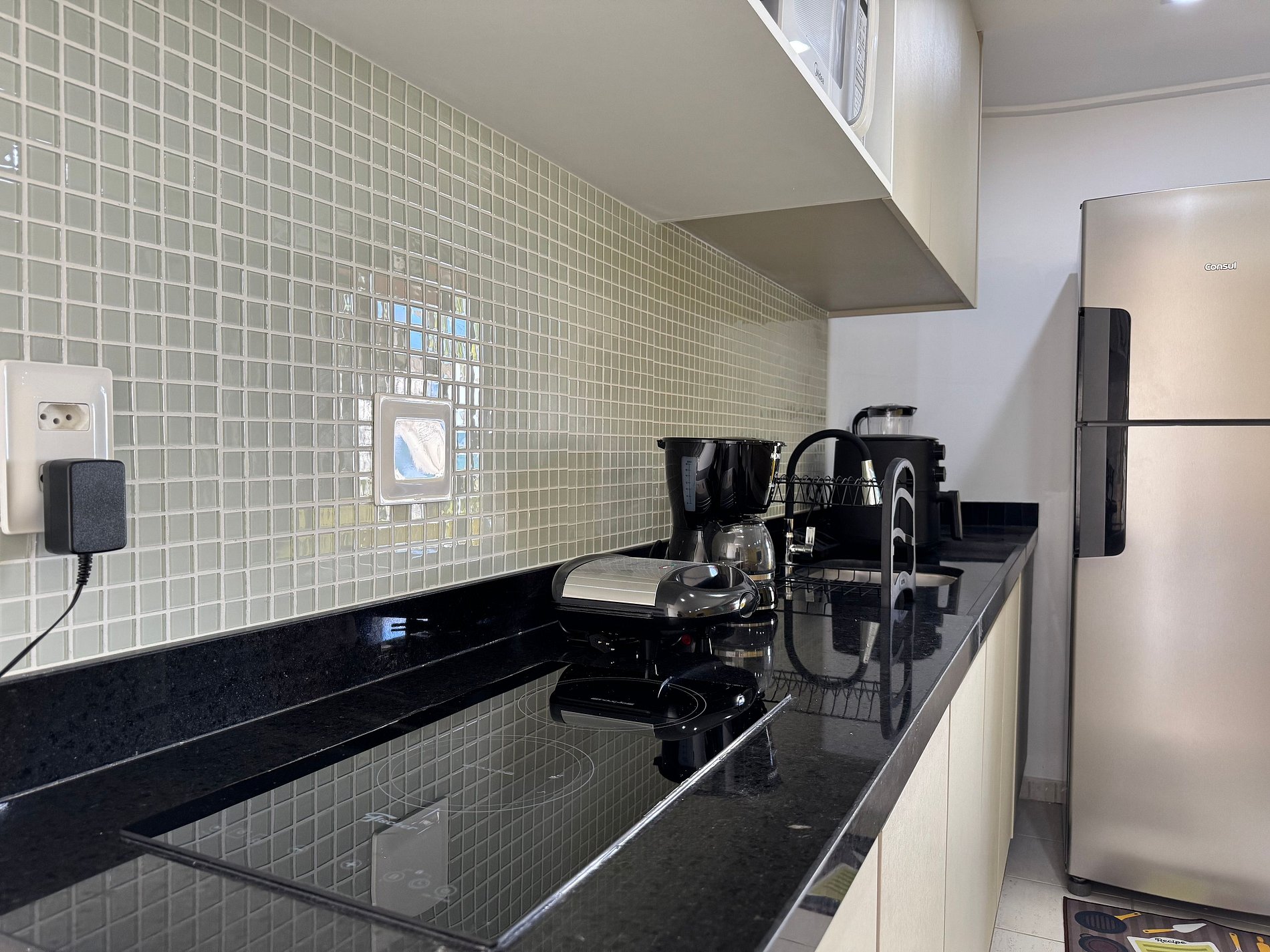 Totalmente equipado com toda infraestrutura de casa, como ferro de passar, fogão elétrico de duas bocas, forno elétrico de 46L, microondas, geladeira, torradeira, sanduicheira, liquidificador, cafeteira e demais acessórios (pratos, copos, taças, xícaras, talheres, jogo de panelas (assadores, cuscuzeira, panelas, leiteira, forma de bolo e travessas).