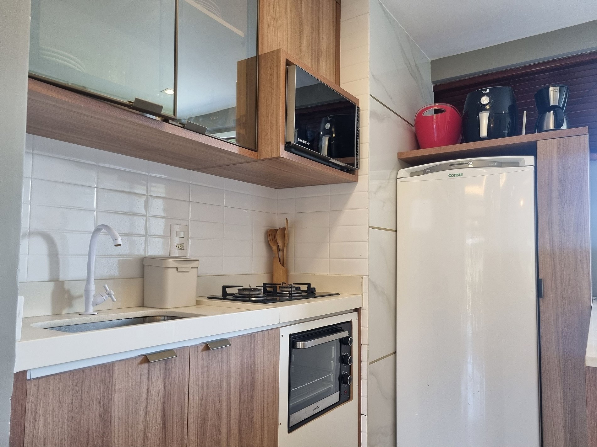 No mais, você vai encontrar 1 banheiro social, mesa para jantar, sala de estar com TV, sofá e cadeiras, varanda com mesas, cadeiras. Na cozinha você tem tudo que precisa: geladeira, micro-ondas, Airfry, fogão, forno, jogo de prato, talheres, copos, xícaras, taças, e panelas, abridor de vinho, gelágua e sanduicheira.