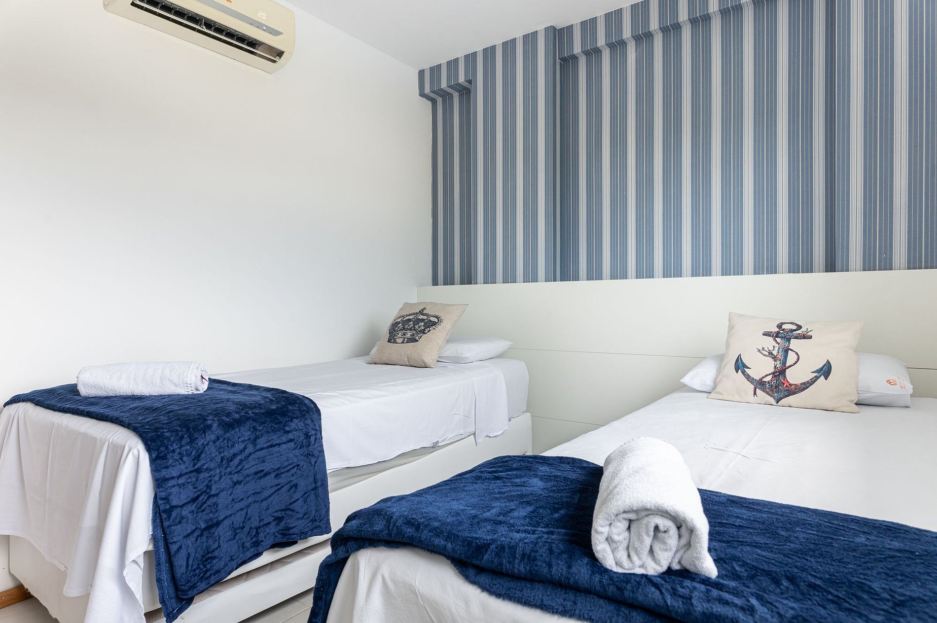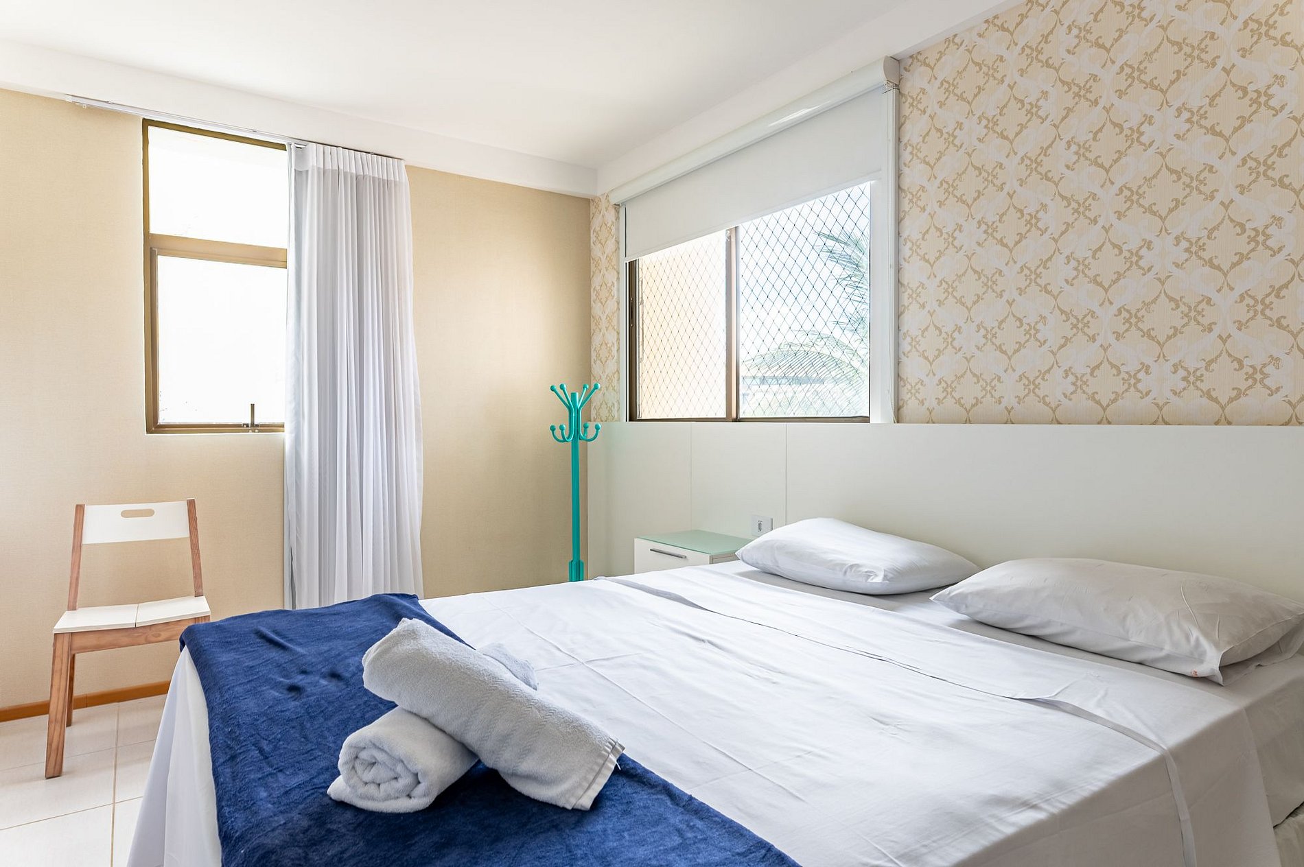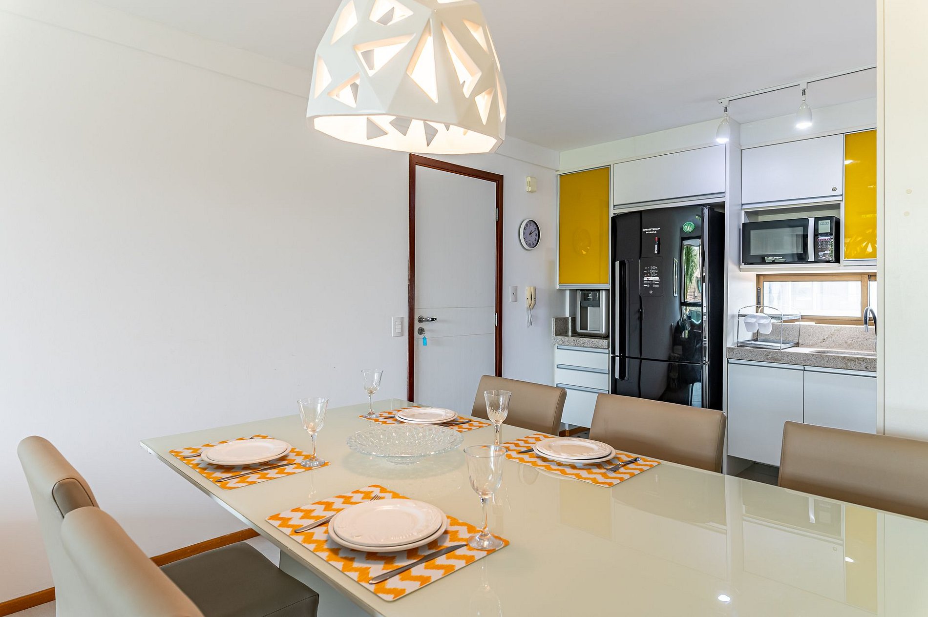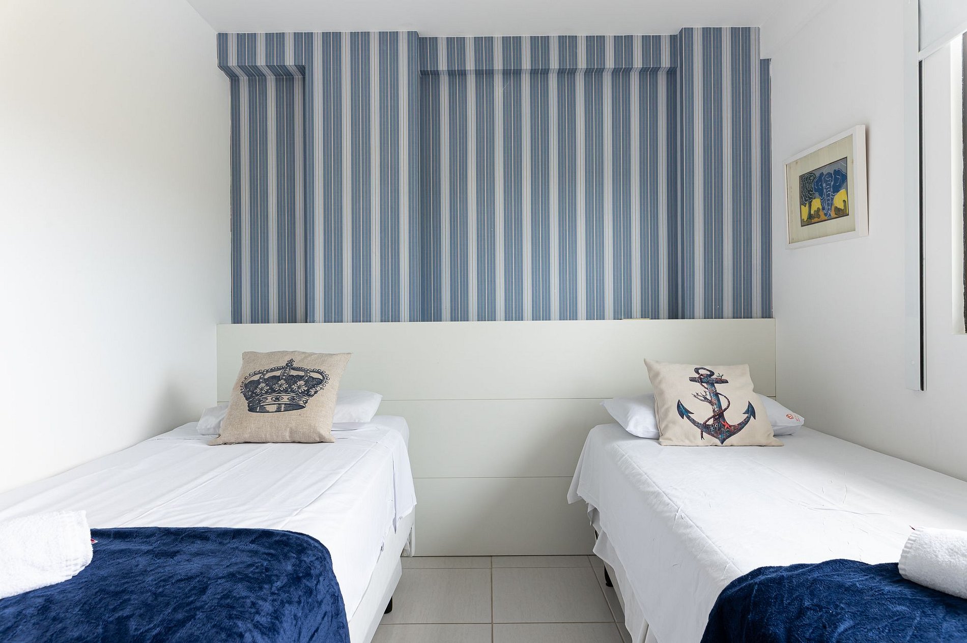 • Acomodações: O flat é totalmente mobiliado com três quartos sendo 2 camas de casal e 2 camas de solteiro e com espaços modernos e bem equipados. O apartamento é nascente e todos os quartos possui Ar-condicionado. Sala ampla com 2 ambientes e cozinha completa.