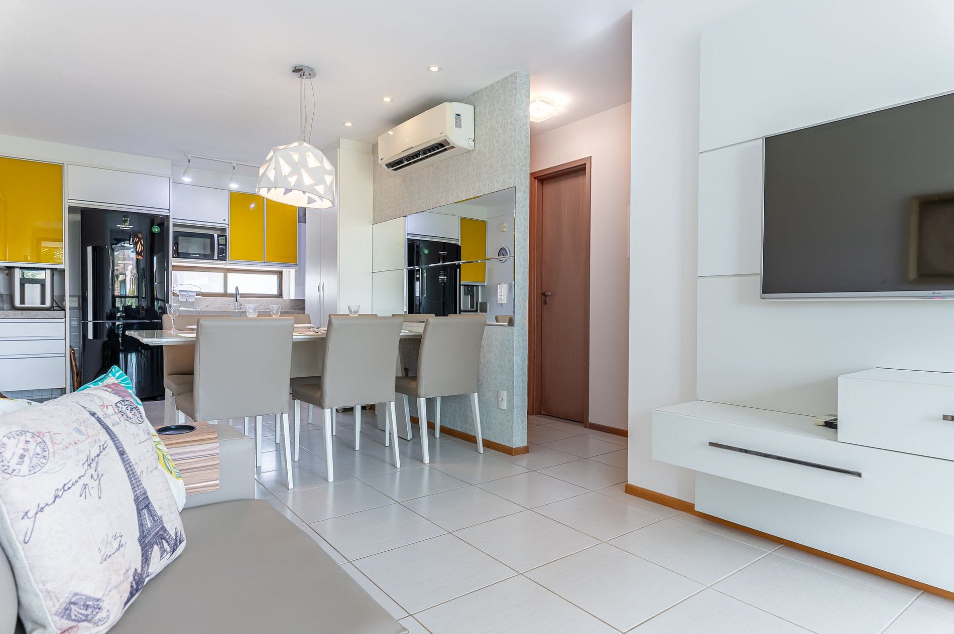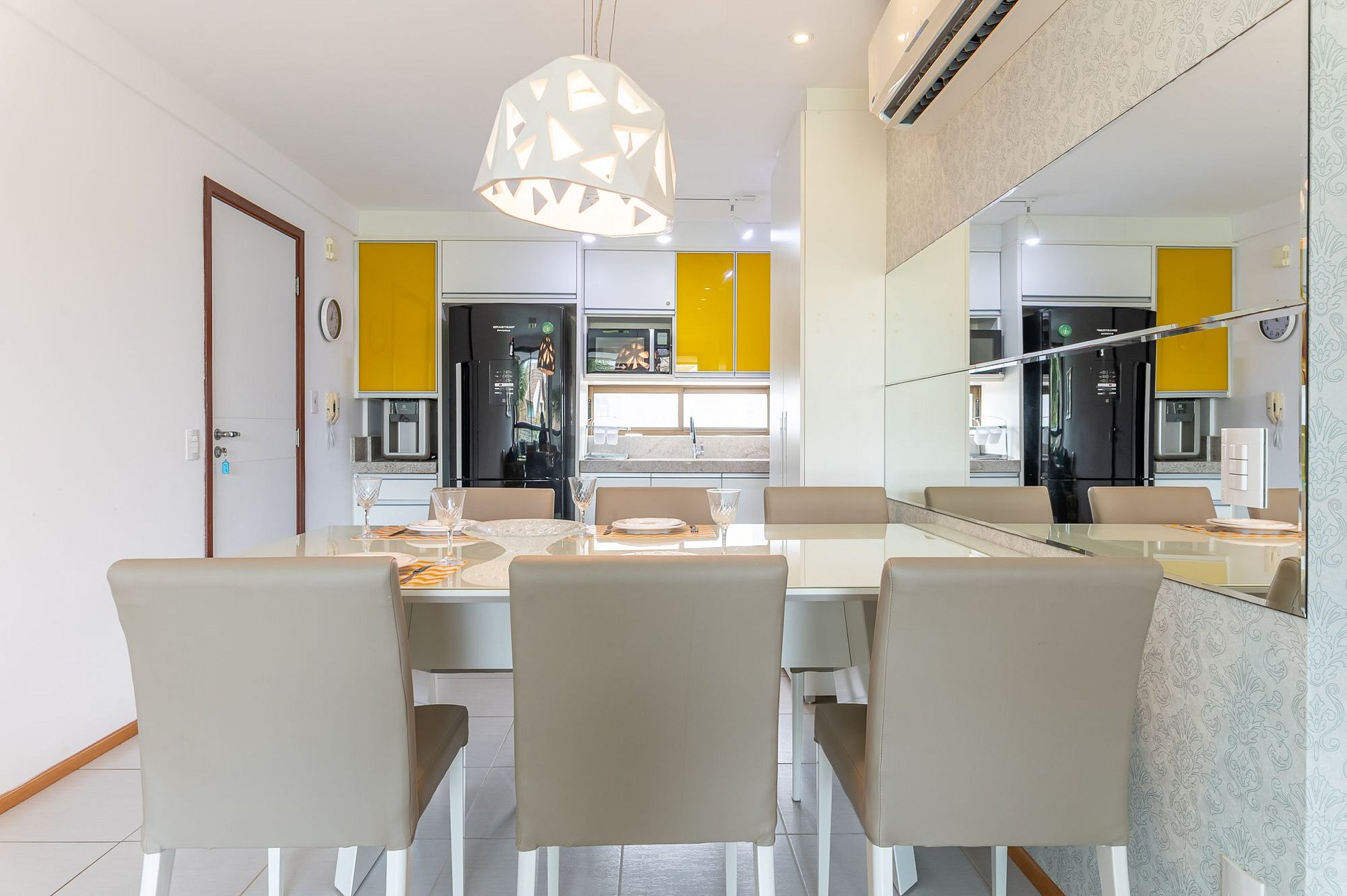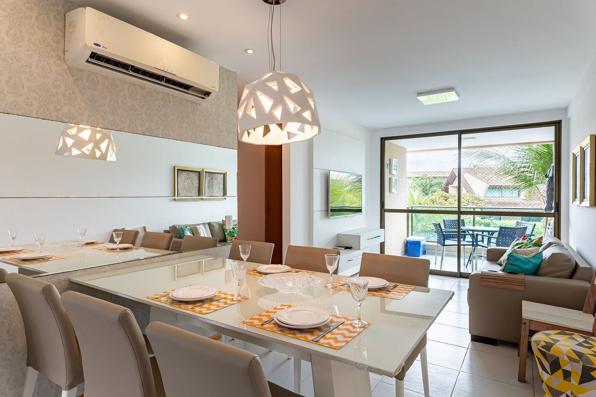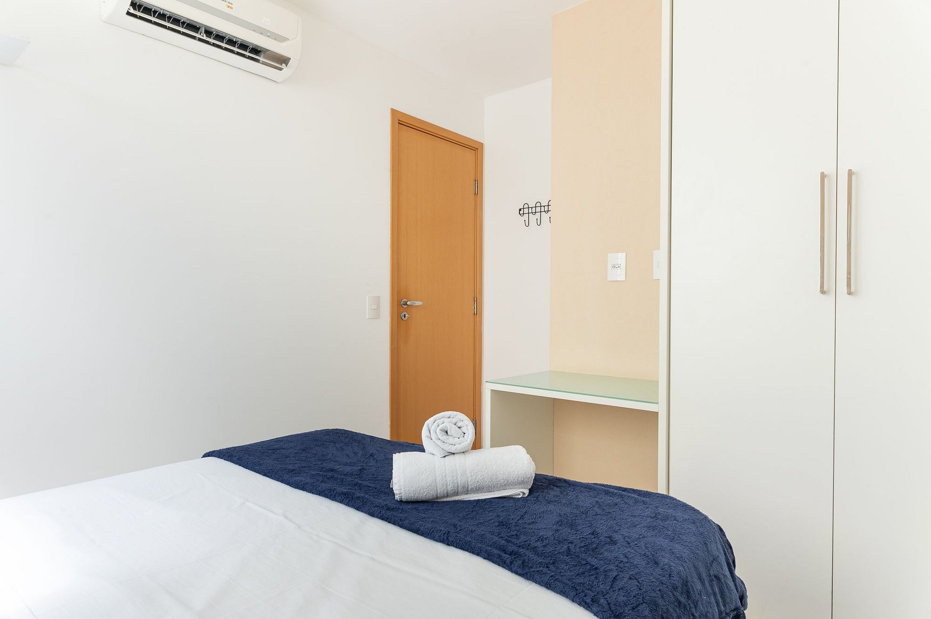 • Acomodações: O flat é totalmente mobiliado com três quartos sendo 2 camas de casal e 2 camas de solteiro e com espaços modernos e bem equipados. O apartamento é nascente e todos os quartos possui Ar-condicionado. Sala ampla com 2 ambientes e cozinha completa.