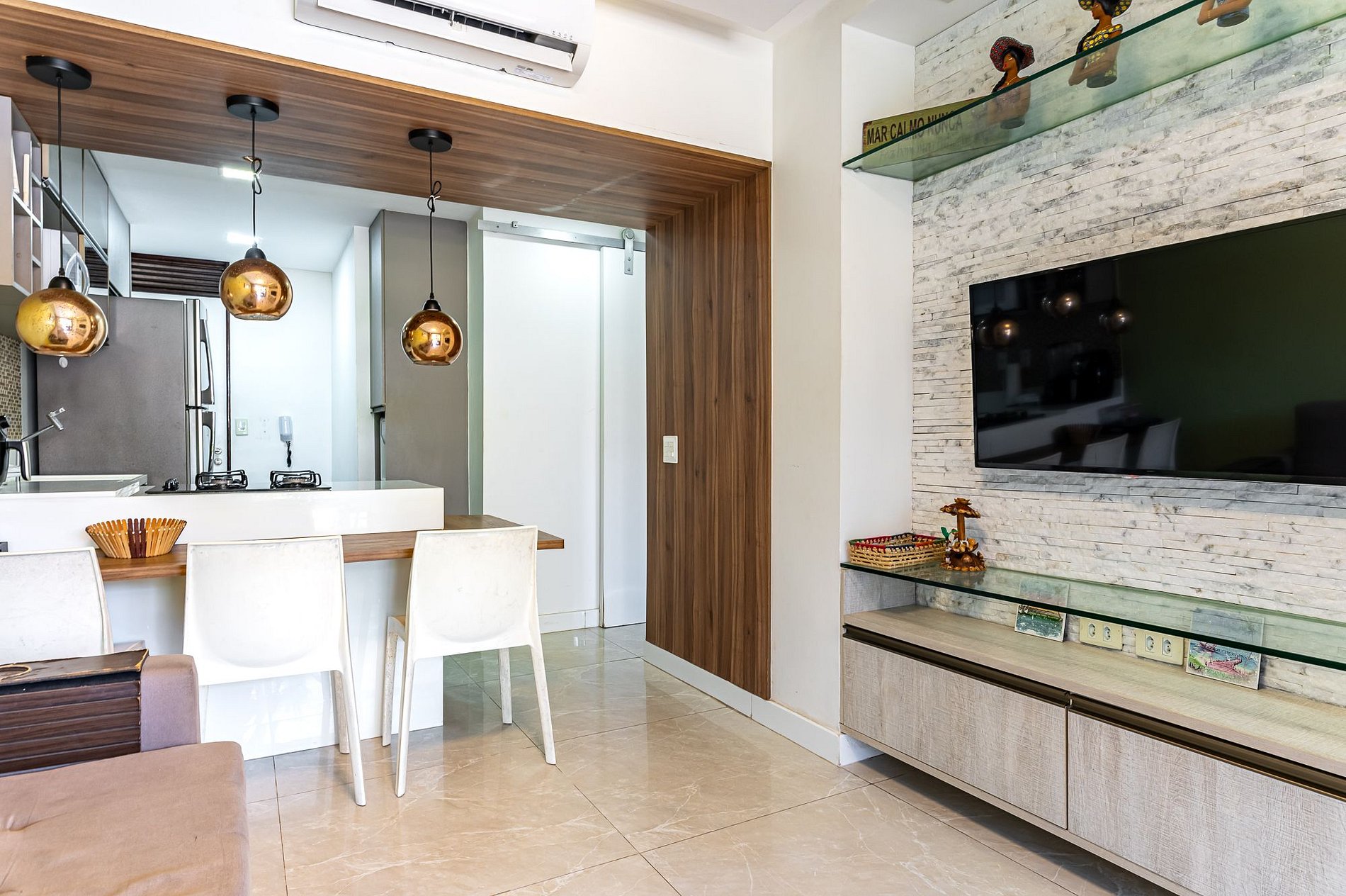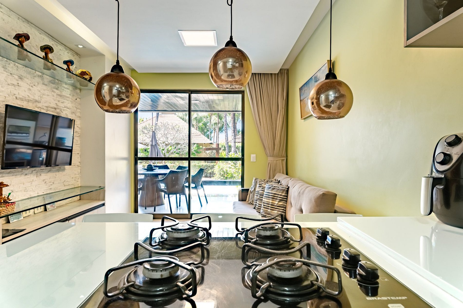 No mais, você vai encontrar 1 banheiro social, mesa para jantar, sala de estar com TV, sofá e cadeiras, varanda com churrasqueira e cervejeira, mesa e cadeiras. Na cozinha você tem tudo que precisa: geladeira, micro-ondas, fogão, forno, jogo de prato, talheres, copos, xícaras, taças, e panelas, abridor de vinho e sanduicheira.