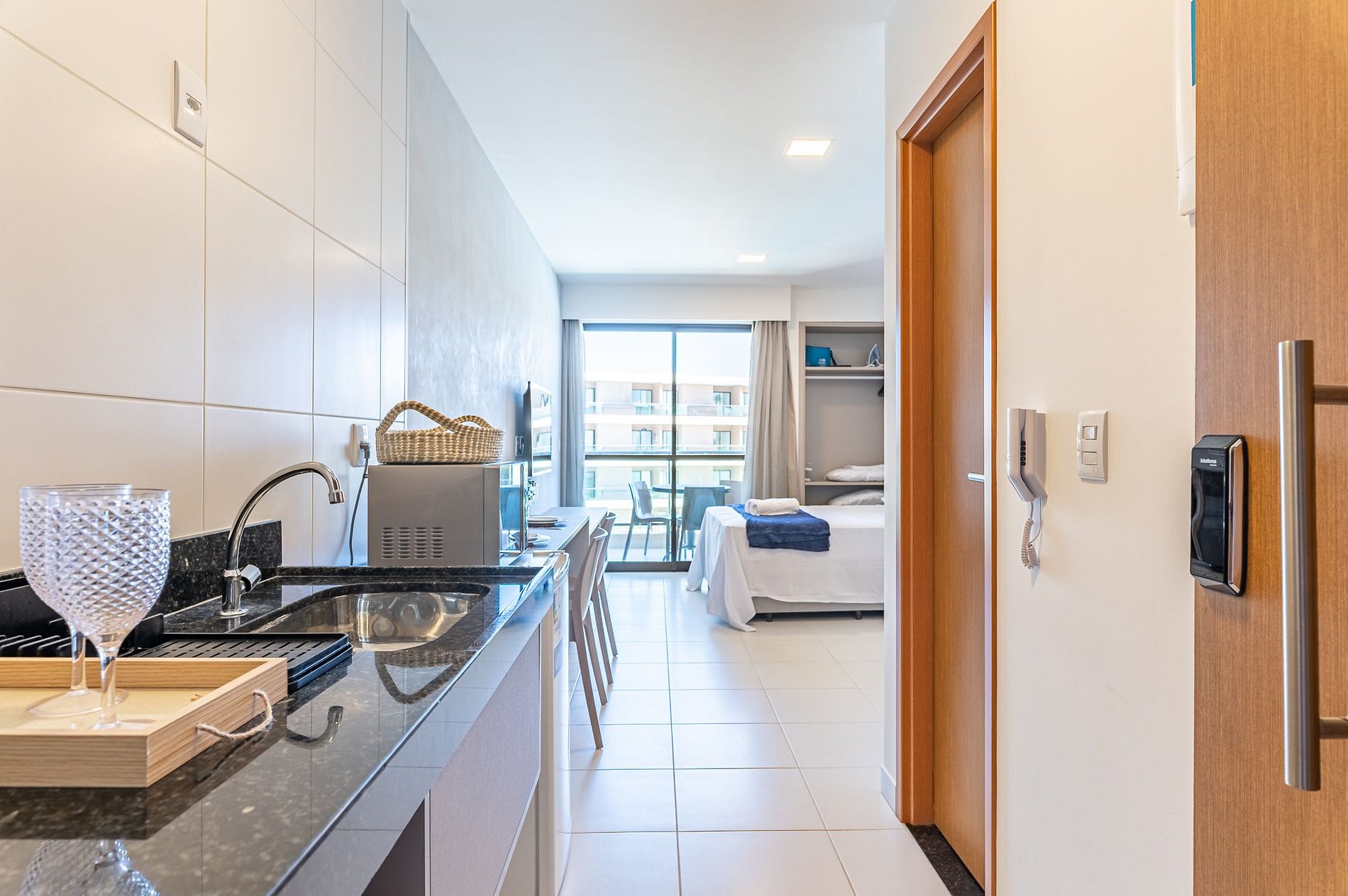 O apartamento tem 26m2, uma suíte completa com Smart TV 50", Arcondicionado 19mil Btus, Frigobar, Fogão Elétrico 2 bocas, Forno Microondas, Cama Casal mais sofá cama casal.