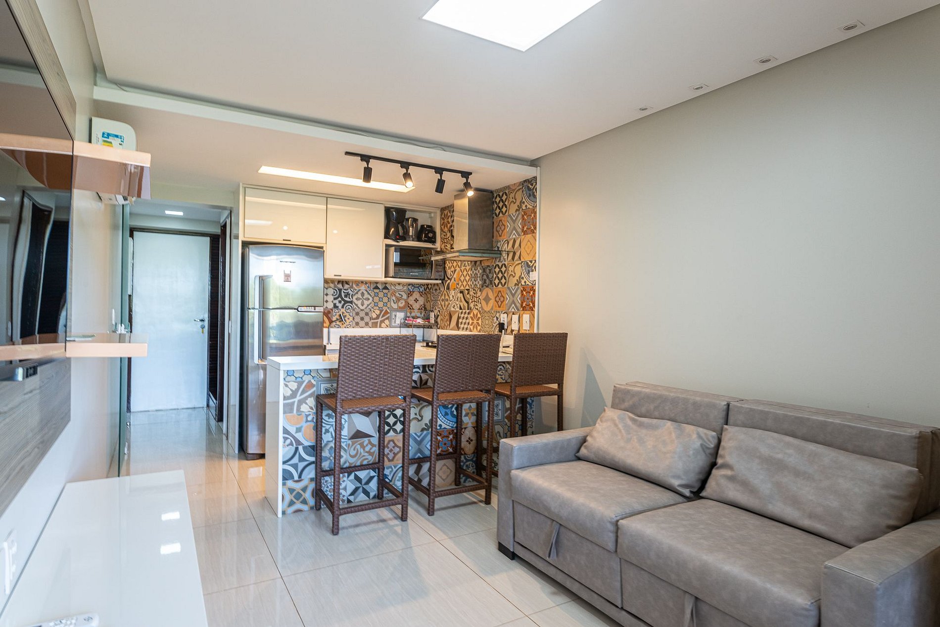 Praia do Muro Alto é uma ótima escolha para viajantes interessados em locais com clima tropical, litoral e sol em abundância. Nesse local, hospede-se em uma unidade perfeita para família ou amigos, acomodando até 5 pessoas, com bastante espaço, linda decoração e com estrutura de resort de encher os olhos. Com um quarto sendo dividido em dois ambientes com cama de casal e cada espaço, nos dois ambientes tem TV, ar-condicionado, guarda-roupas. Conte ainda com mais 1 sala reversível que pode virar quarto a noite com sofá cama casal, TV e ar-condicionado.