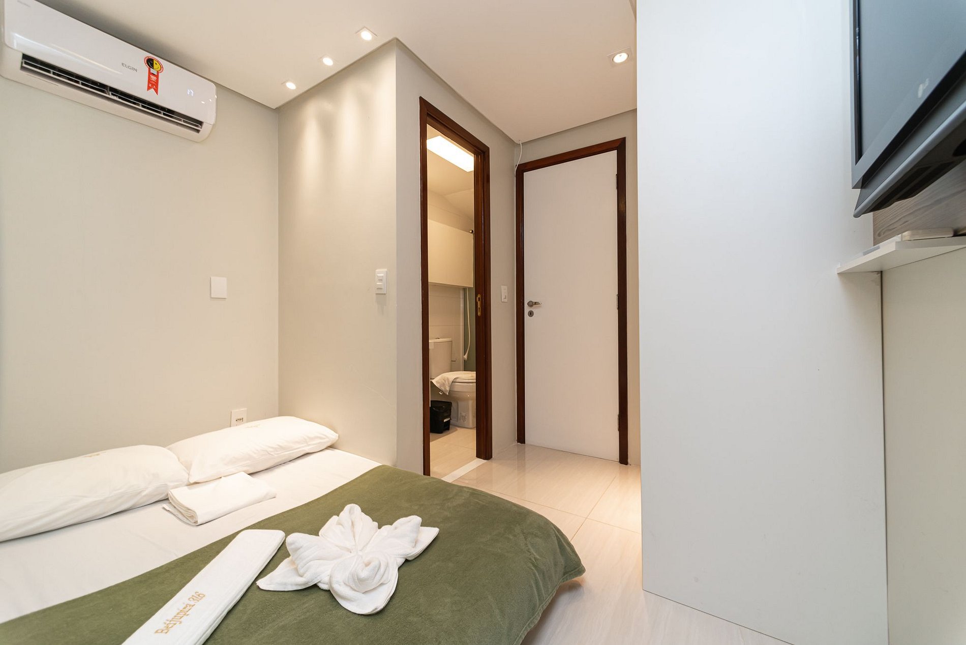 1 Quarto dividido em dois ambientes com Cama de Casal em ambos os espaços, 2 banheiros, cozinha equipada, Varanda Gourmet com Cervejeira e Grill, Sala Reversível com sofá cama casal, TV e Ar.