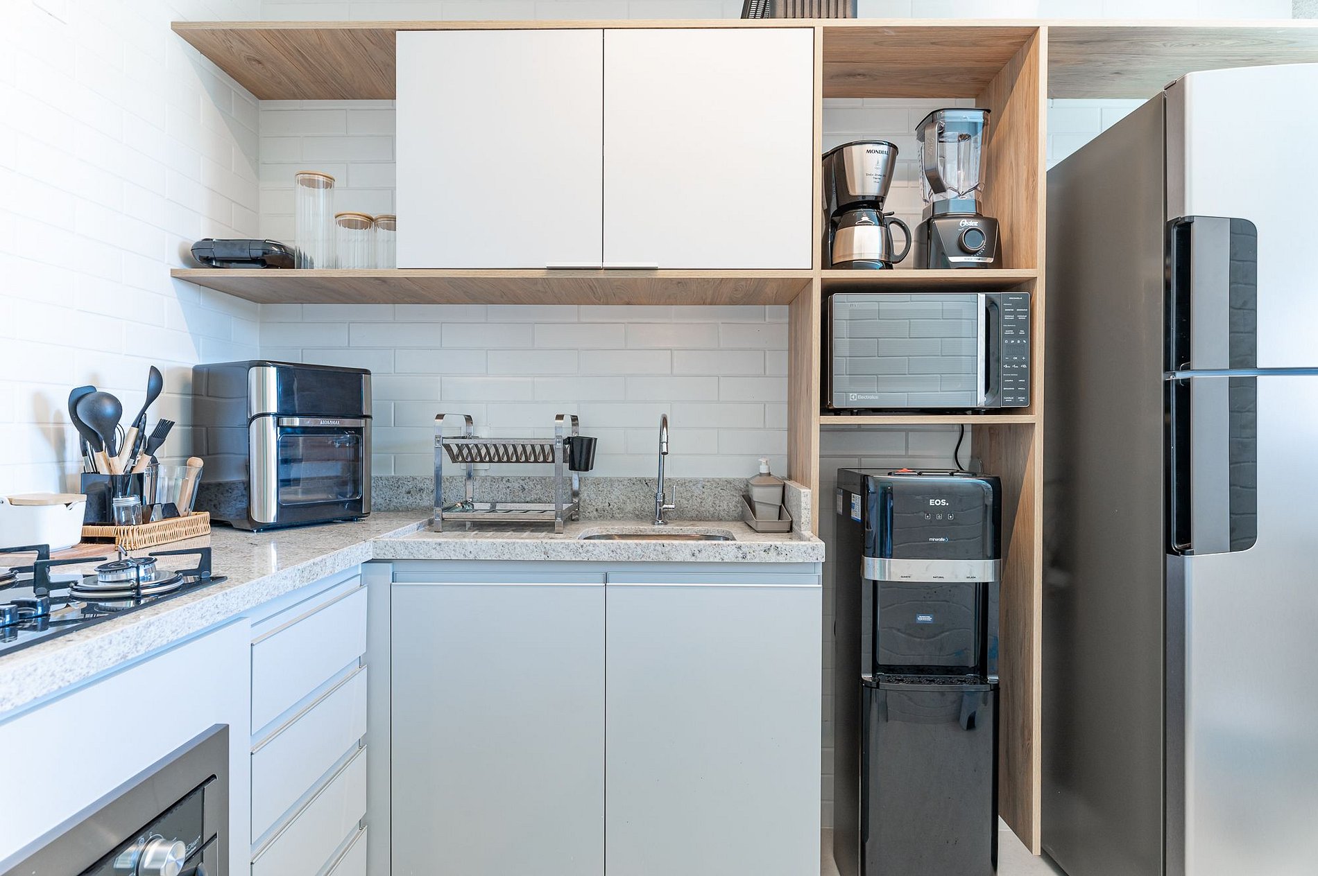 Cozinha completa com utensílios, geladeira, micro-ondas.