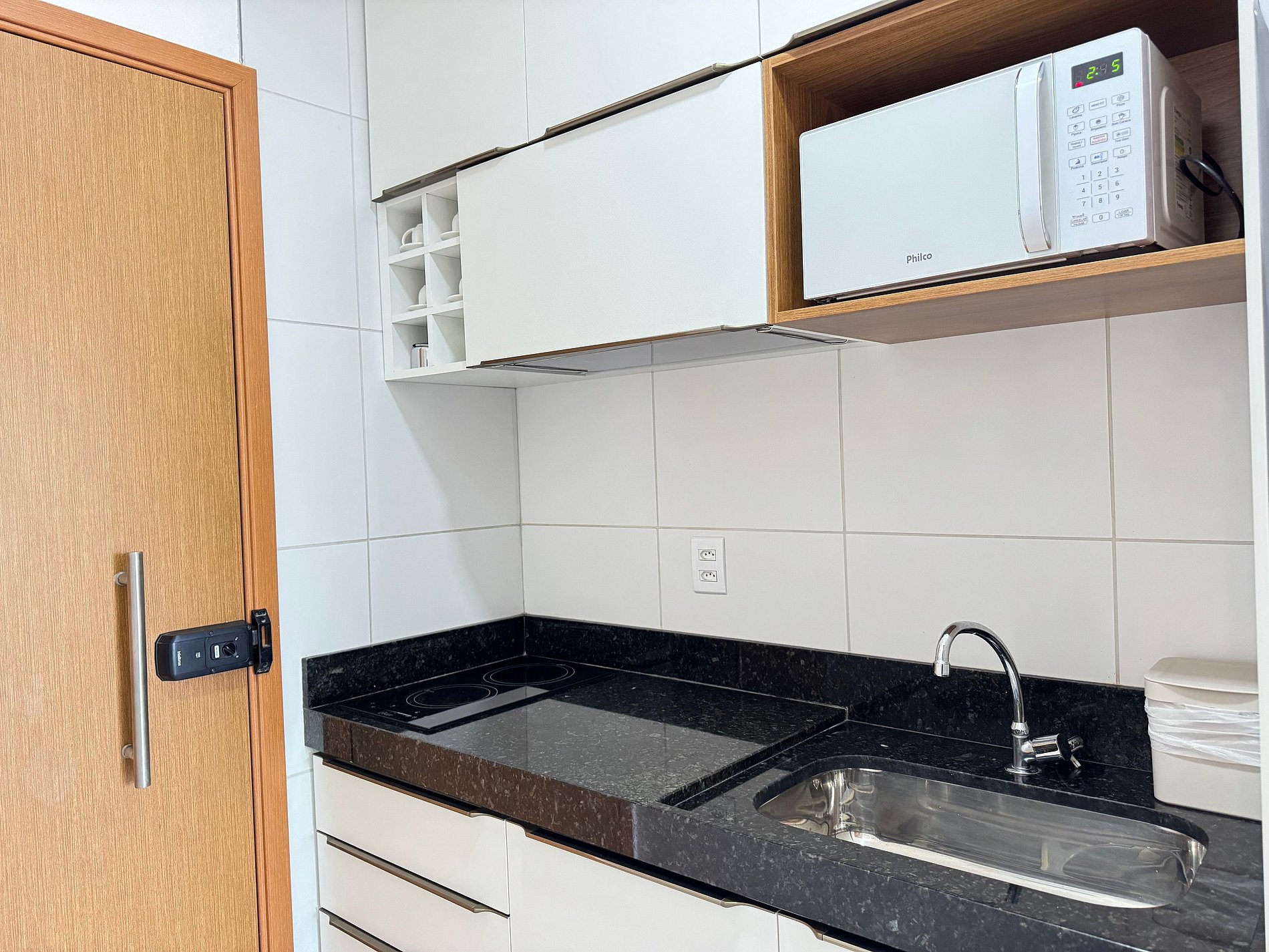 O apartamento tem 26m2, uma suíte completa com Smart TV 50", Arcondicionado 19mil Btus, Geladeira, Fogão Indução 2 bocas, Forno Microondas, Cama Casal mais sofá cama casal.