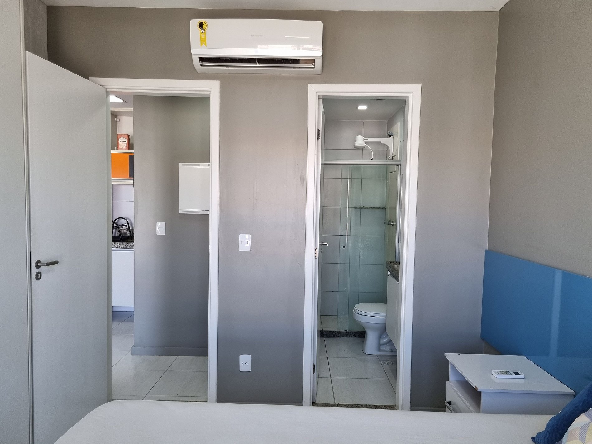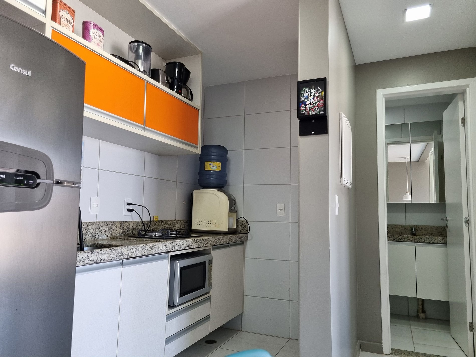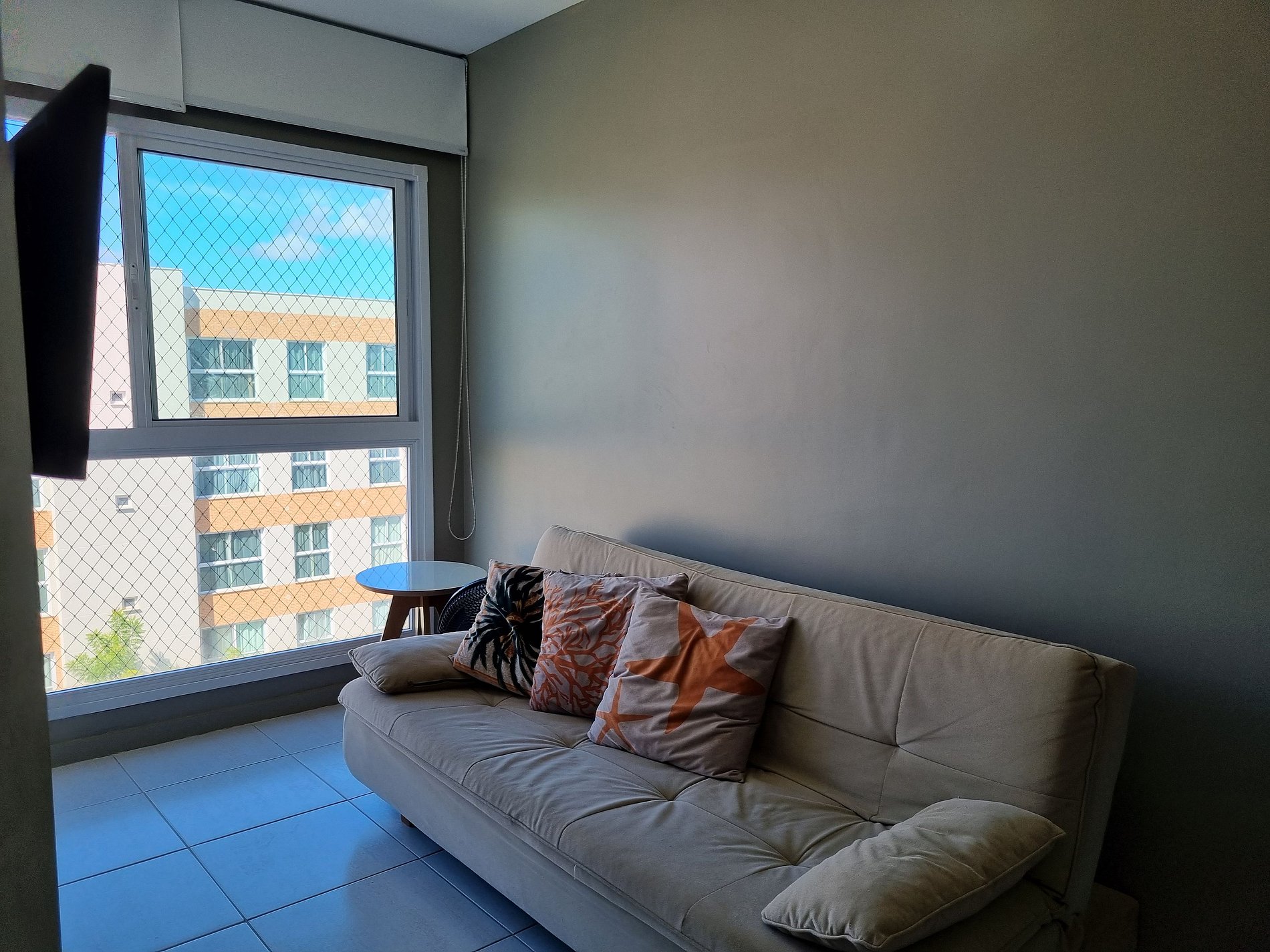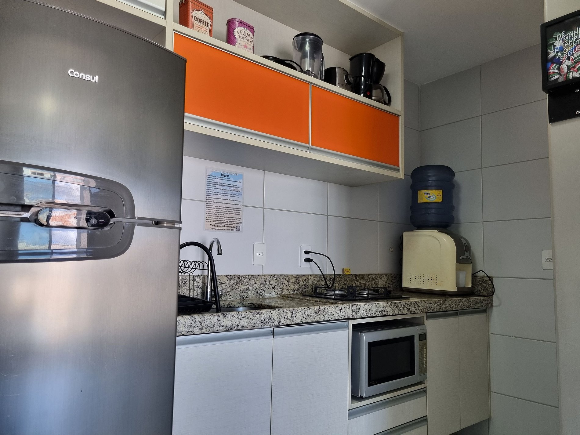 O Apartamento tem 1 Quarto com cama de casal e outra com cama de solteiro auxiliar (puxa em baixo), 1 Wc, Sala com sofá cama, tv, mesa de jantar e cadeiras, Cozinha completa, Vista para o empreendimento. Conte com Ar condicionado, TV, Internet, roupa de cama e banho e utensílios e eletros básicos.