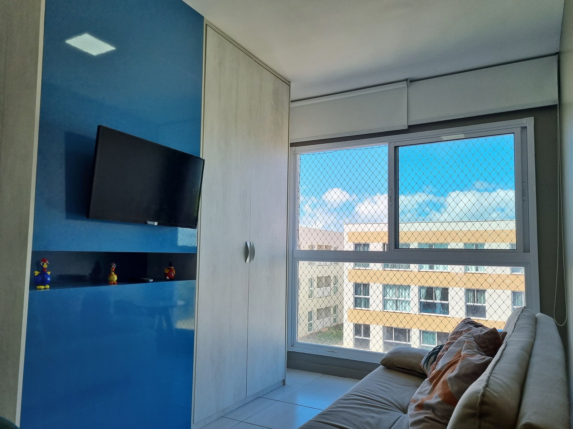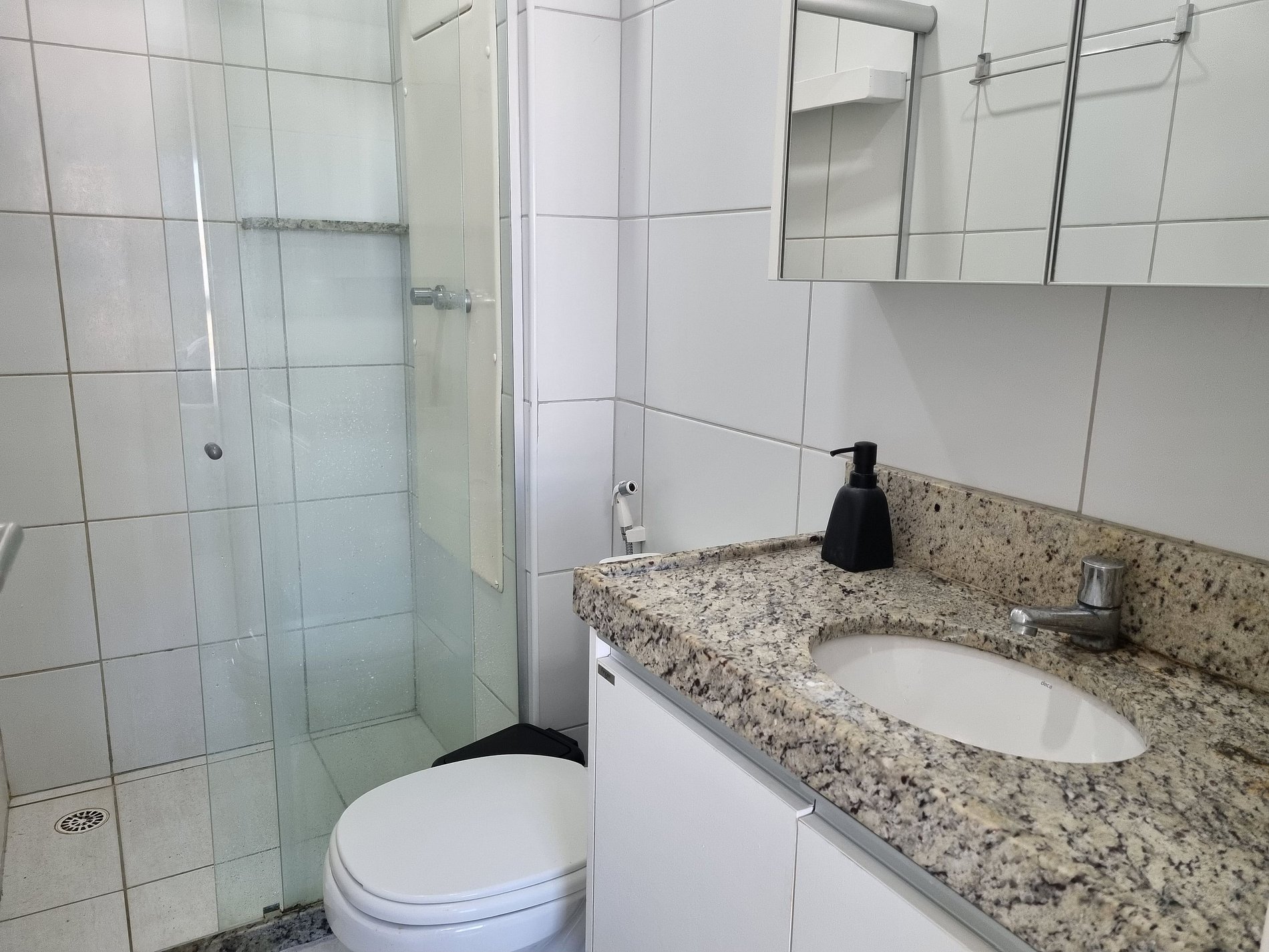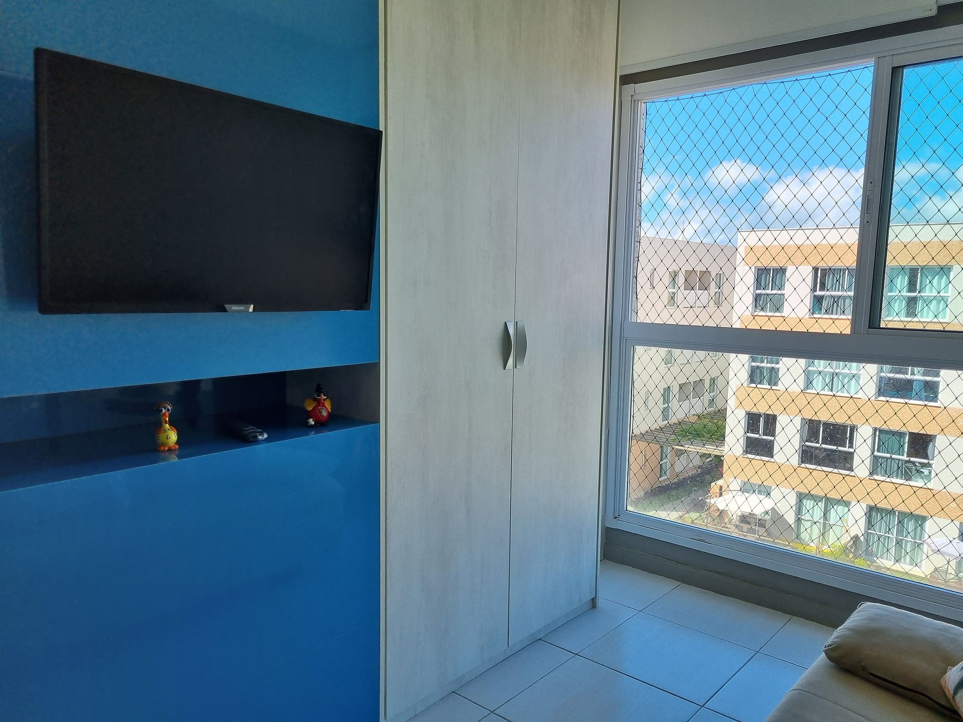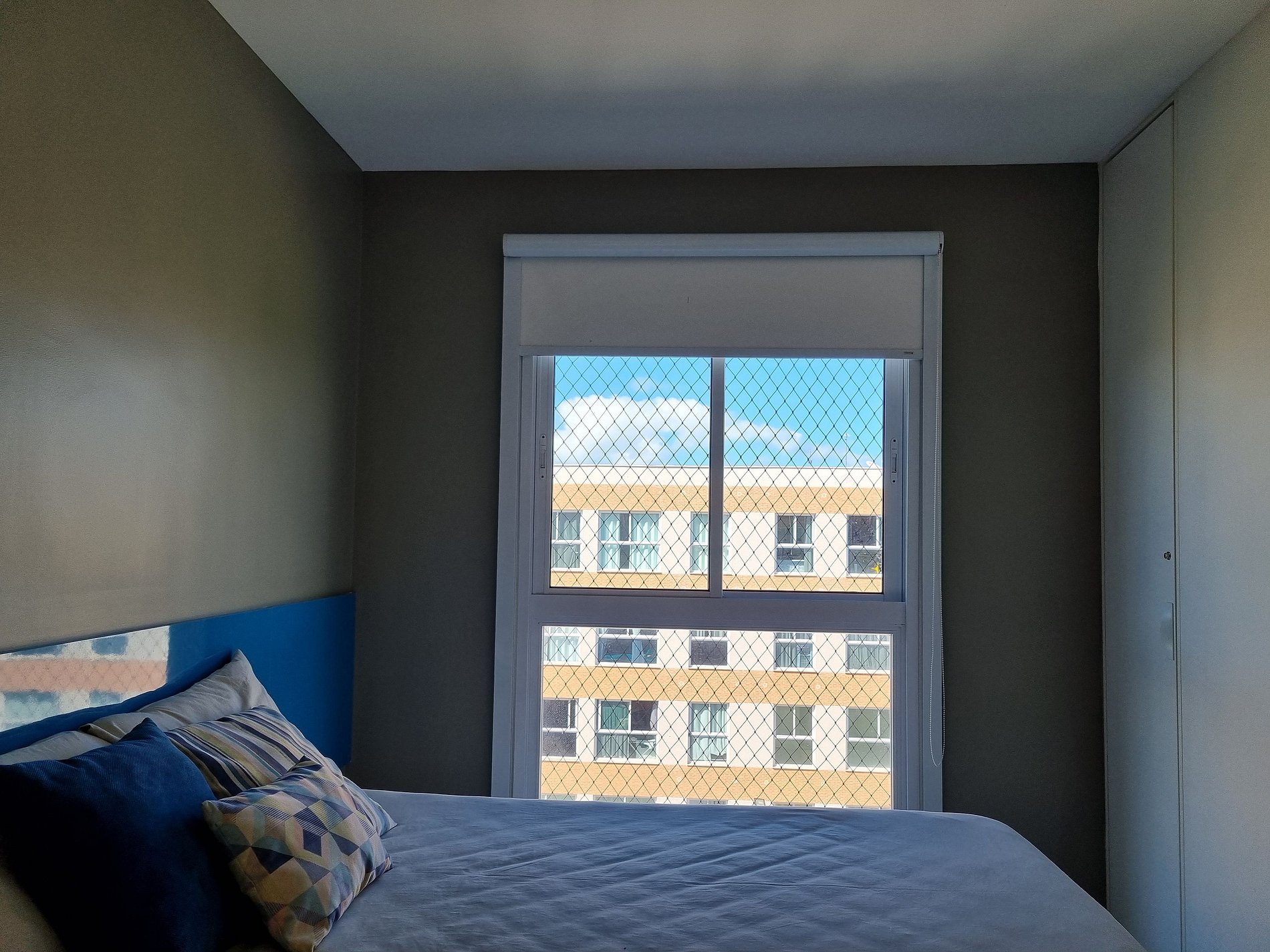 O Apartamento tem 1 Quarto com cama de casal e outra com cama de solteiro auxiliar (puxa em baixo), 1 Wc, Sala com sofá cama, tv, mesa de jantar e cadeiras, Cozinha completa, Vista para o empreendimento. Conte com Ar condicionado, TV, Internet, roupa de cama e banho e utensílios e eletros básicos.