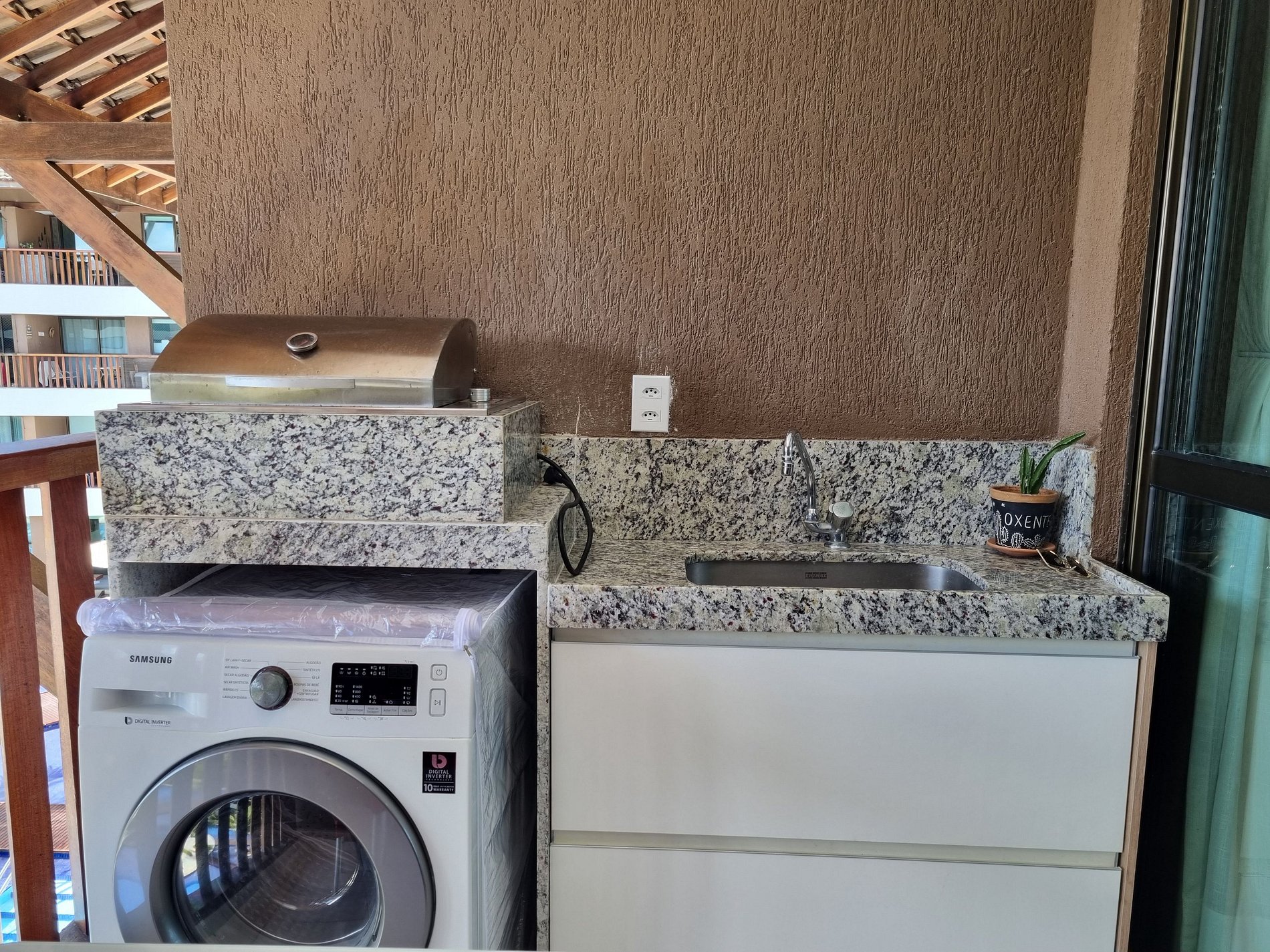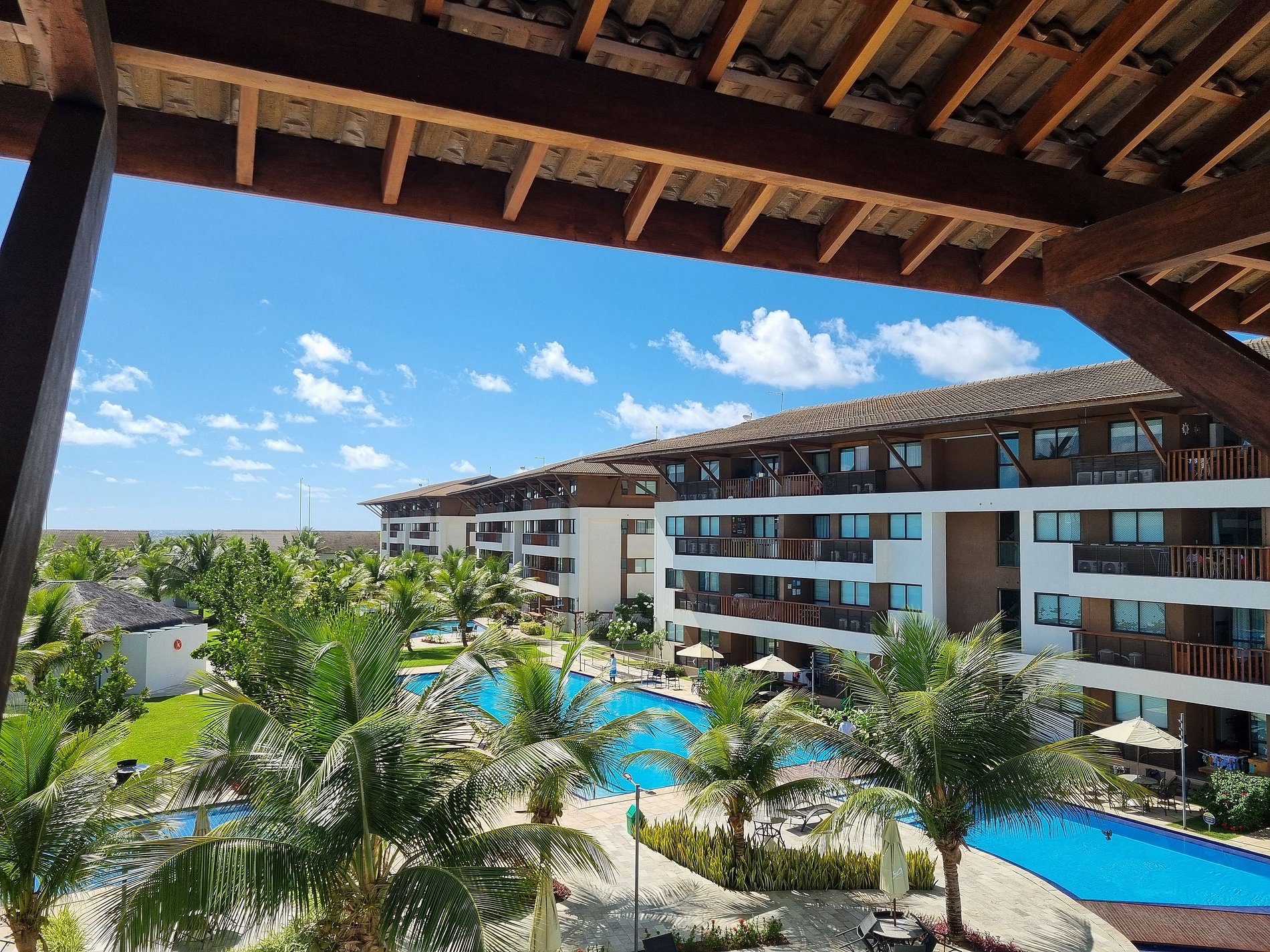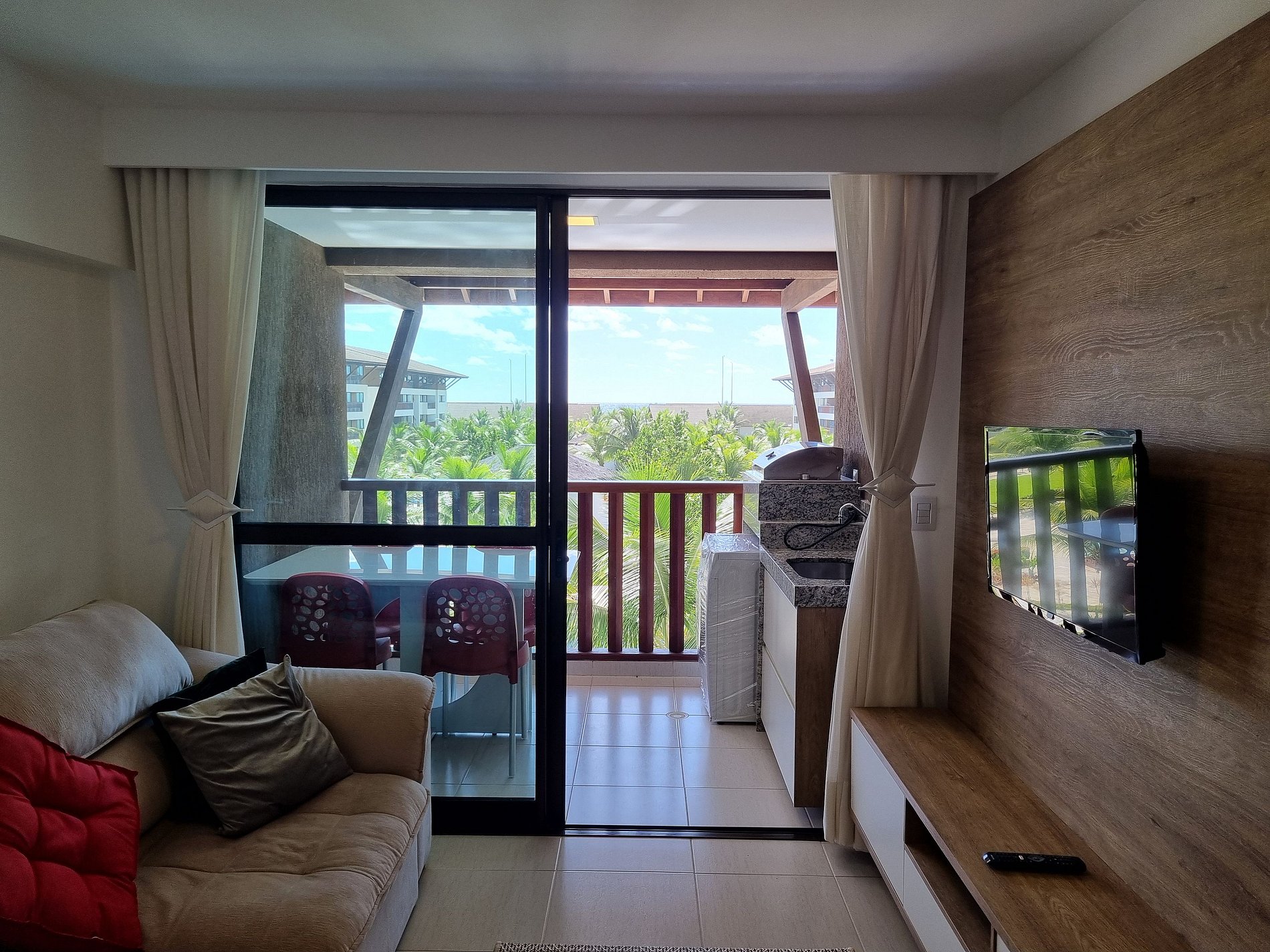 - Varanda com vista para piscinas e pequena vista pro Mar, com Churrasqueira;