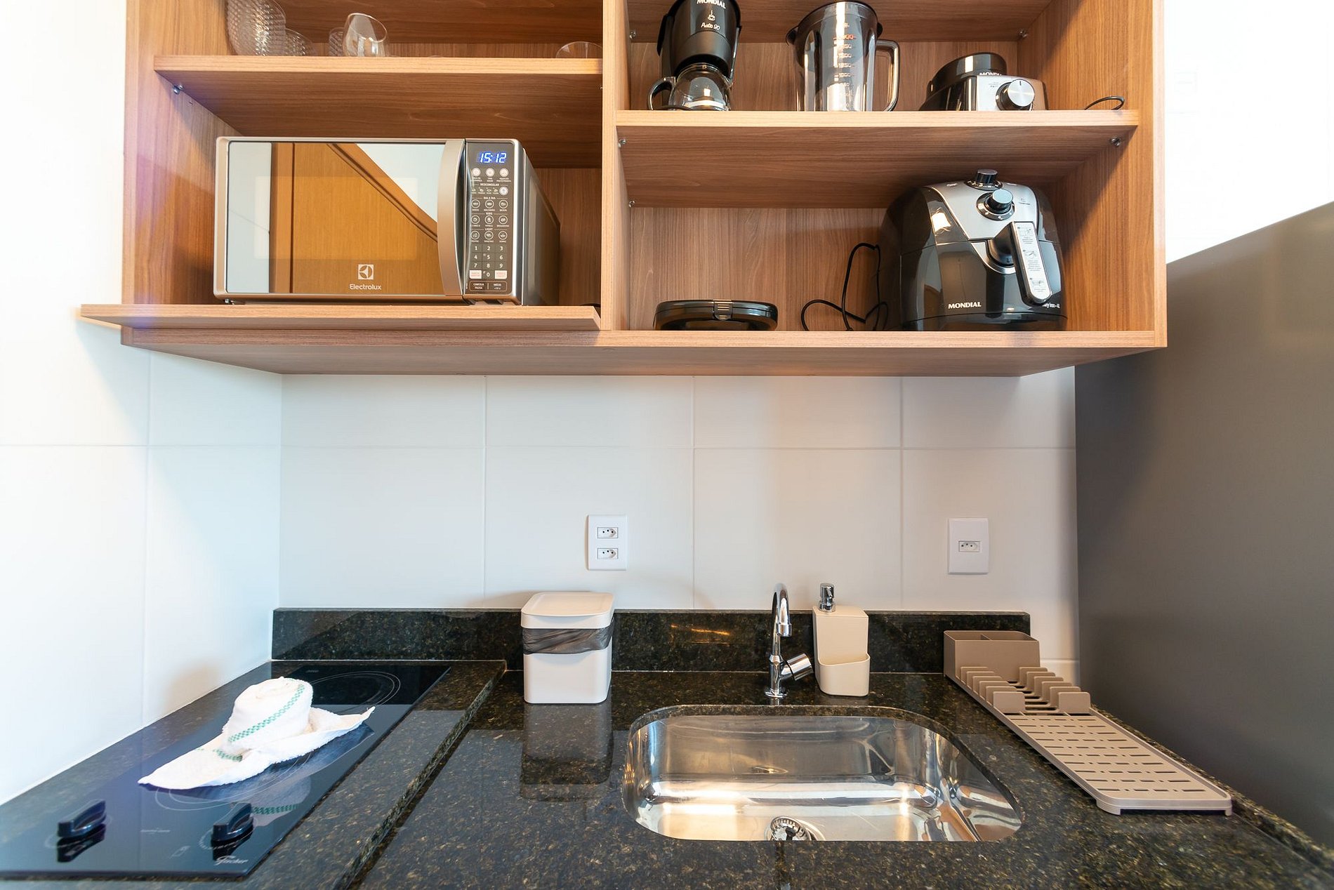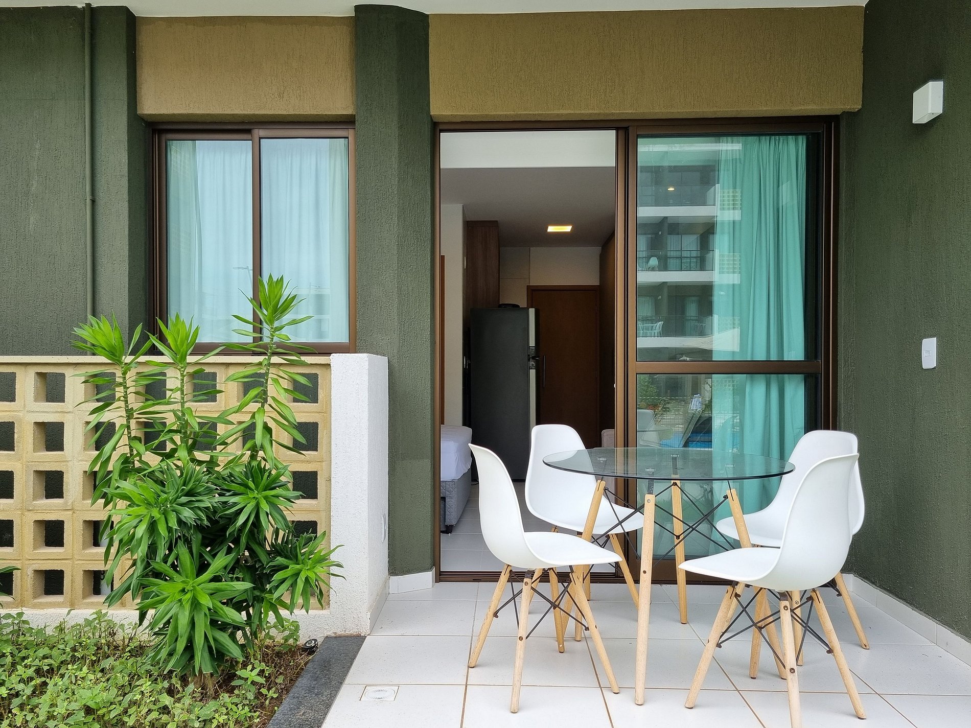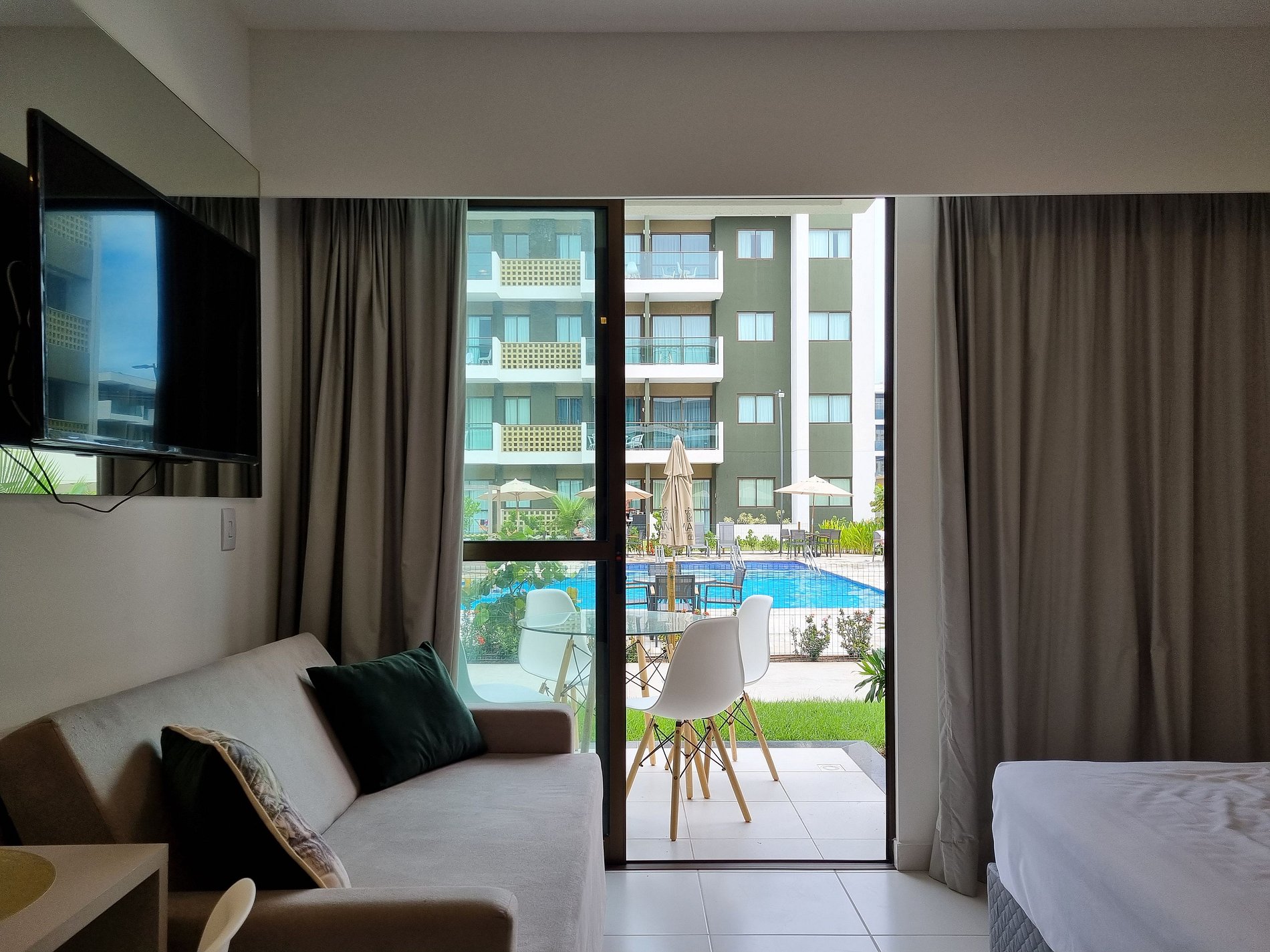 O apartamento térreo frente para piscina tem 26m2, uma suíte completa com Smart TV 50", Arcondicionado 19mil Btus, Geladeira, Fogão Elétrico 2 bocas, Forno Microondas, Cama Casal mais sofá cama casal.