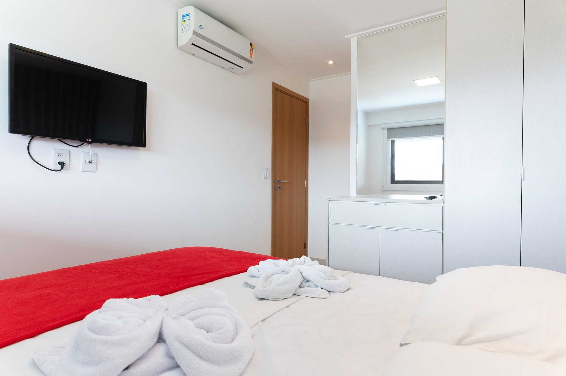 O Apartamento tem 2 Quartos sendo uma suíte, 2 Wc, Sala com sofá, tv, mesa e cadeiras, Cozinha completa, Varanda com Vista para o Piscinas e Mar. Conte com Ar condicionado, TV, Internet, roupa de cama e banho e utensílios e eletros básicos.