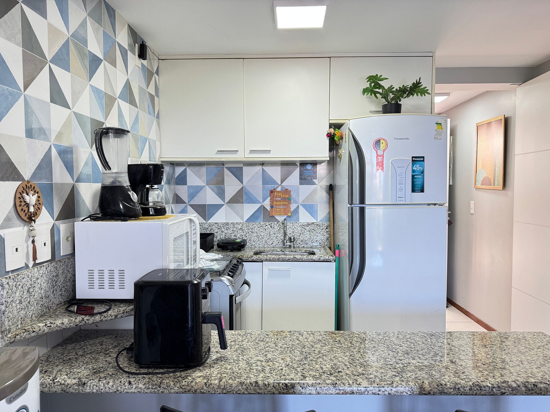 No mais, você vai encontrar 2 banheiros, mesa para jantar, sala de estar com TV, sofá e cadeiras, varanda com mesas, cadeiras. Na cozinha você tem tudo que precisa: geladeira, micro-ondas, fogão, forno, jogo de prato, talheres, copos, xícaras, taças, e panelas, abridor de vinho, gelágua e sanduicheira.