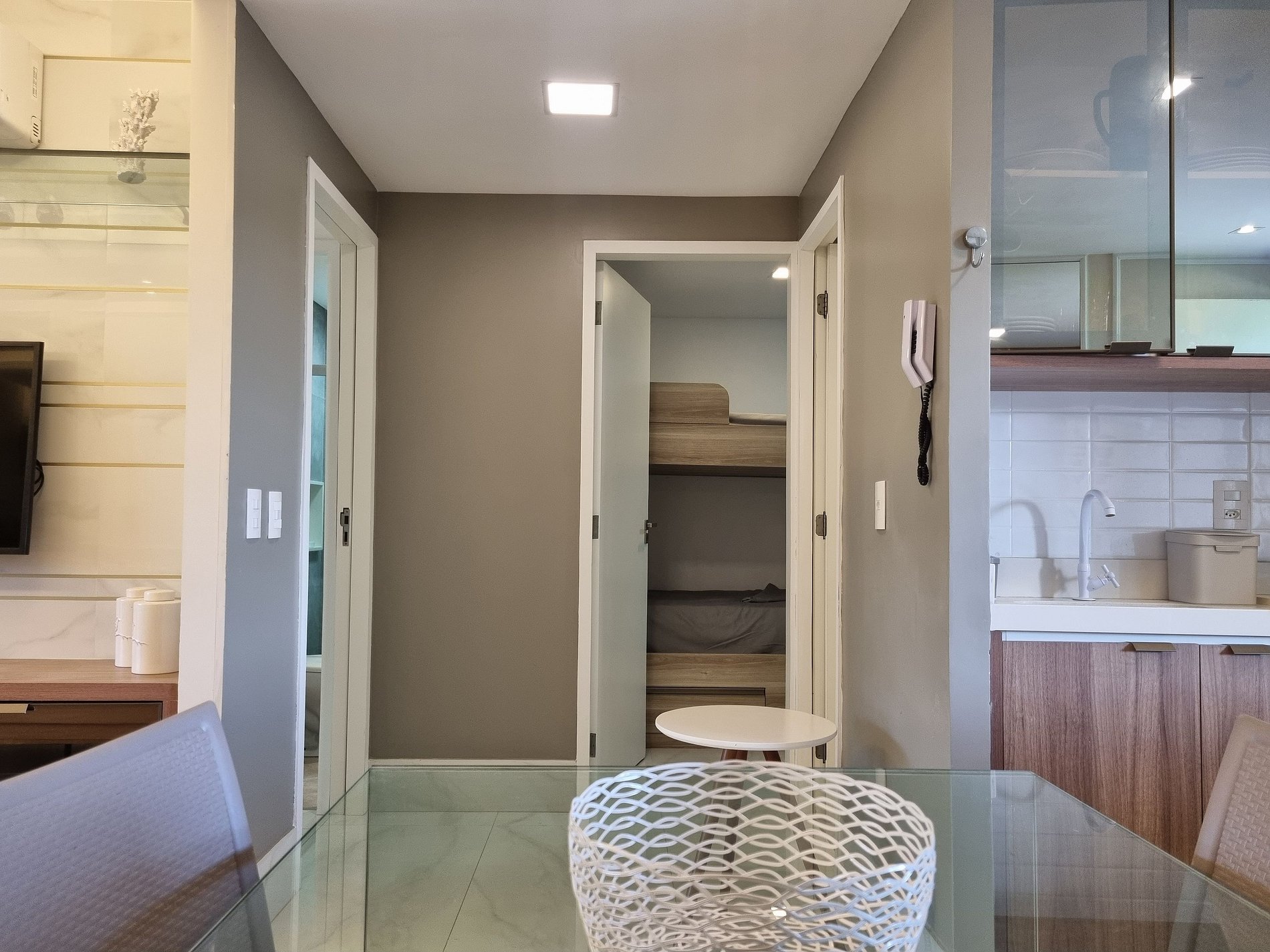 No mais, você vai encontrar 1 banheiro social, mesa para jantar, sala de estar com TV, sofá e cadeiras, varanda com mesas, cadeiras. Na cozinha você tem tudo que precisa: geladeira, micro-ondas, Airfry, fogão, forno, jogo de prato, talheres, copos, xícaras, taças, e panelas, abridor de vinho, gelágua e sanduicheira.