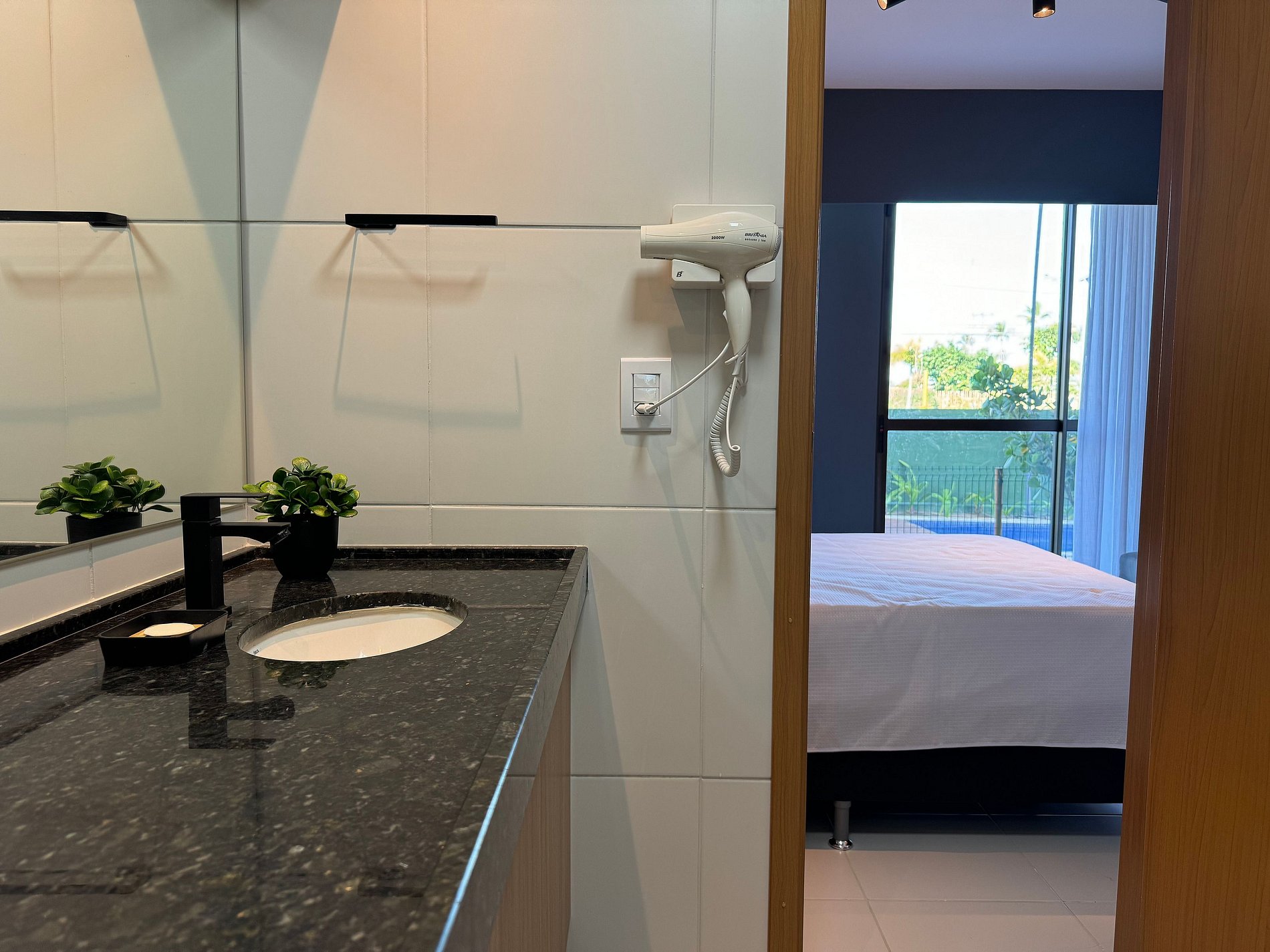 O apartamento tem 26m2, uma suíte completa com Smart TV 50", Arcondicionado 19mil Btus, Geladeira, Fogão Elétrico 2 bocas, Forno Microondas, Cama Casal, Cama Auxiliar Solteiro mais sofá cama.