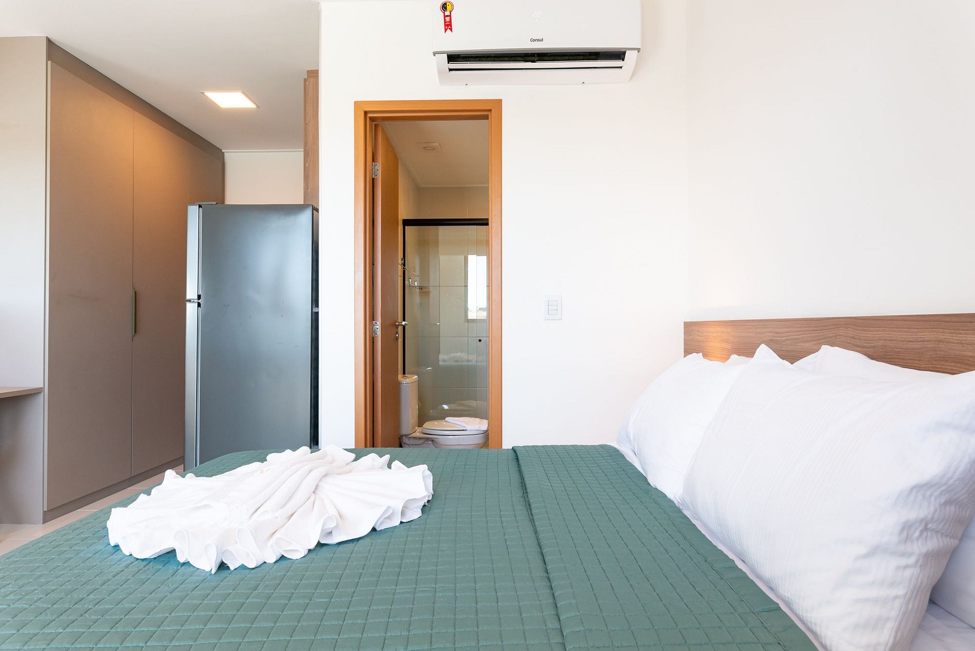O apartamento tem 26m2, uma suíte completa com Smart TV 50", Arcondicionado 19mil Btus, Geladeira, Fogão Elétrico 2 bocas, Forno Microondas, Cama Casal mais sofá cama casal.