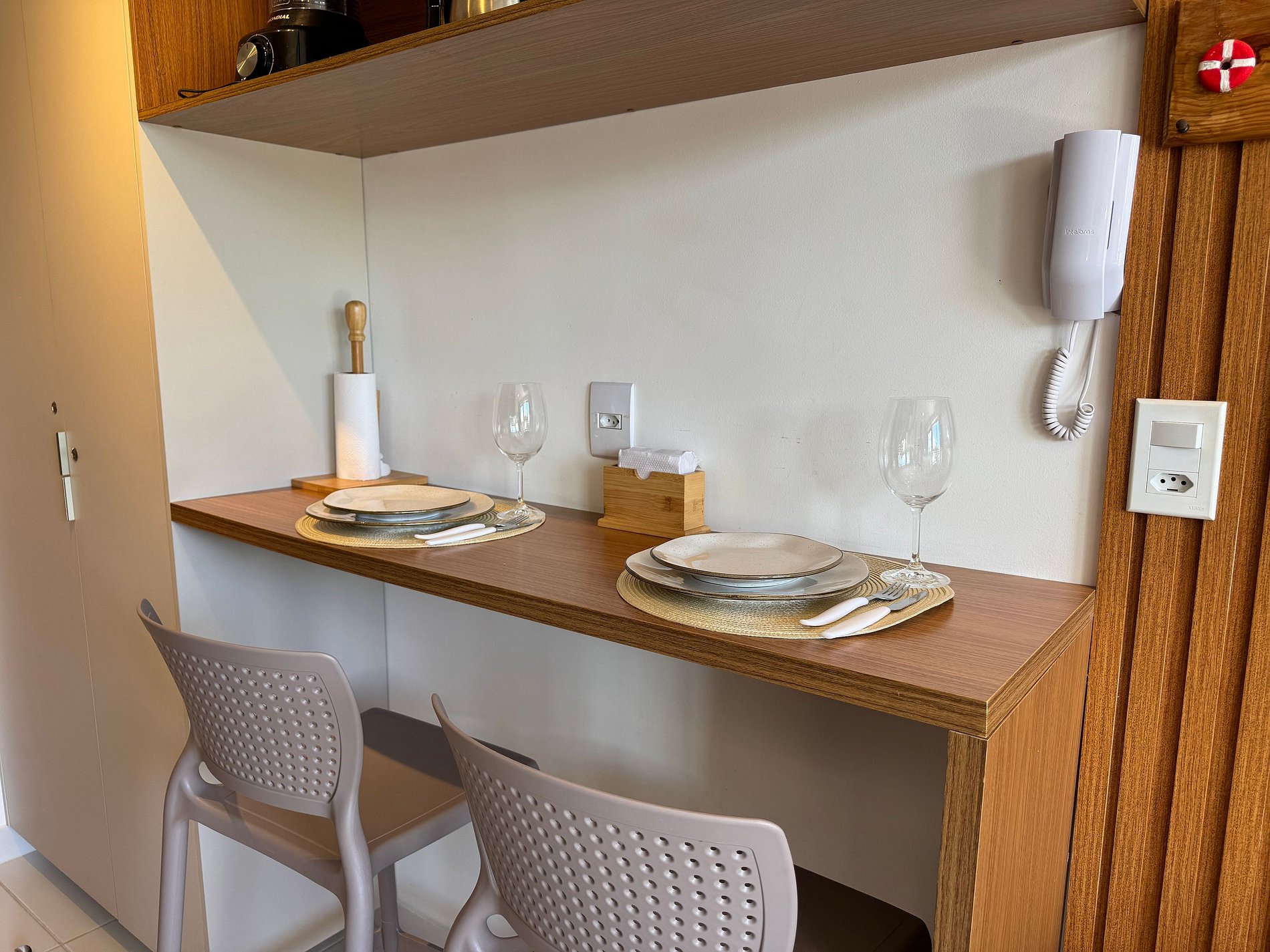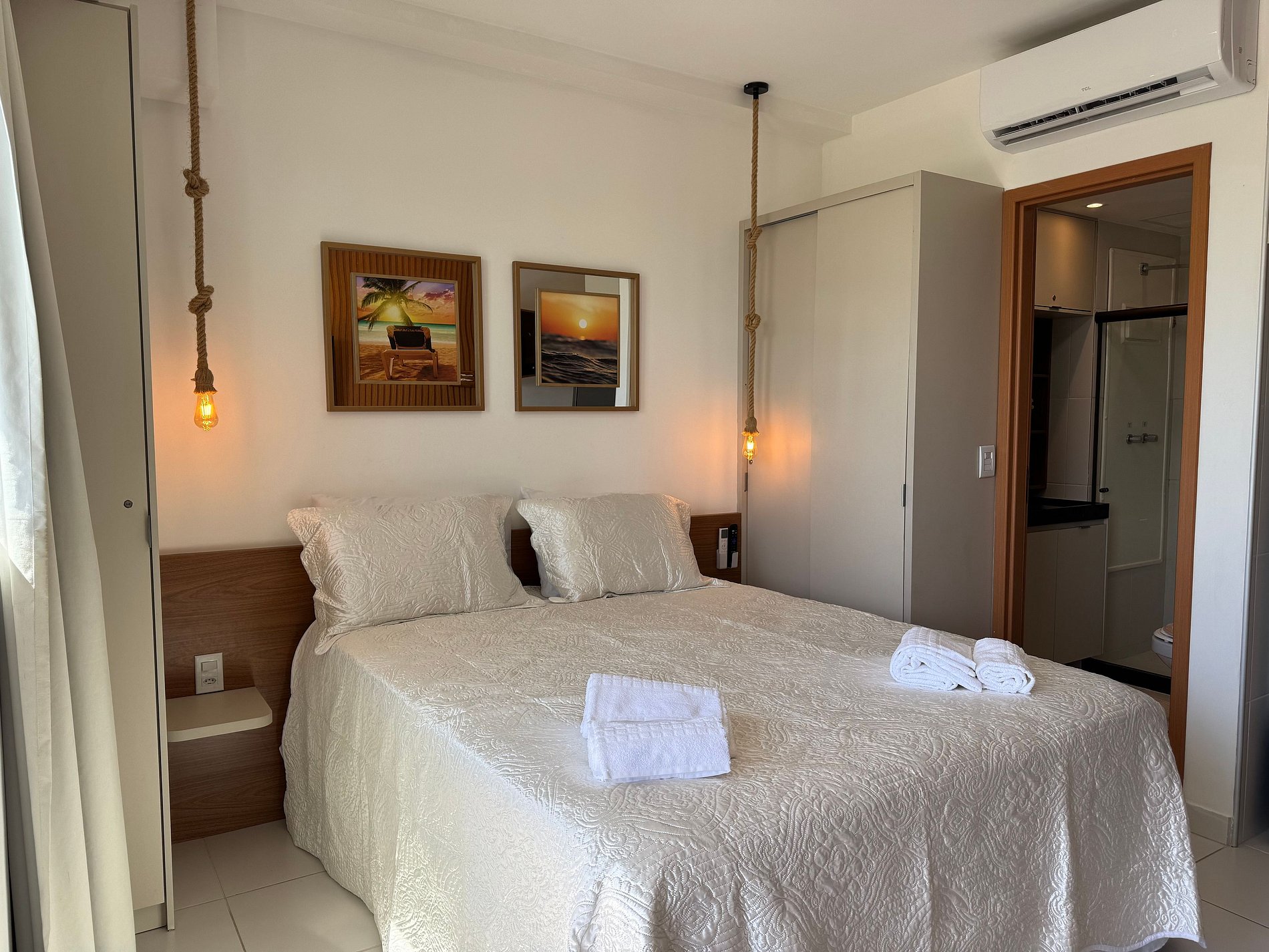 O apartamento tem 26m2, uma suíte completa com Smart TV 50", Arcondicionado 19mil Btus, Geladeira, Fogão Elétrico 2 bocas, Forno Microondas e Cama Casal.