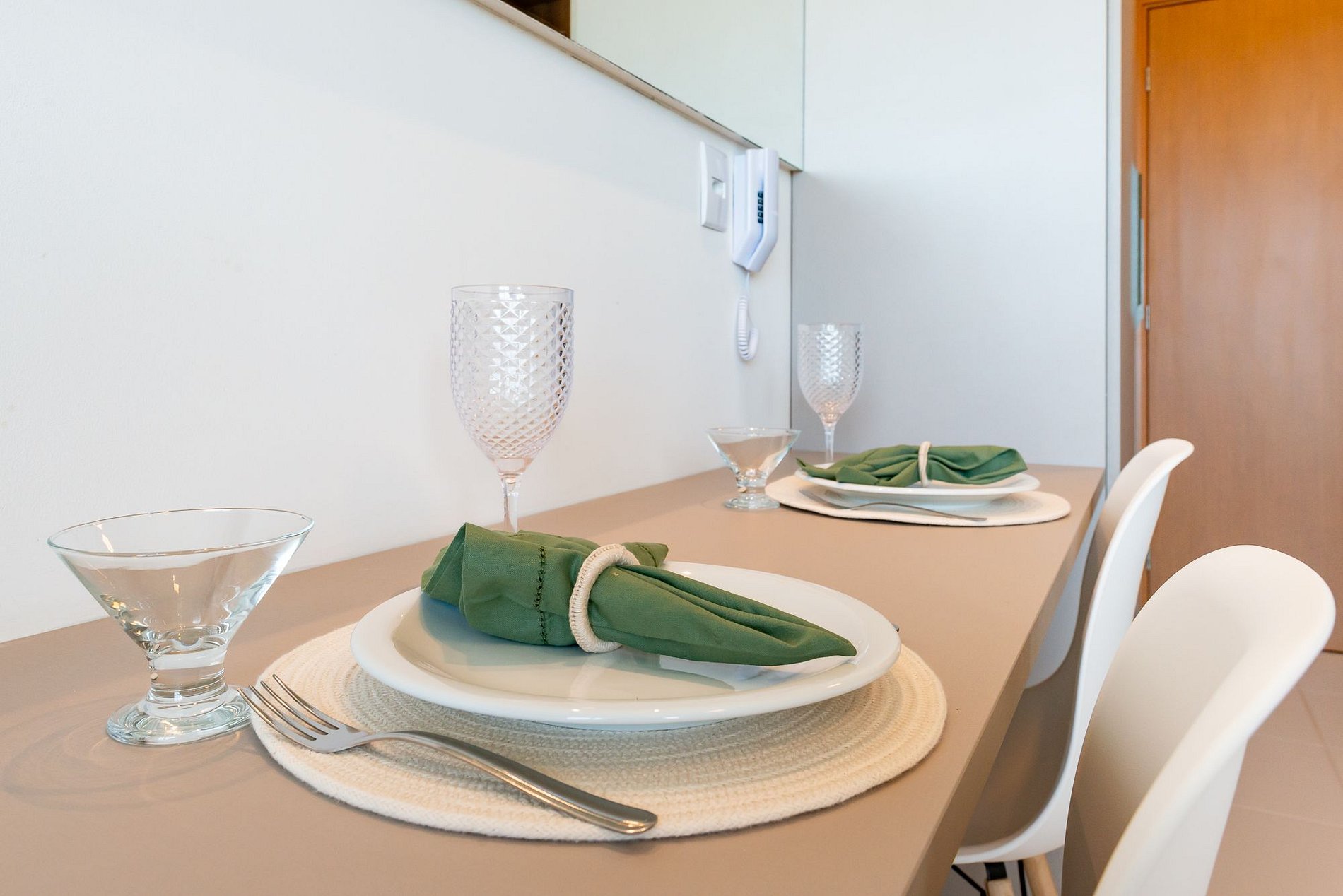 O apartamento tem 26m2, uma suíte completa com Smart TV 50", Arcondicionado 19mil Btus, Geladeira, Fogão Elétrico 2 bocas, Forno Microondas, Cama Casal mais sofá cama casal.
