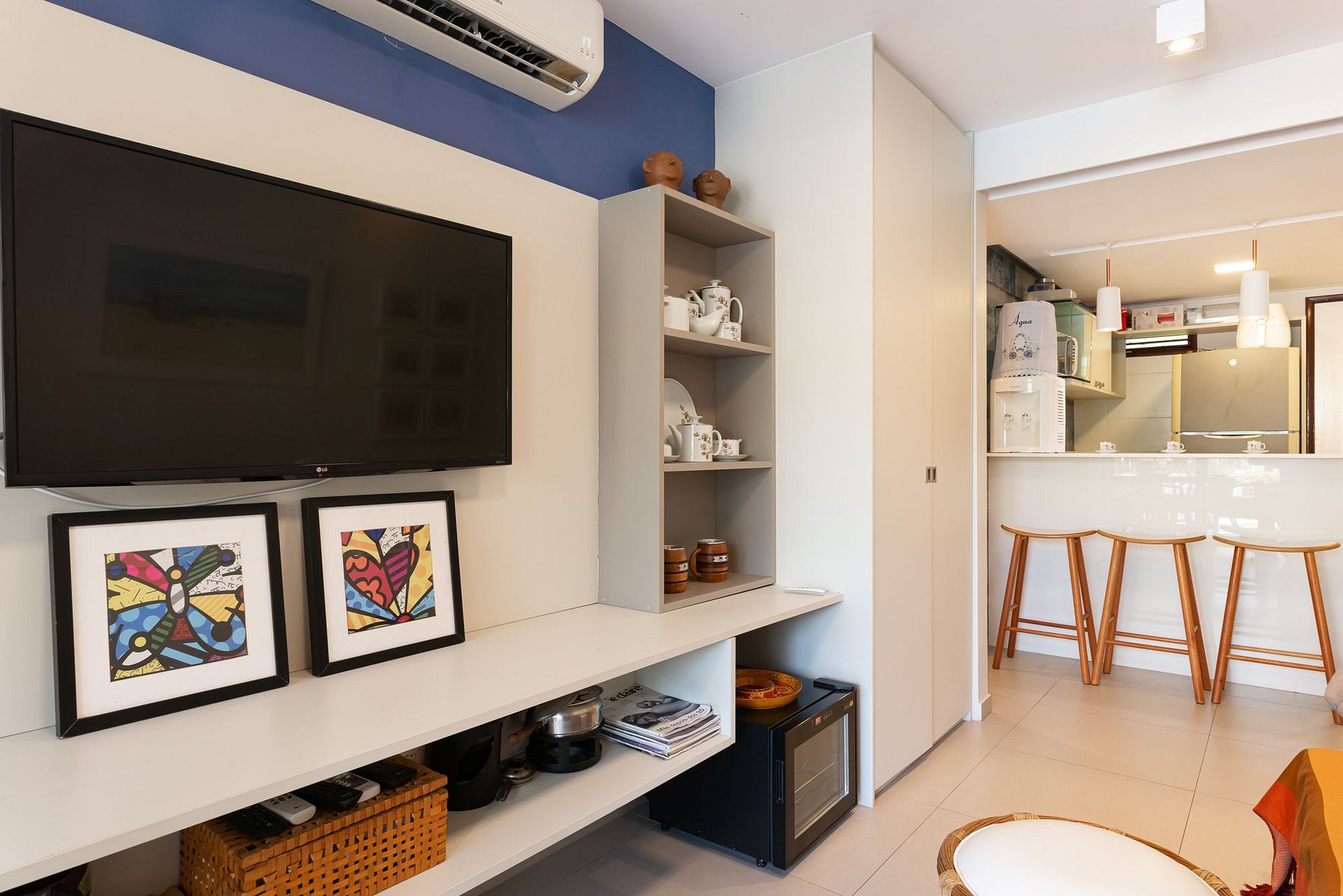 No mais, você vai encontrar 1 banheiro social, mesa para jantar, sala de estar com TV, sofá e cadeiras, varanda com churrasqueira carvão, mesa e cadeiras. Na cozinha você tem tudo que precisa: geladeira, micro-ondas, fogão, forno, jogo de prato, talheres, copos, xícaras, taças, e panelas, abridor de vinho e sanduicheira. Além de tudo isso ainda dispomos de Adega.