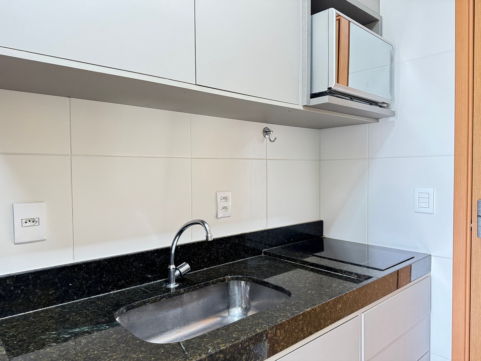O apartamento térreo frente para piscina tem 26m2, uma suíte completa com Smart TV 50", Arcondicionado 19mil Btus, Geladeira, Fogão Elétrico 2 bocas, Forno Microondas, Cama Casal mais sofá cama casal.