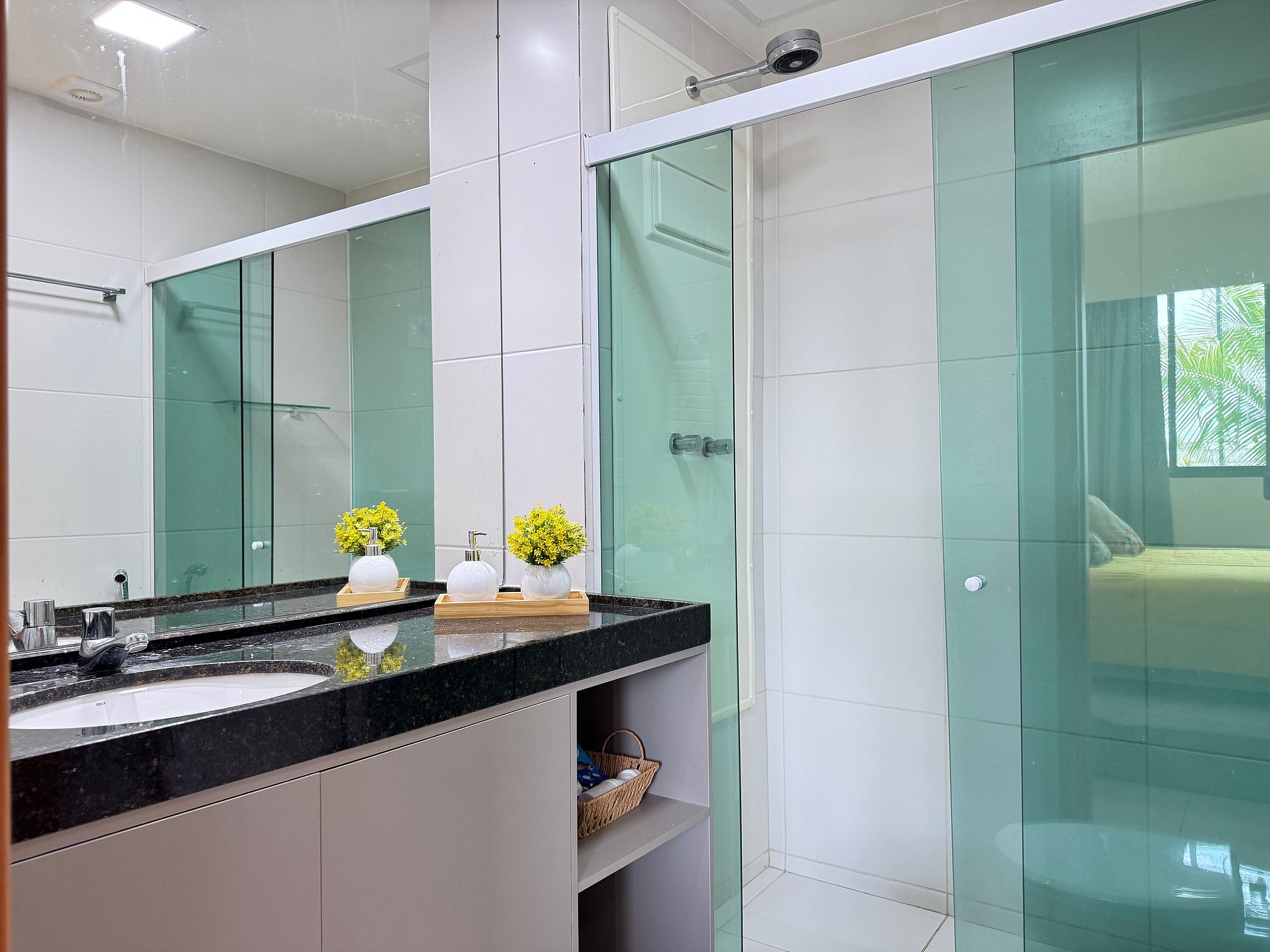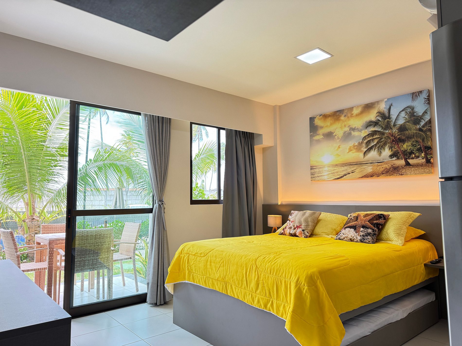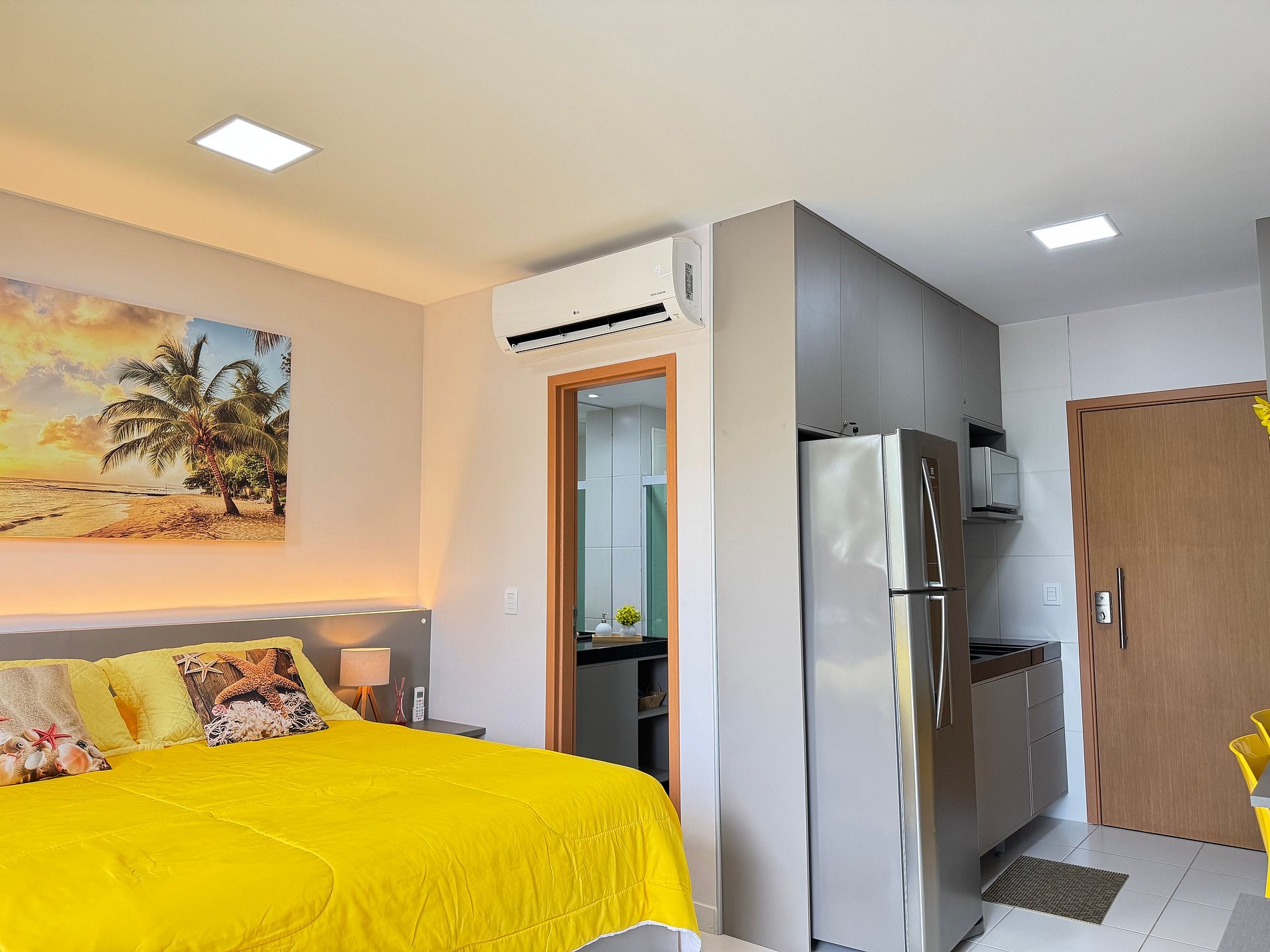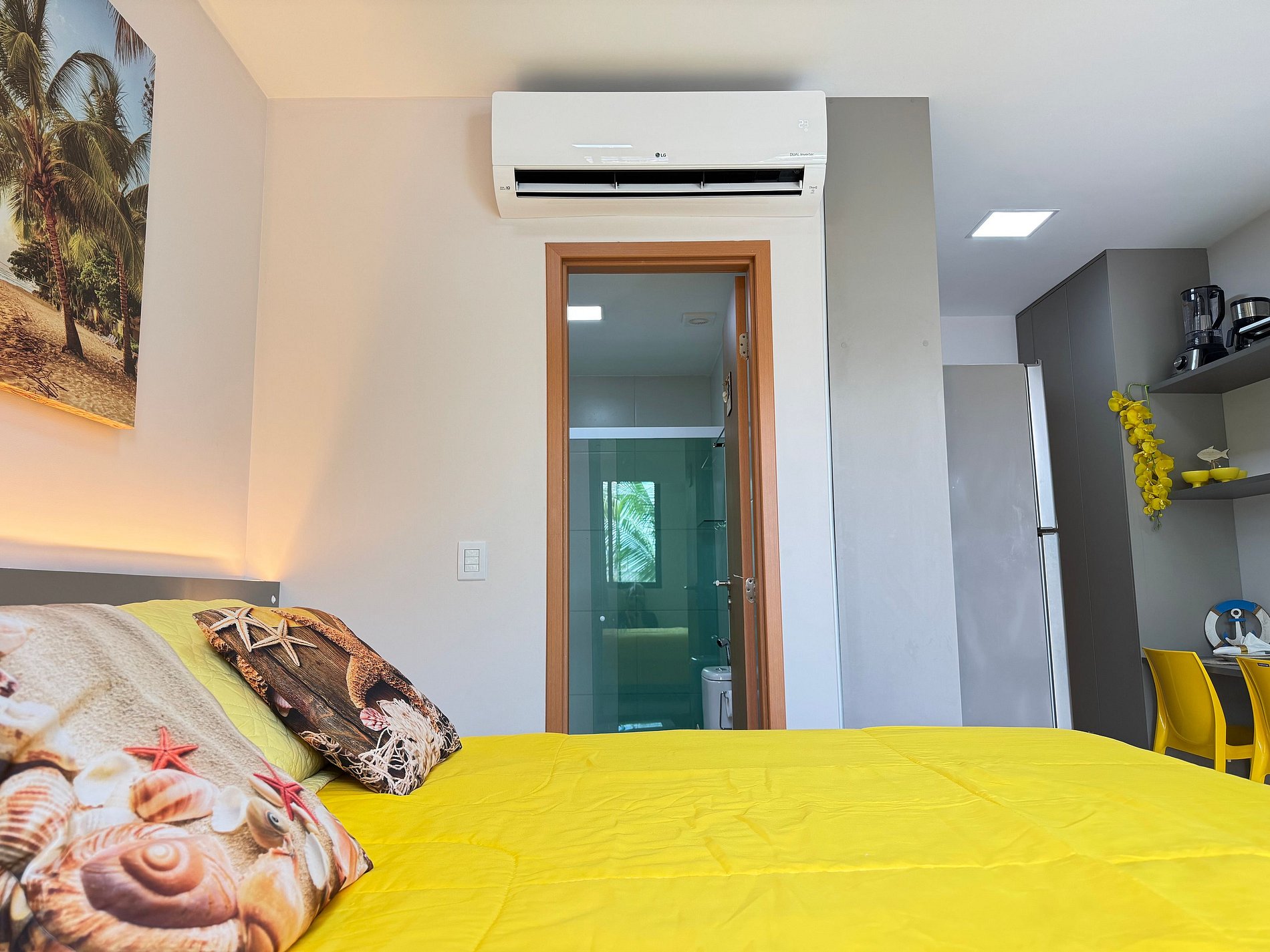 O apartamento térreo frente para piscina tem 26m2, uma suíte completa com Smart TV 50", Arcondicionado 19mil Btus, Geladeira, Fogão Elétrico 2 bocas, Forno Microondas, Cama Casal mais sofá cama casal.