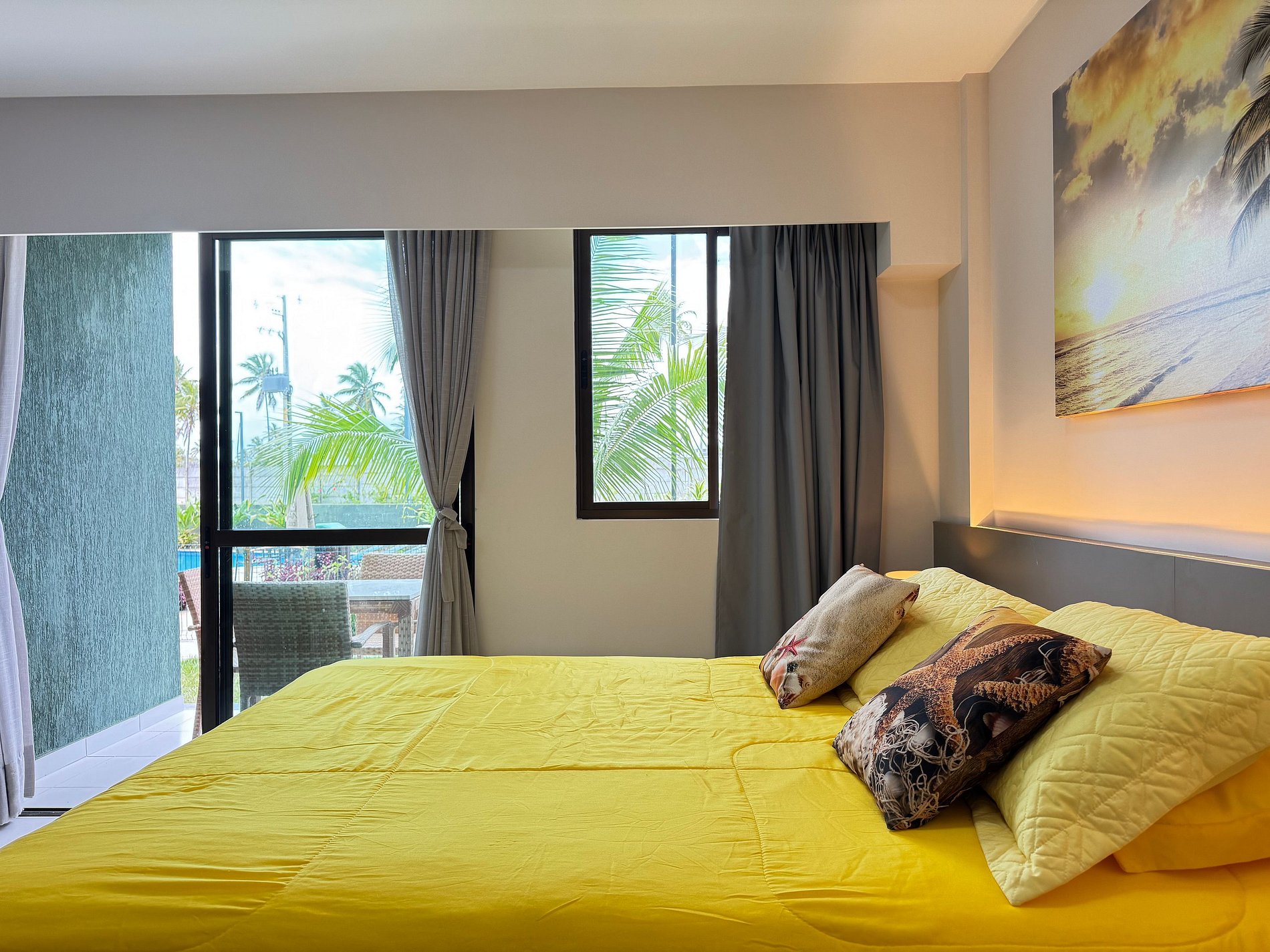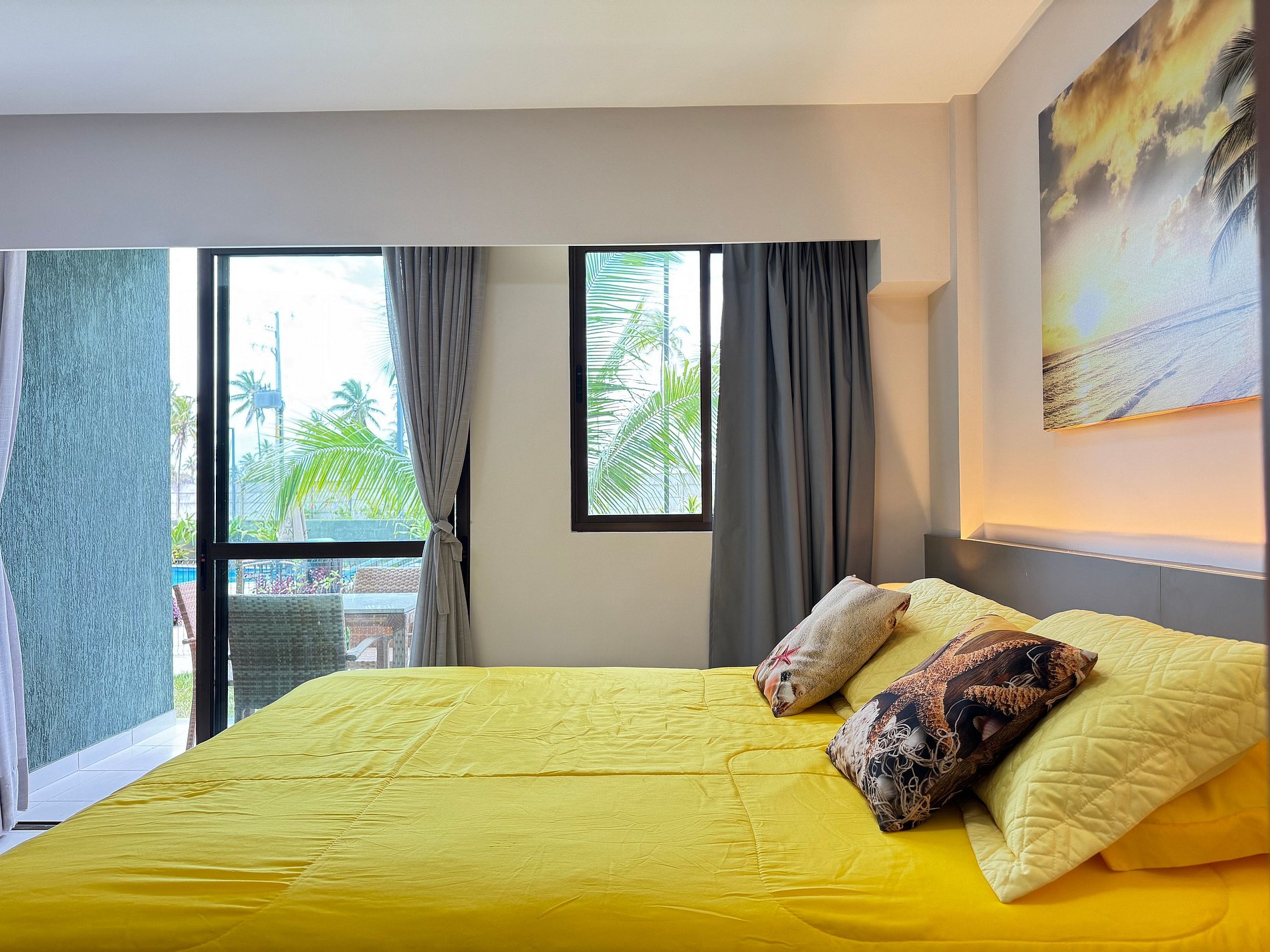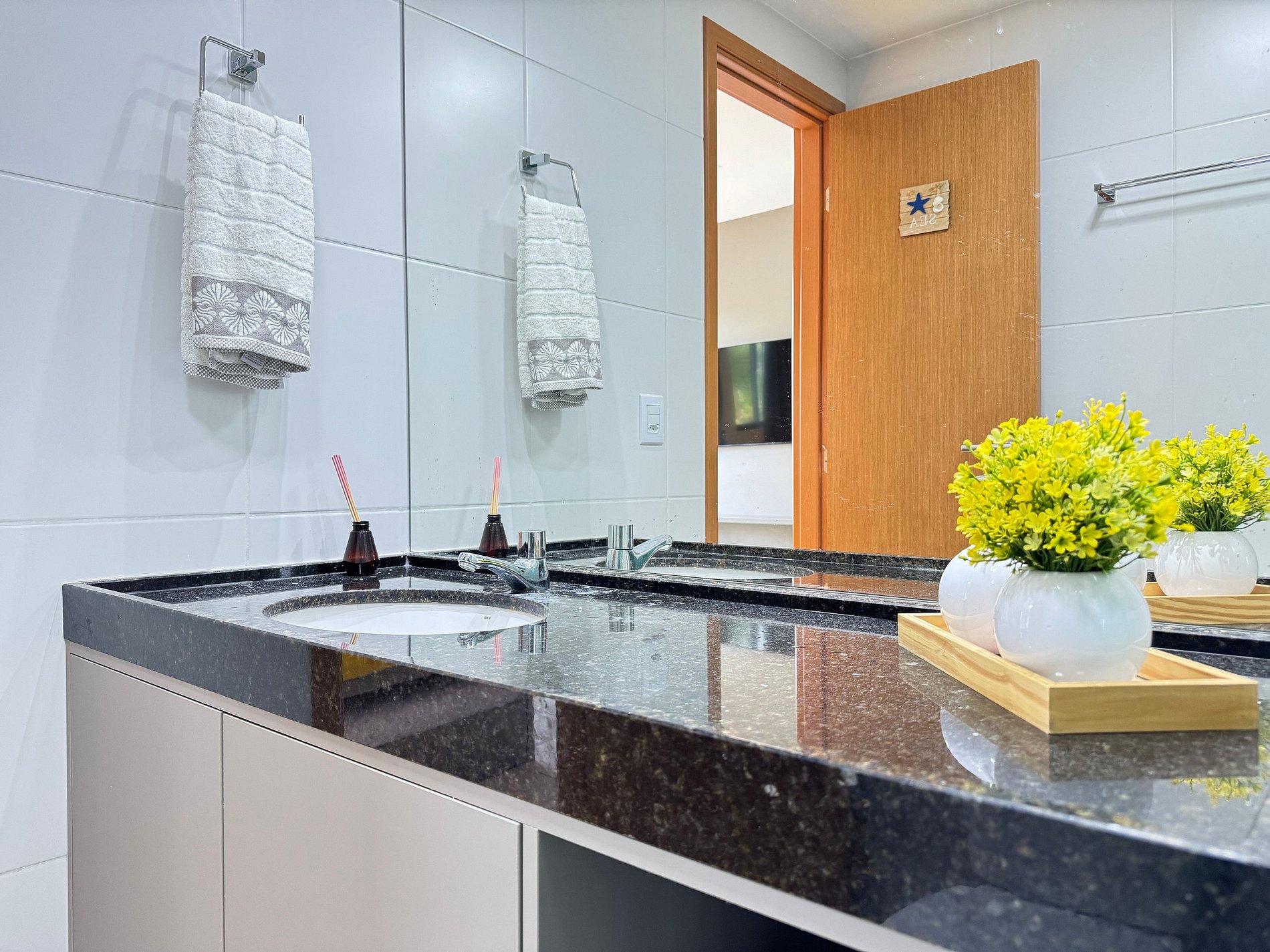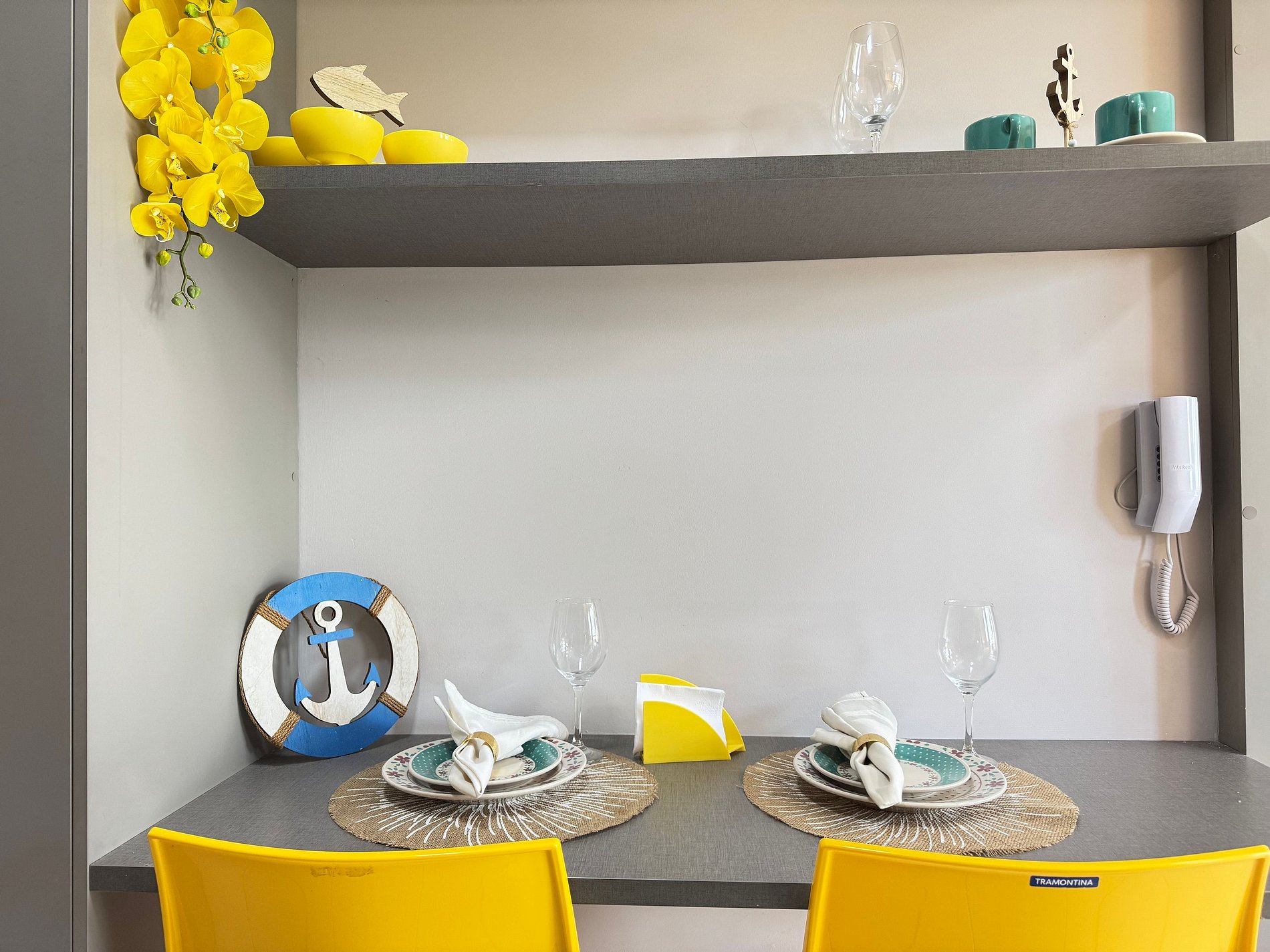 O apartamento térreo frente para piscina tem 26m2, uma suíte completa com Smart TV 50", Arcondicionado 19mil Btus, Geladeira, Fogão Elétrico 2 bocas, Forno Microondas, Cama Casal mais sofá cama casal.