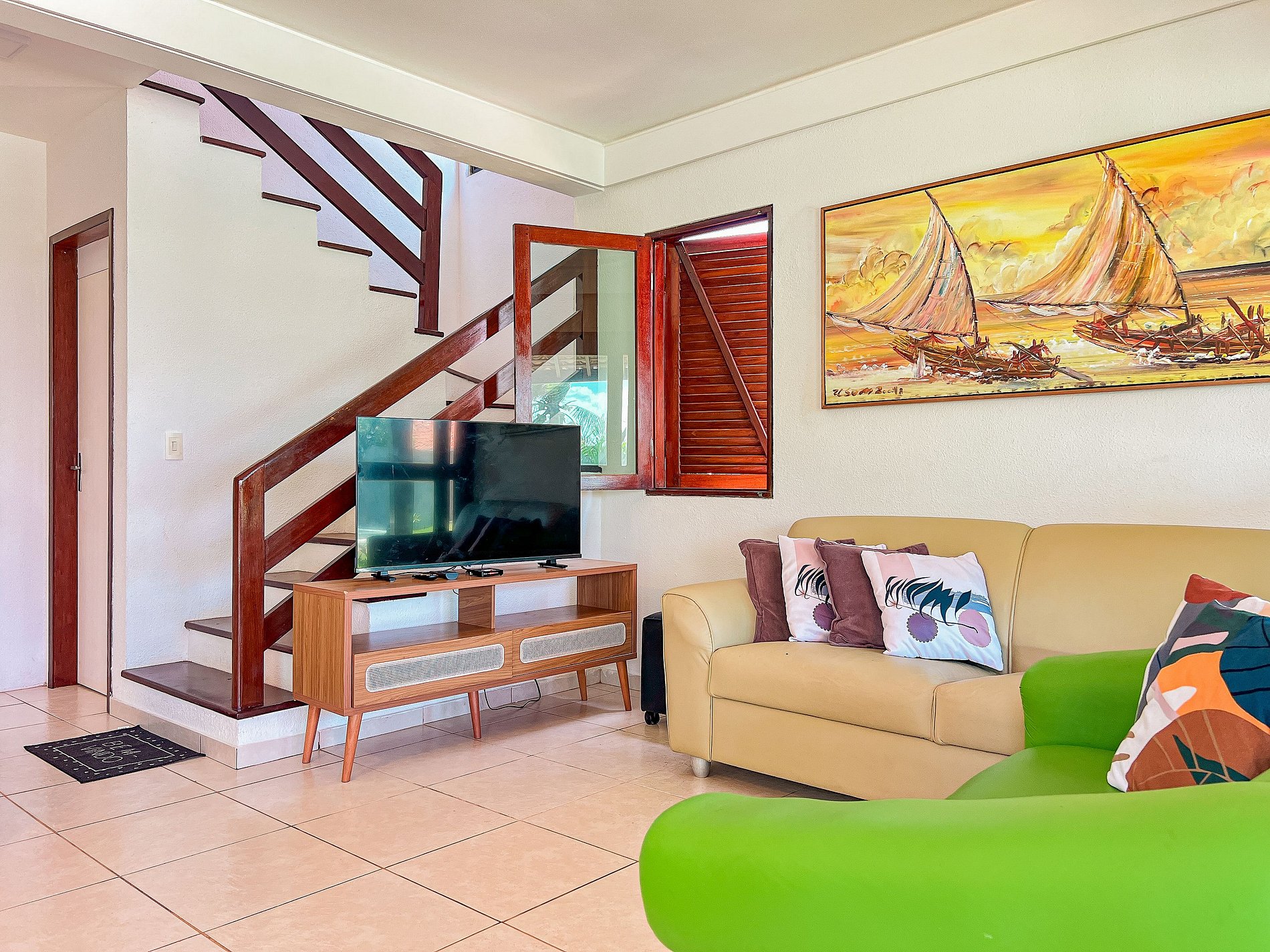 • Sala de estar com decoração aconchegante, sofá confortável e TV Smart.