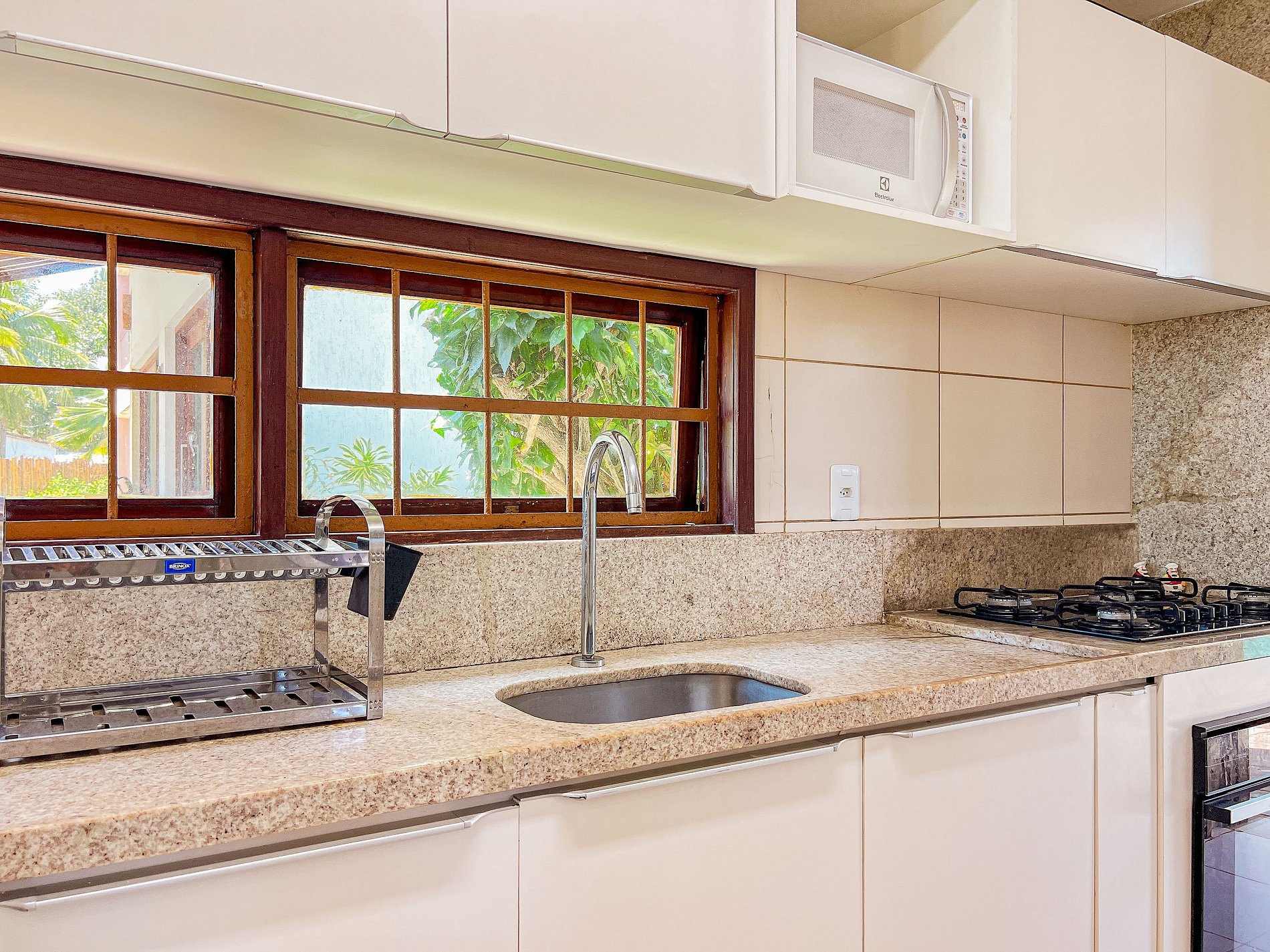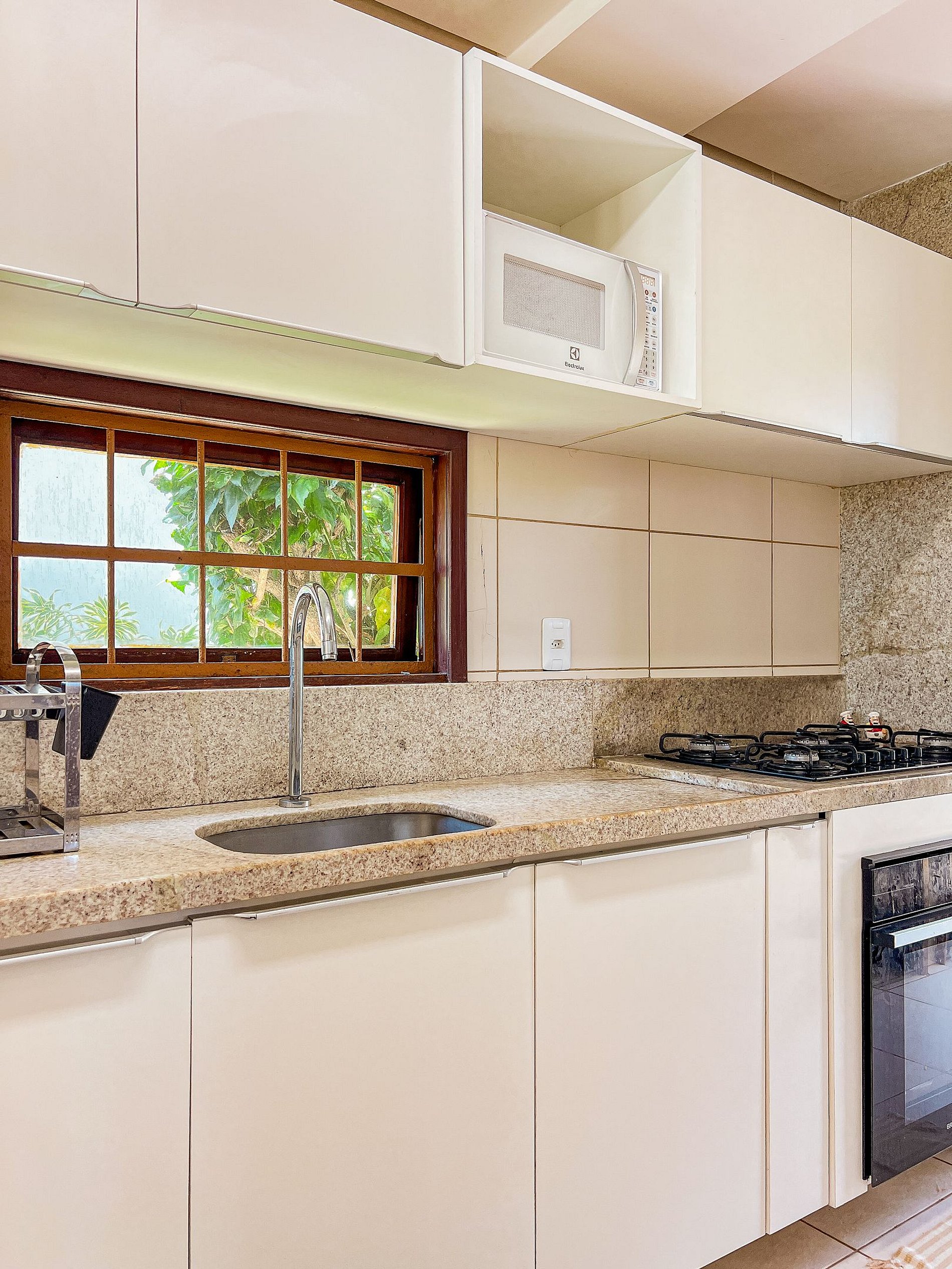 • Cozinha equipada, incluindo fogão, geladeira, micro-ondas e utensílios para preparar suas refeições.