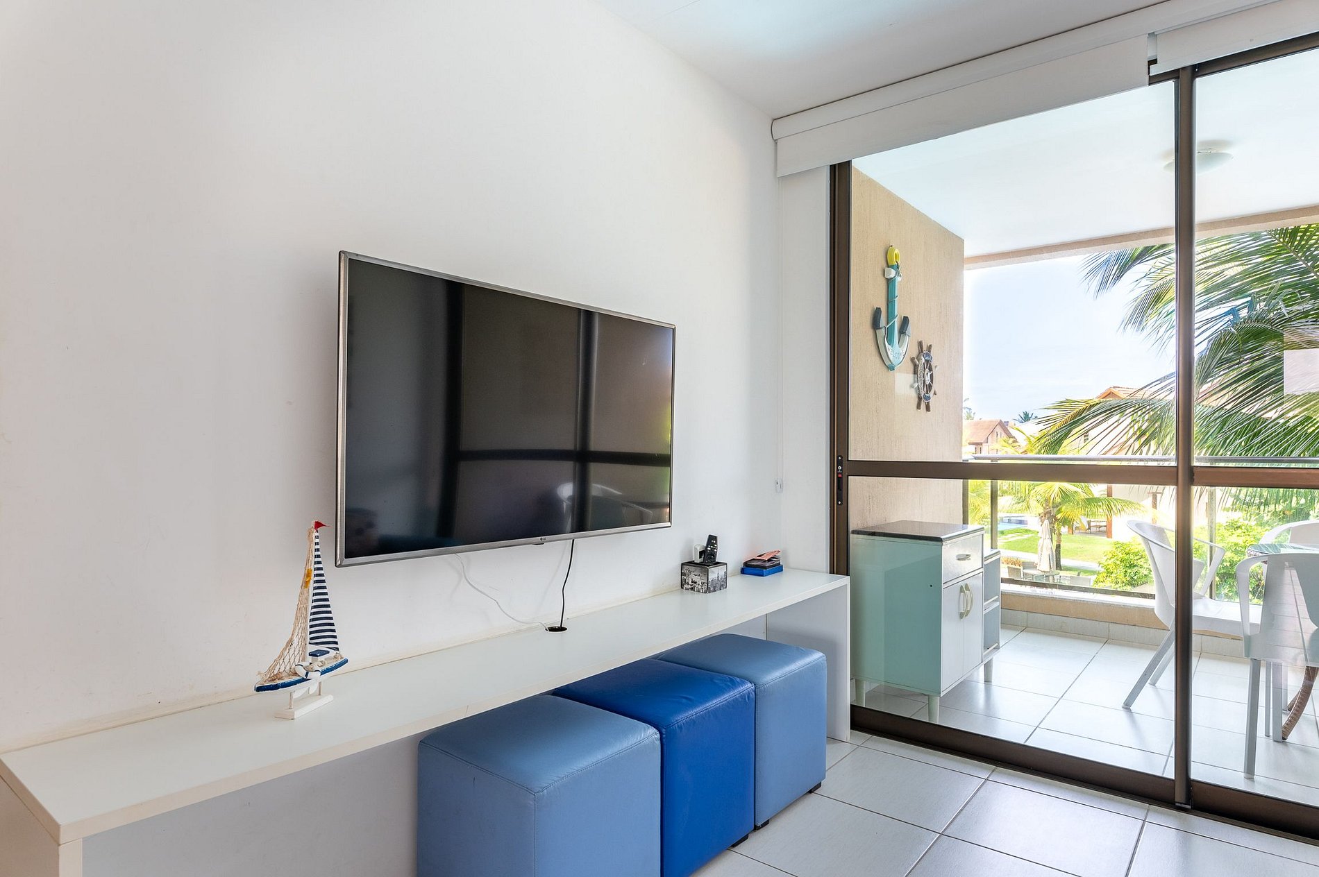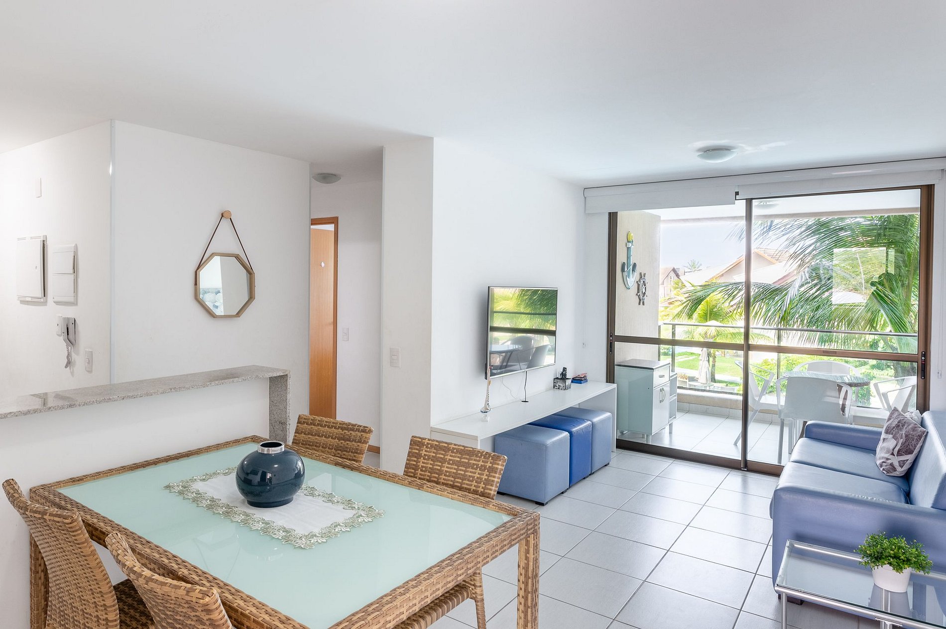 O apartamento tem dois quartos sendo uma suíte, um WC Social, uma sala ampla com dois ambientes, cozinha compacta e uma varanda com vista para as piscinas. O quarto suíte tem 1 cama casal, no quarto social tem 2 camas solteiros e 2 camas auxiliares (puxa em baixo) na sala tem sofá, mesa para 4 lugares e a cozinha completa com fogão, geladeira, micro-ondas, liquidificador, sanduicheira, gelágua e demais utensílios básicos. A varanda tem 1 mesa 4 lugares e uma bela vista para as piscinas.