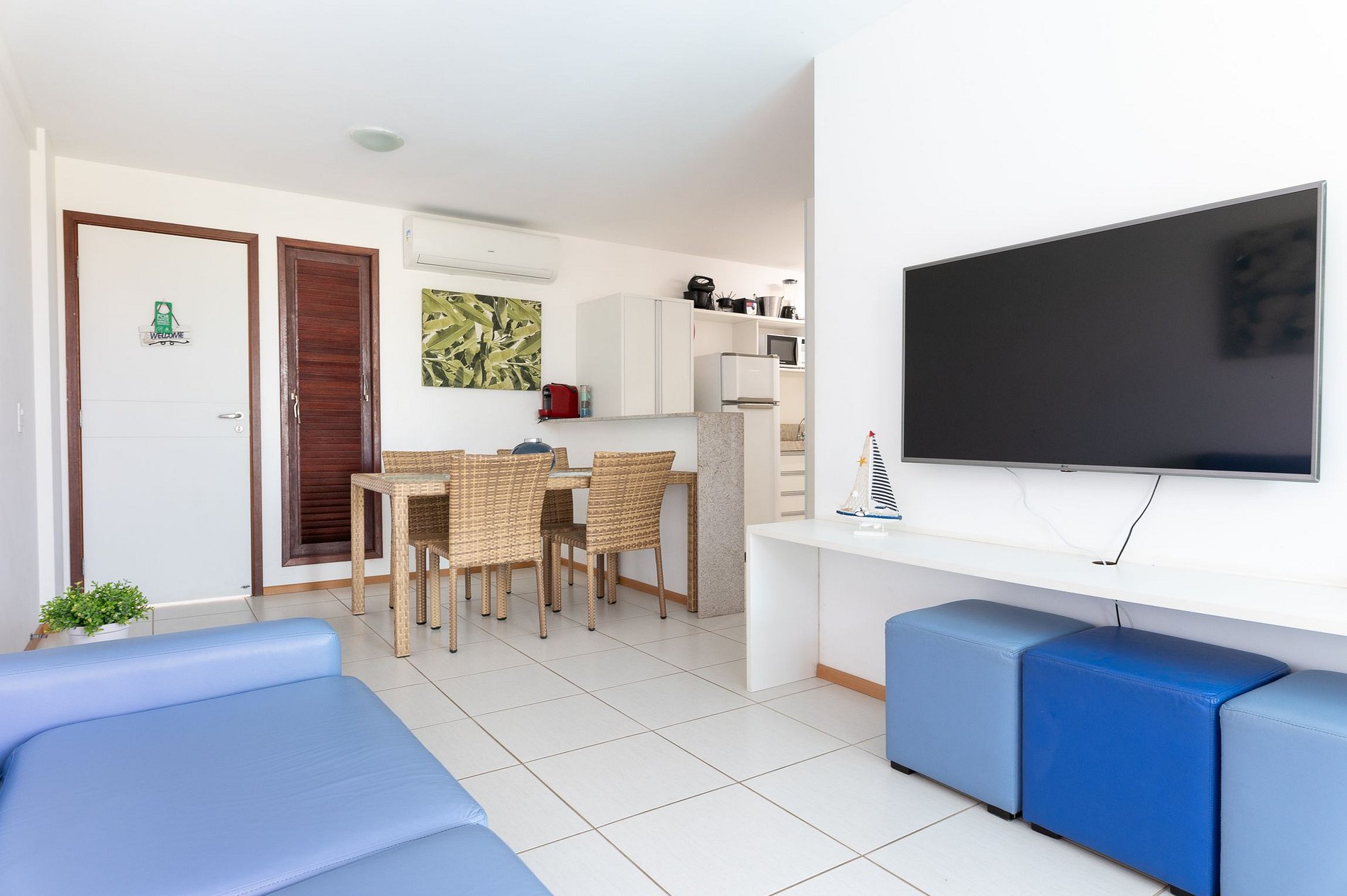 O apartamento tem dois quartos sendo uma suíte, um WC Social, uma sala ampla com dois ambientes, cozinha compacta e uma varanda com vista para as piscinas. O quarto suíte tem 1 cama casal, no quarto social tem 2 camas solteiros e 2 camas auxiliares (puxa em baixo) na sala tem sofá, mesa para 4 lugares e a cozinha completa com fogão, geladeira, micro-ondas, liquidificador, sanduicheira, gelágua e demais utensílios básicos. A varanda tem 1 mesa 4 lugares e uma bela vista para as piscinas.