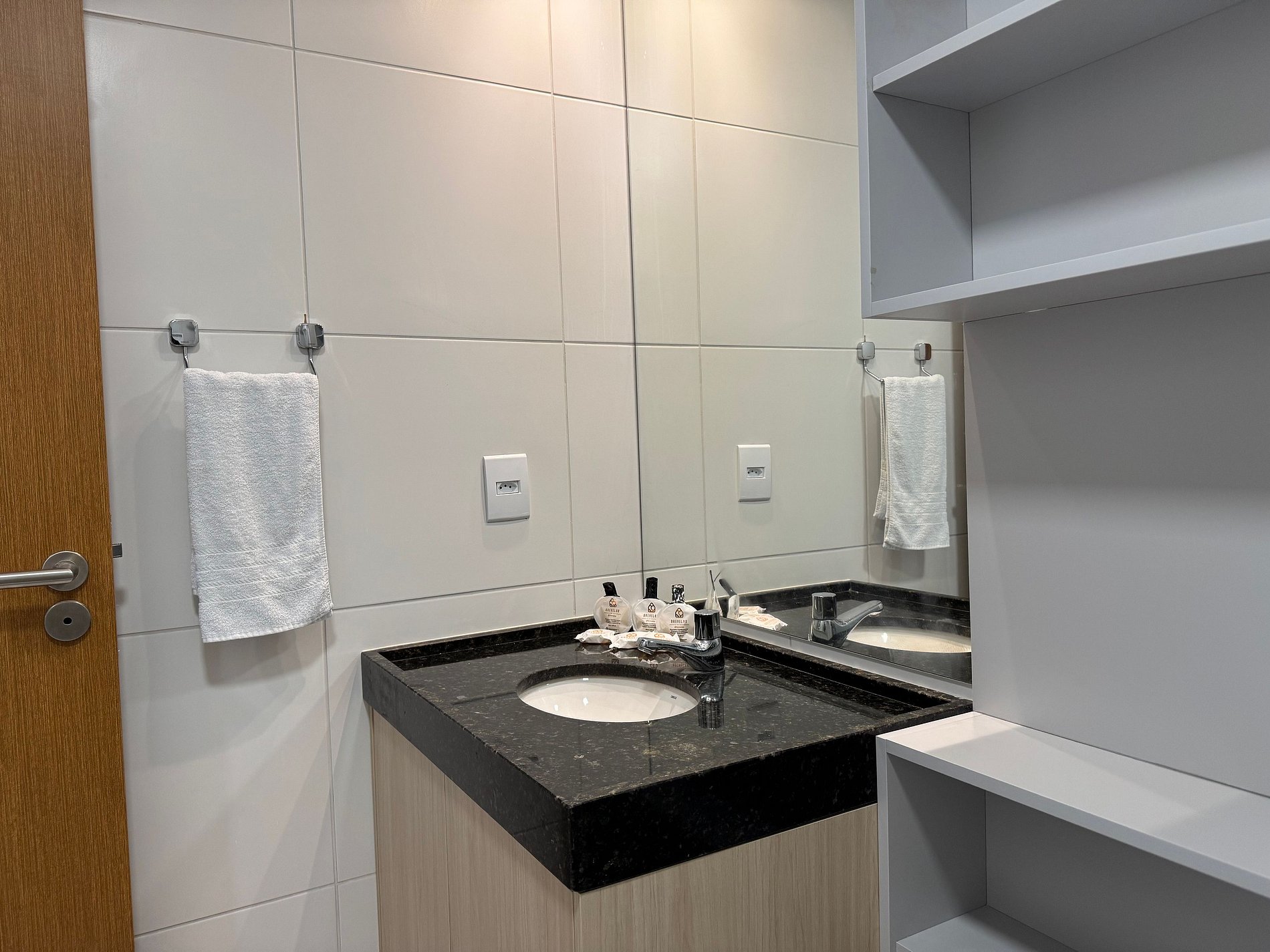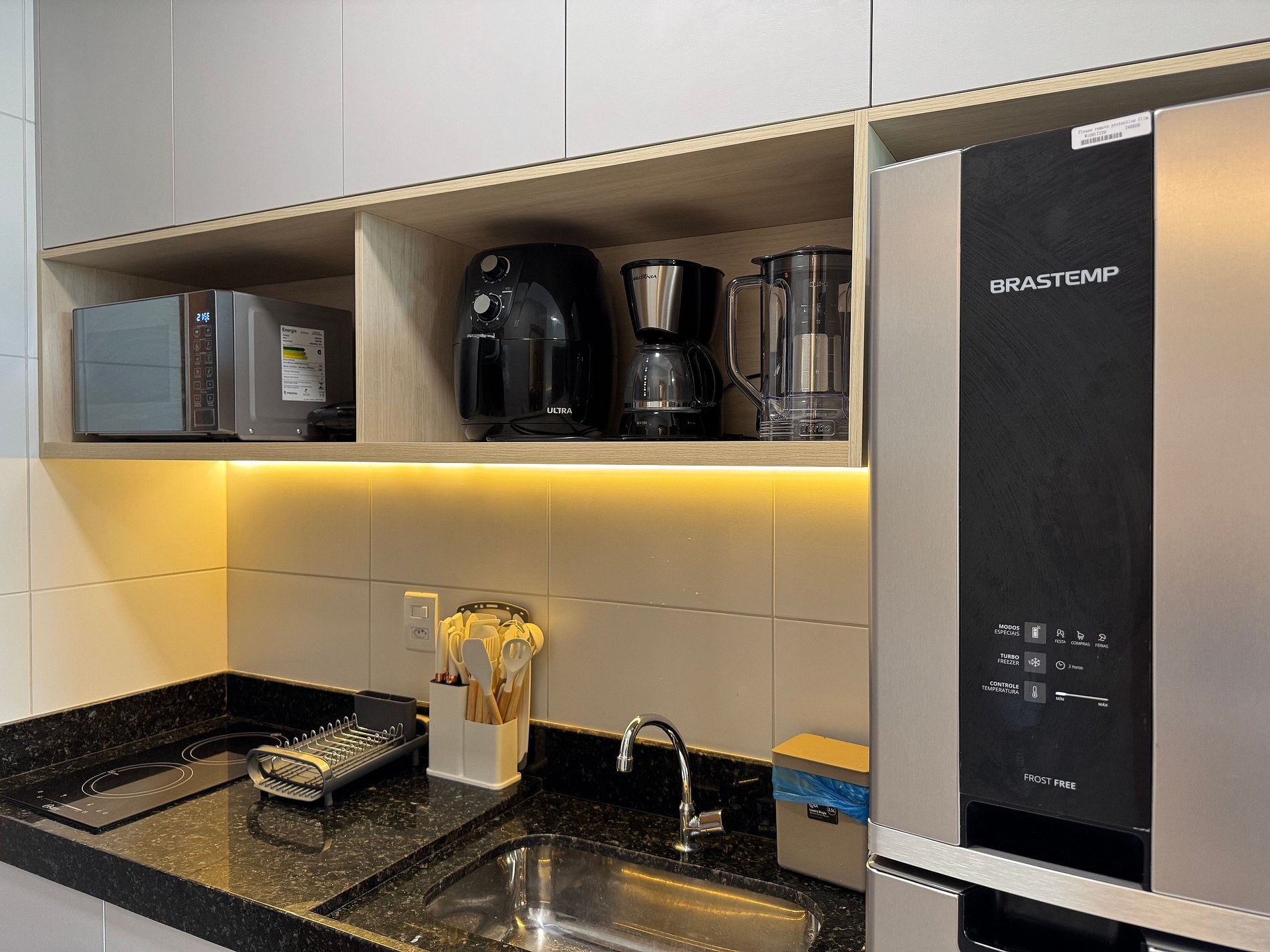 O apartamento tem 26m2, uma suíte completa com Smart TV 50", Arcondicionado 19mil Btus, Frigobar, Fogão Elétrico 2 bocas, Forno Microondas, Cama Casal mais sofá cama casal.