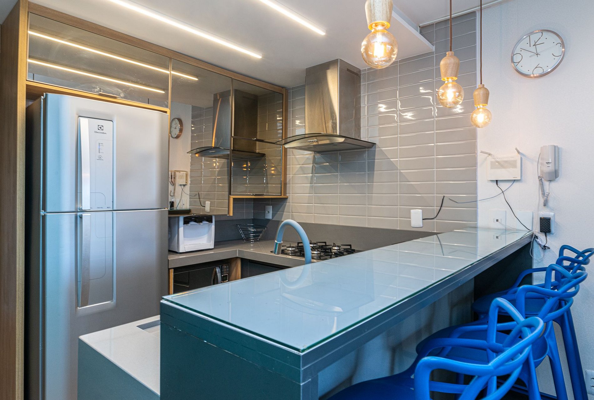 2 dormitórios, 2 banheiros, cozinha equipada, Varanda Gourmet, Sala Reversível com sofá cama casal, TV e Ar.