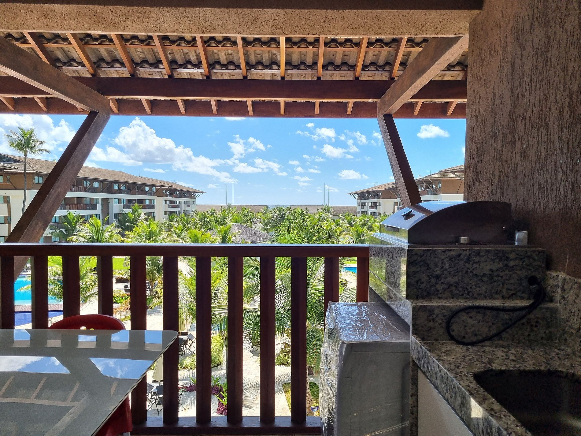 - Varanda com vista para piscinas e pequena vista pro Mar, com Churrasqueira;