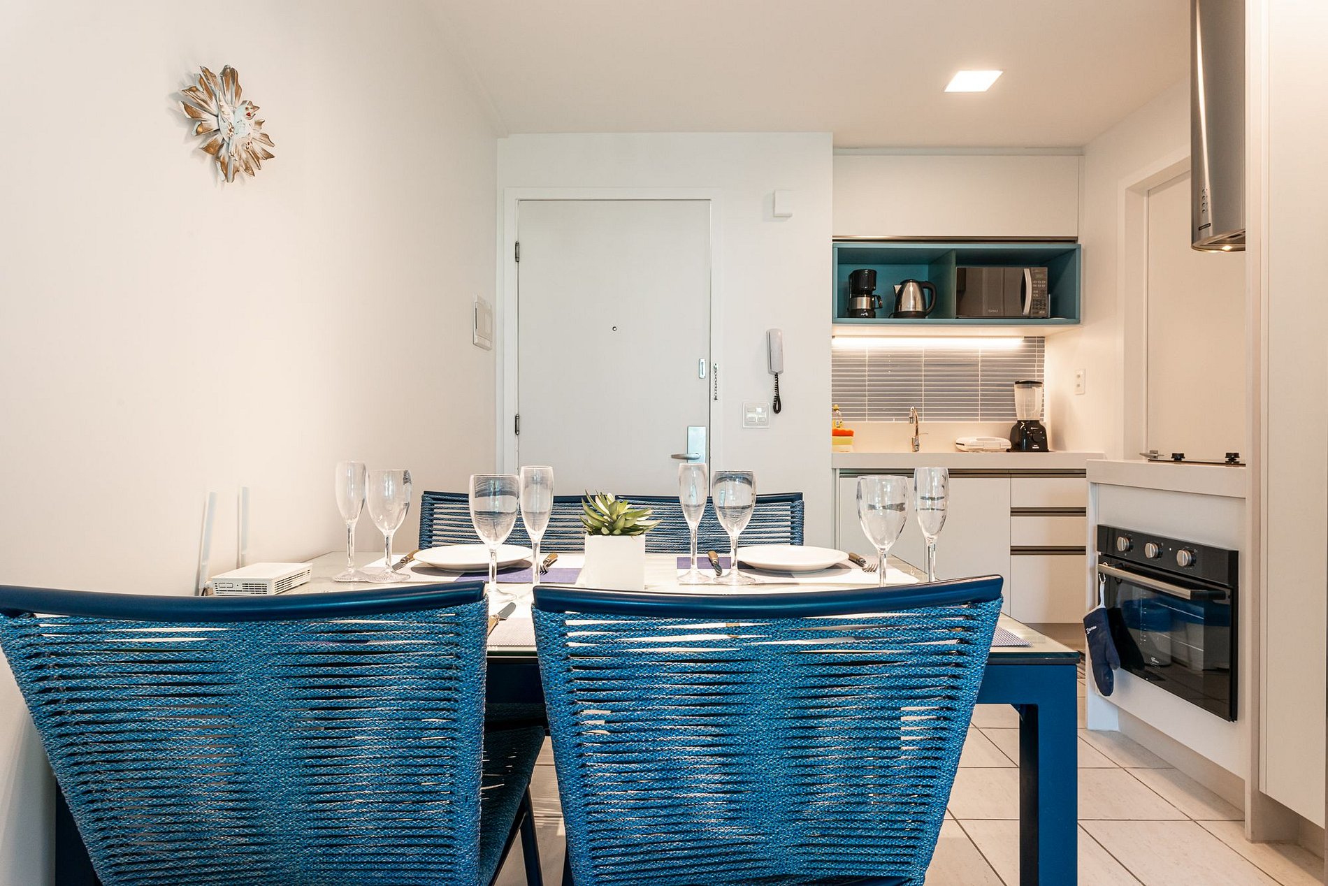 Totalmente equipado com toda infraestrutura de casa, como ferro de passar, fogão elétrico de duas bocas, forno elétrico de 46L, microondas, geladeira, sanduicheira, liquidificador, cafeteira e demais acessórios (pratos, copos, taças, xícaras, talheres, jogo de panelas (assadores, cuscuzeira, panelas, leiteira, forma de bolo e travessas).