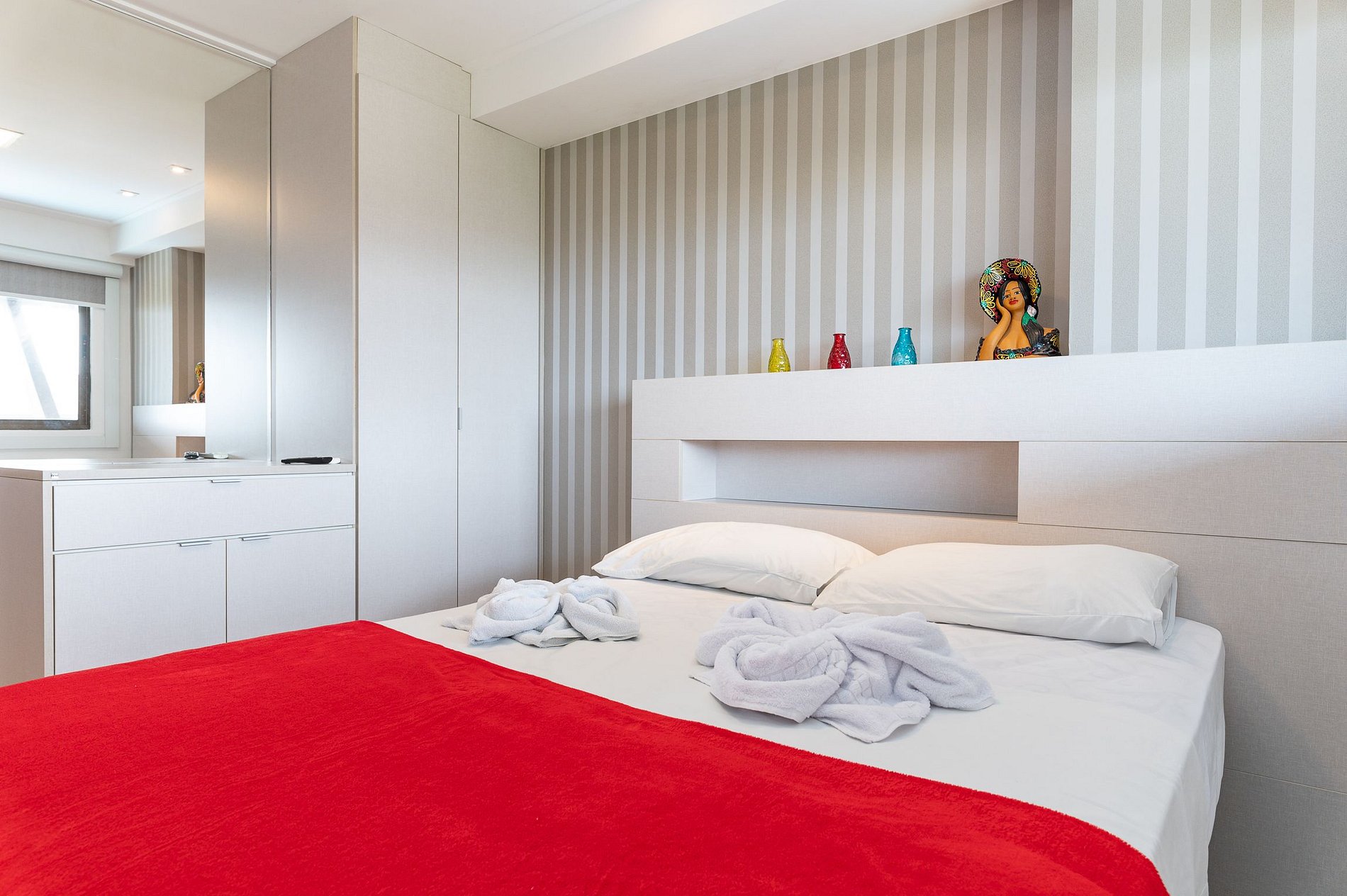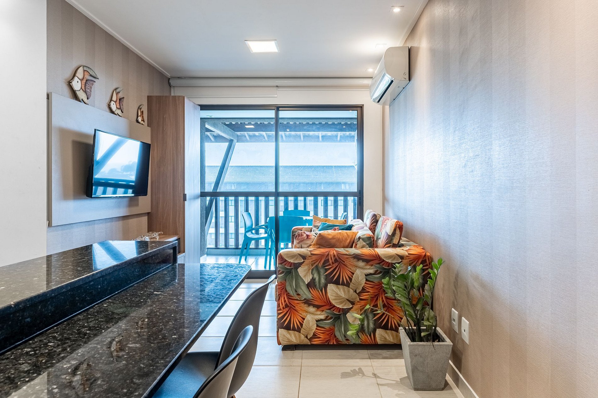 O Apartamento tem 2 Quartos sendo uma suíte, 2 Wc, Sala com sofá, tv, mesa e cadeiras, Cozinha completa, Varanda com Vista para o Piscinas e Mar. Conte com Ar condicionado, TV, Internet, roupa de cama e banho e utensílios e eletros básicos.