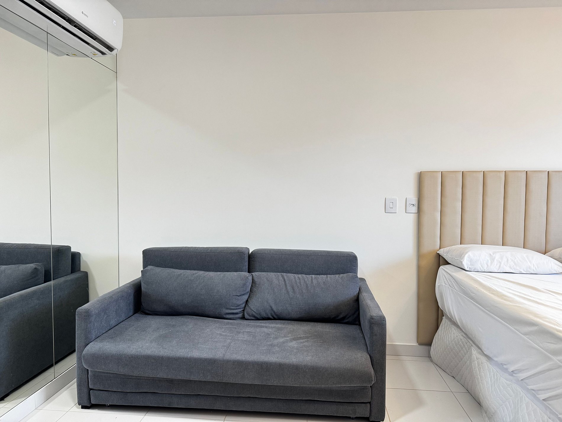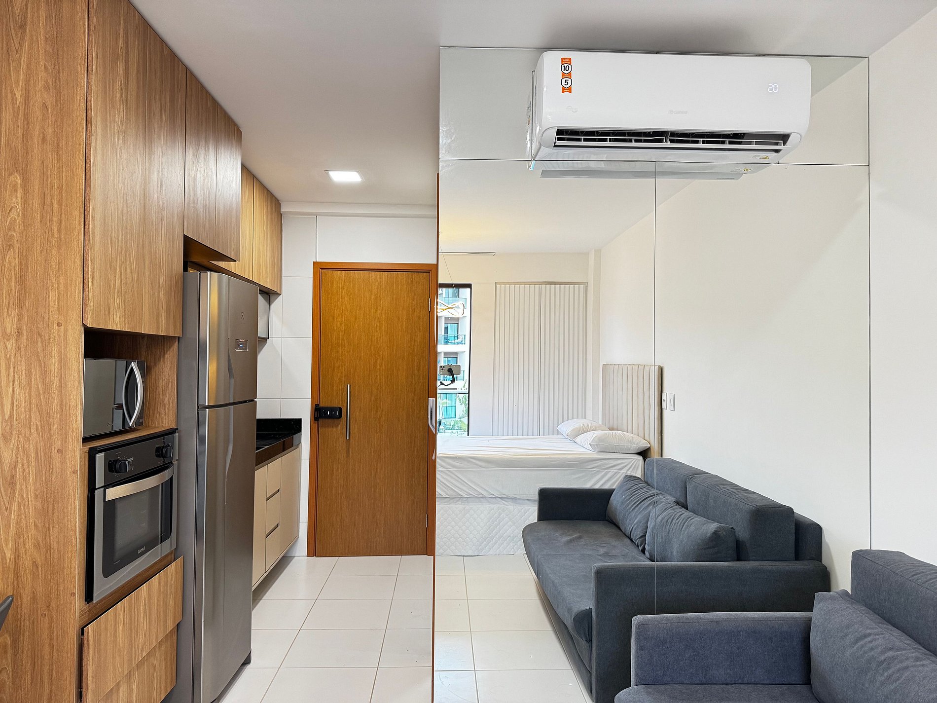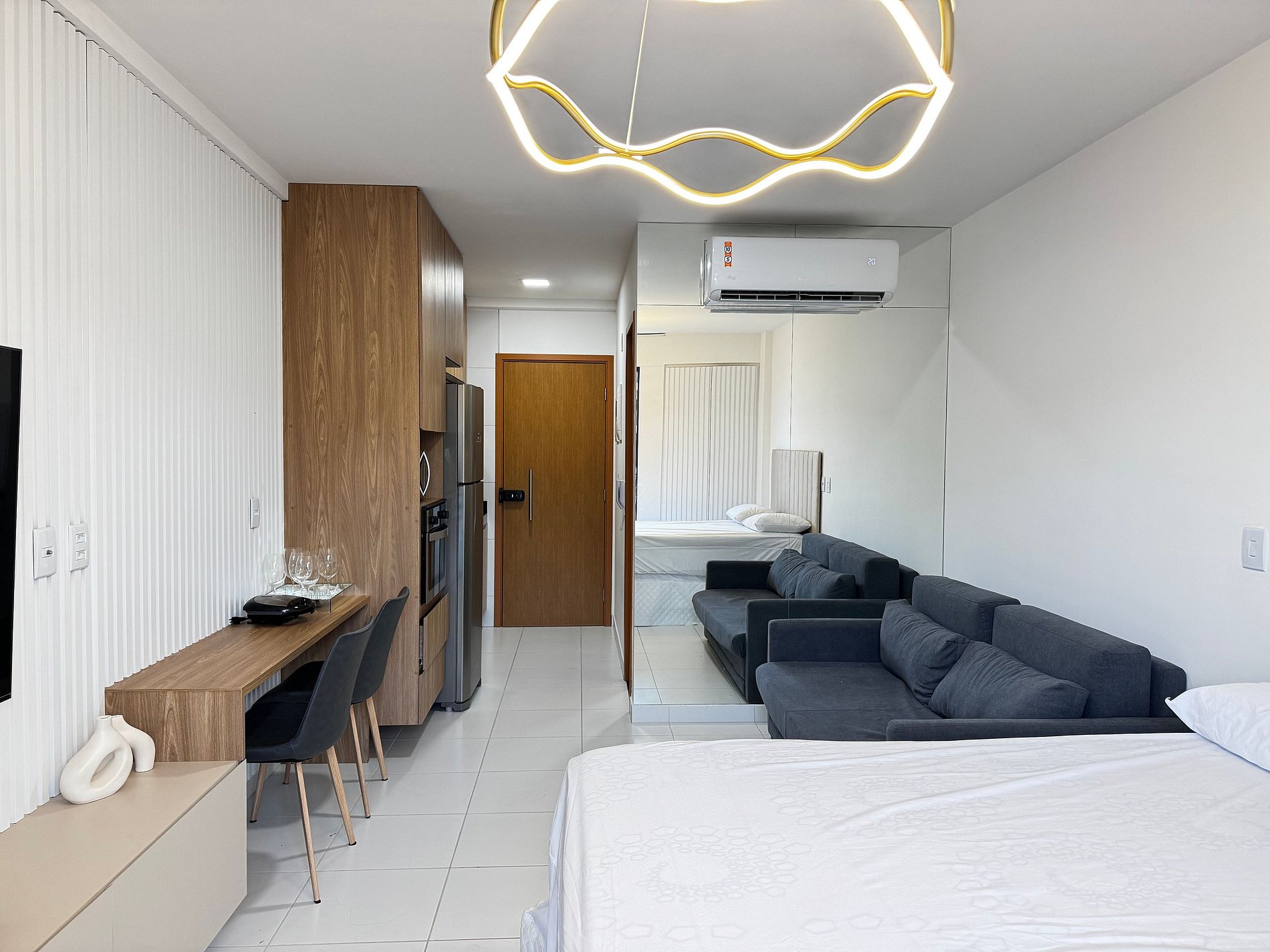 O apartamento possui 26m², suíte completa com Smart TV de 50", ar-condicionado de 19.000 BTUs, geladeira, fogão por indução de 2 bocas, micro-ondas, cama de casal e sofá-cama de casal.