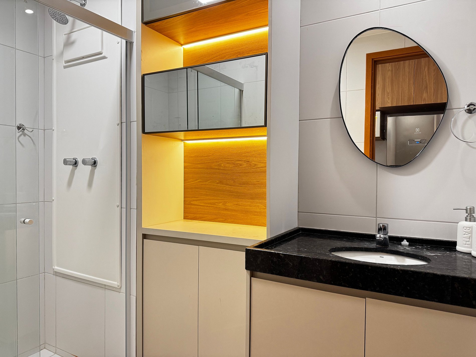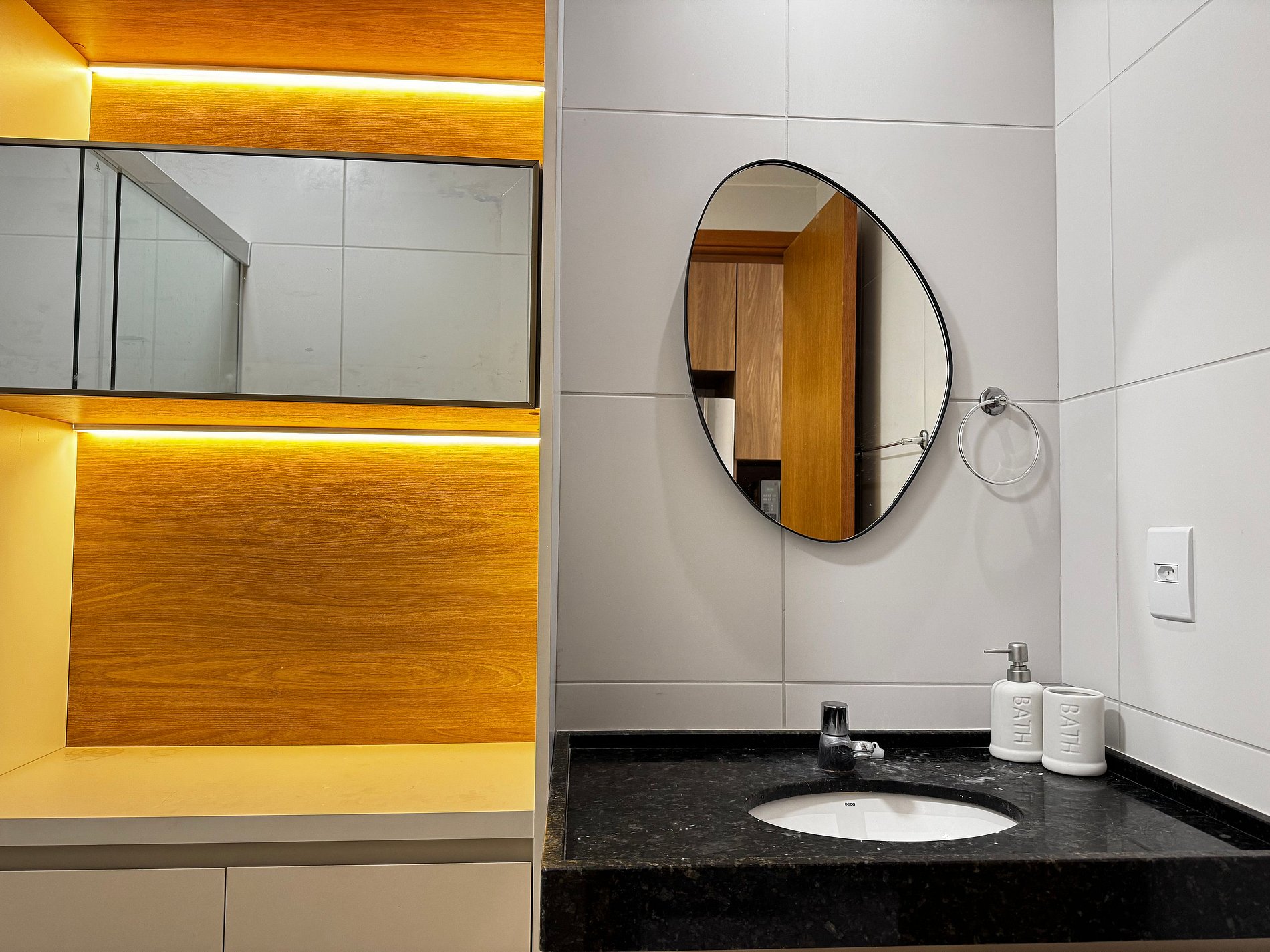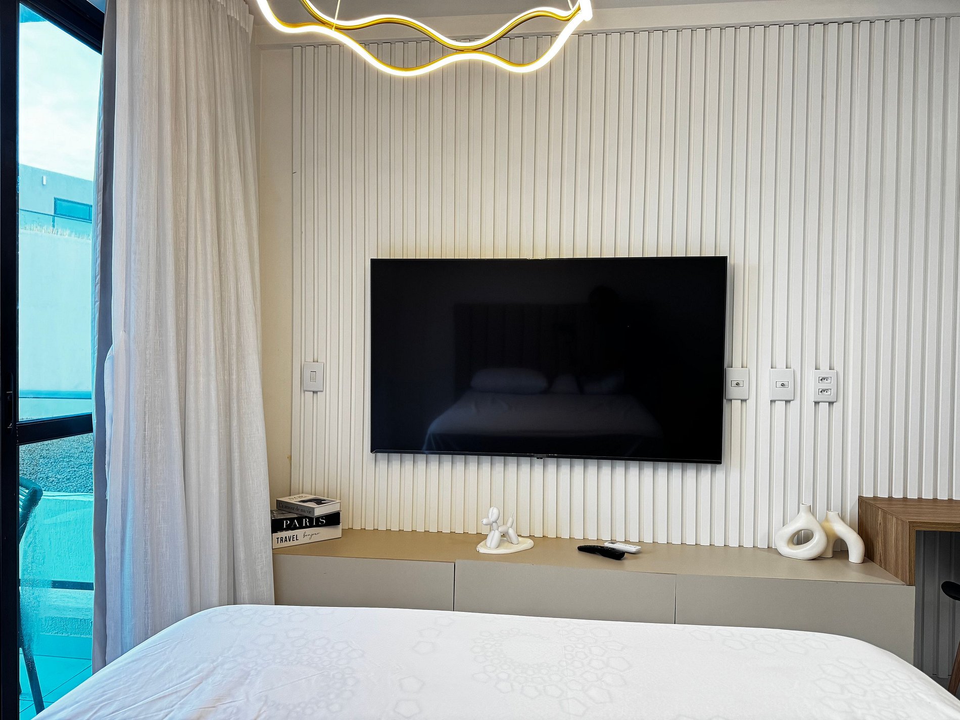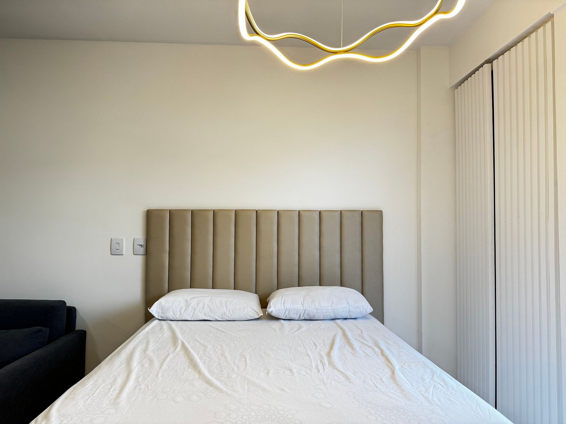 O apartamento possui 26m², suíte completa com Smart TV de 50", ar-condicionado de 19.000 BTUs, geladeira, fogão por indução de 2 bocas, micro-ondas, cama de casal e sofá-cama de casal.