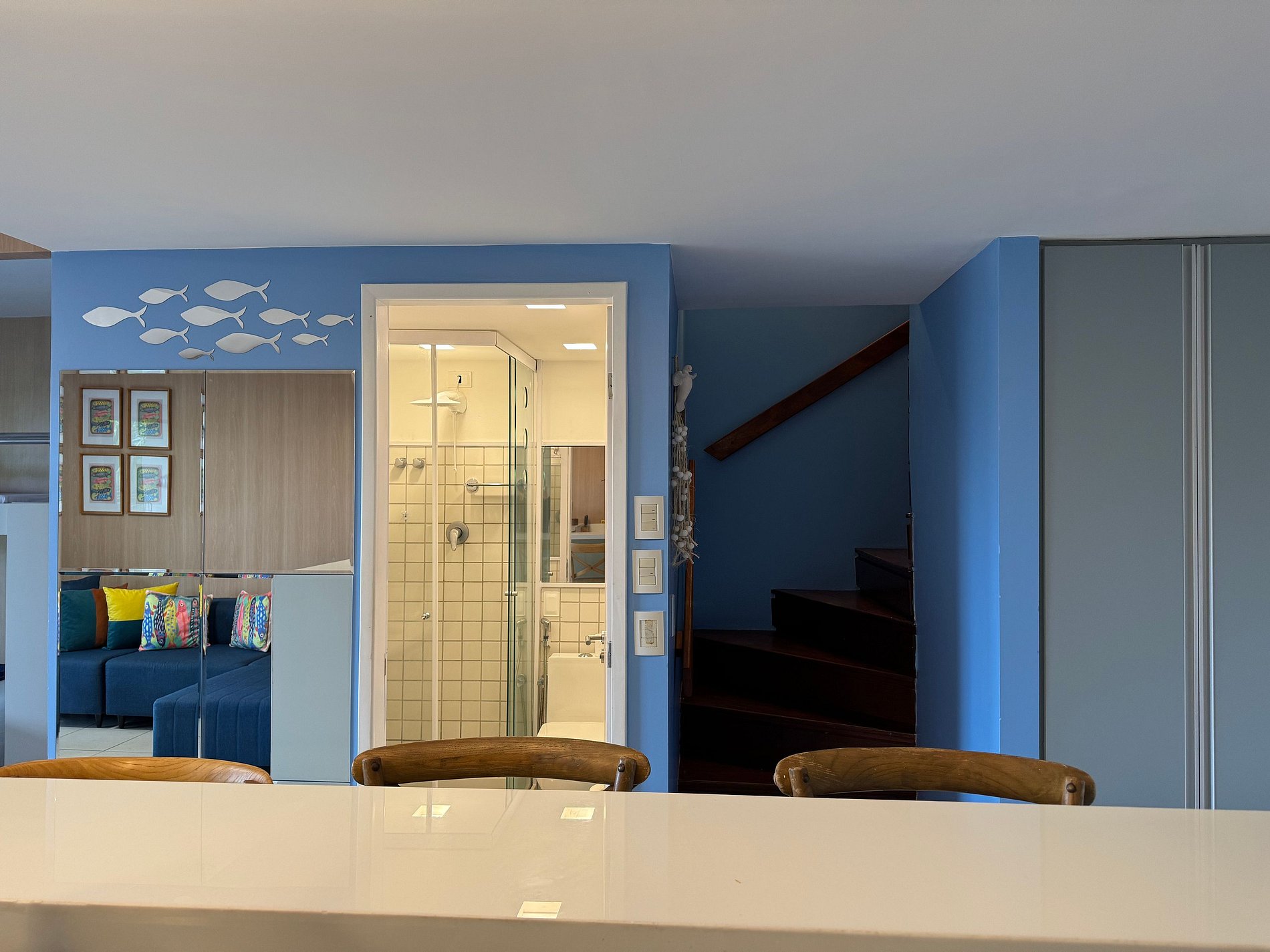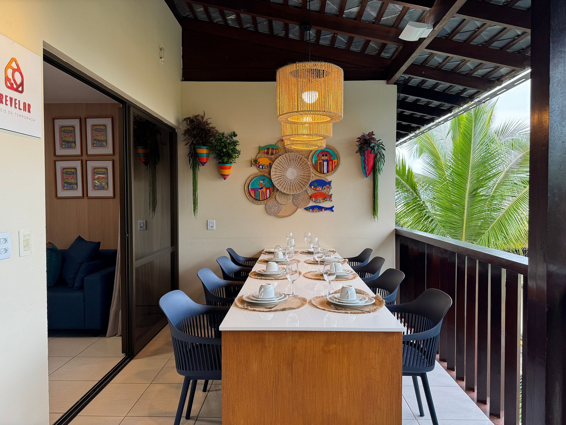 No mais, você vai encontrar um banheiro social, mesa para jantar (8 pessoas), sala de estar com TV, sofá e cadeiras, varanda com mesas, cadeiras. Na cozinha você tem tudo que precisa: geladeira, micro-ondas, fogão, forno, jogo de prato, talheres, copos, xícaras, taças, e panelas, abridor de vinho e sanduicheira.
