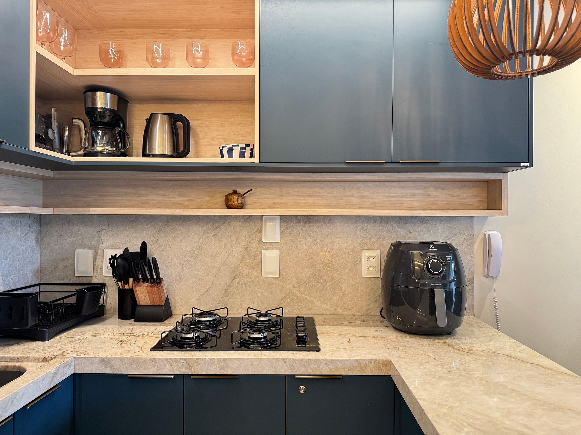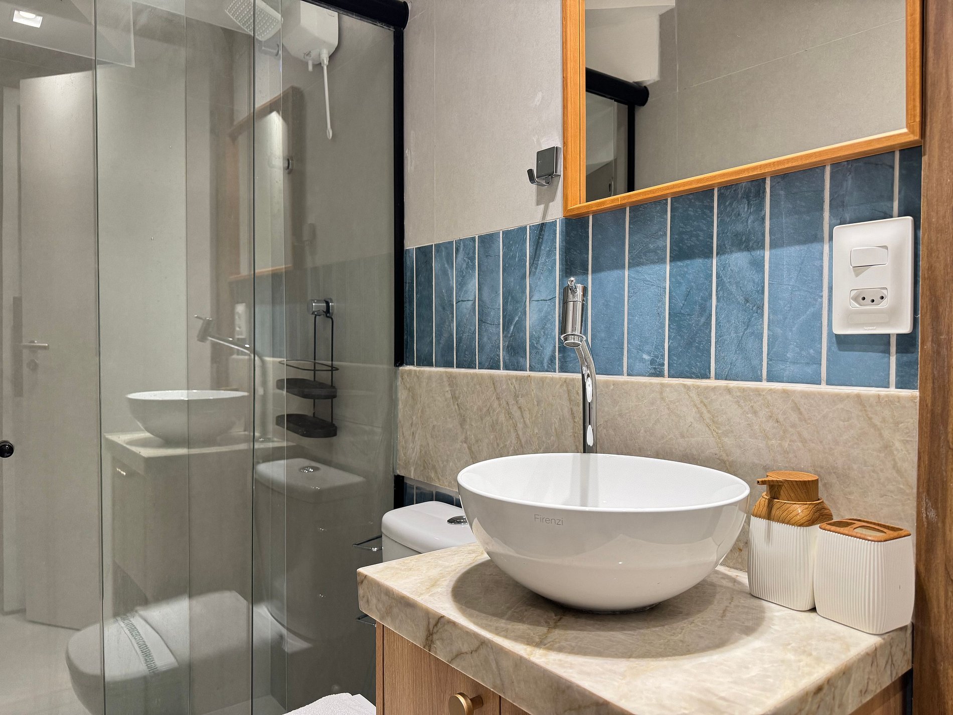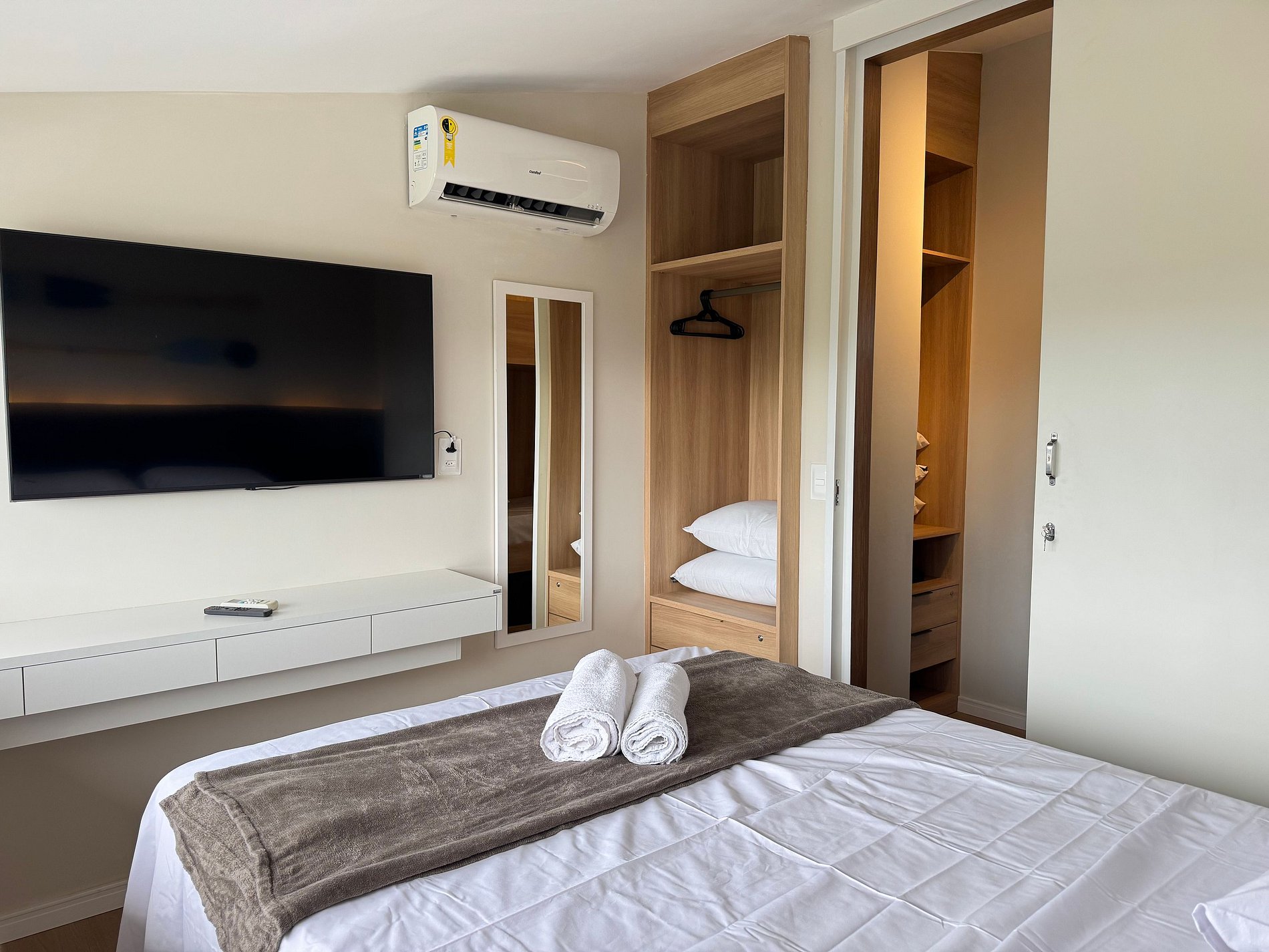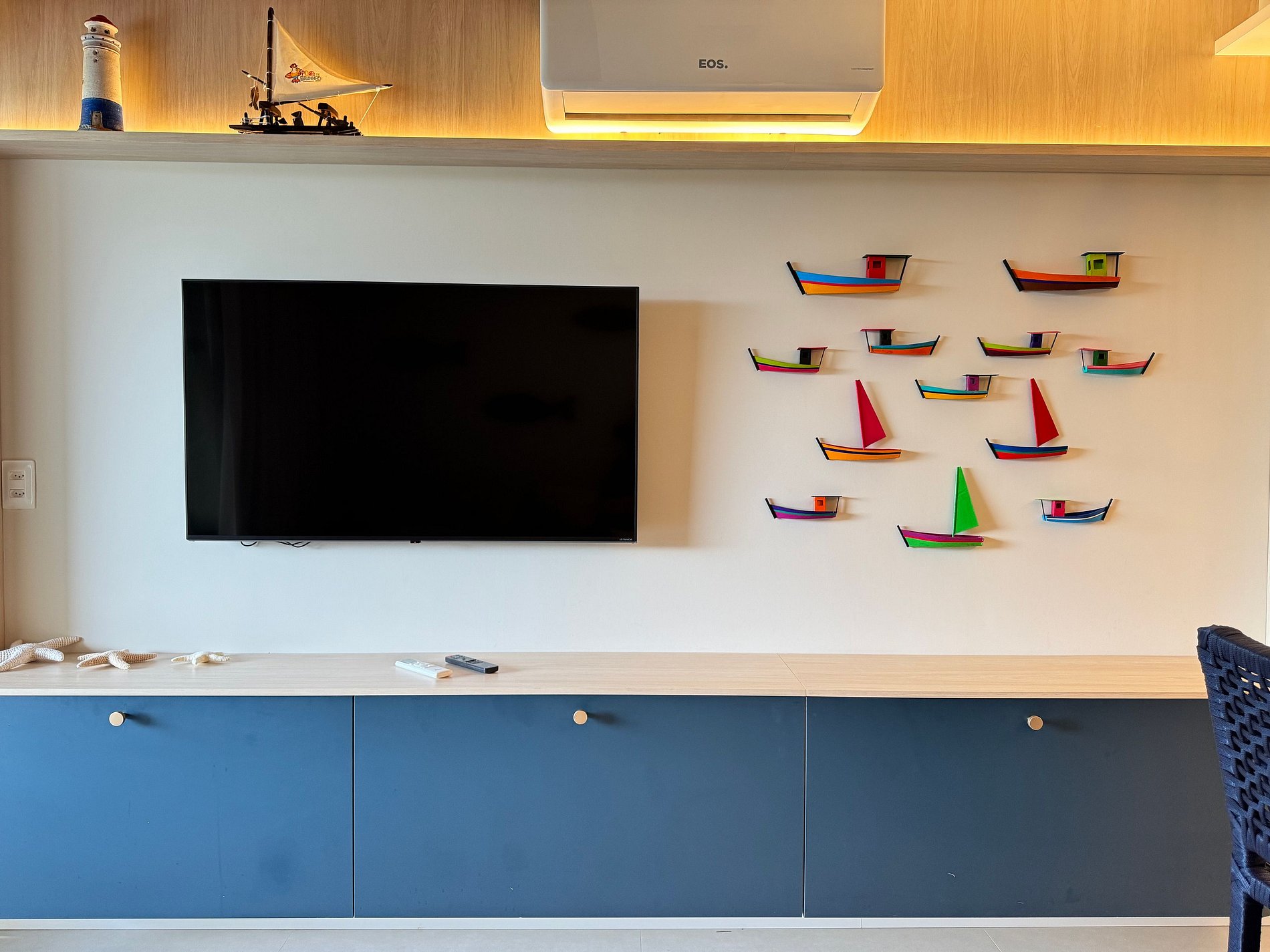 Além disso, o apartamento oferece 2 banheiros, mesa de jantar, sala de estar com TV, sofá e cadeiras, além de varanda com mesas e cadeiras. A cozinha é completa, equipada com geladeira, micro-ondas, fogão, forno, jogo de pratos, talheres, copos, xícaras, taças, panelas, abridor de vinho, gelágua e sanduicheira.