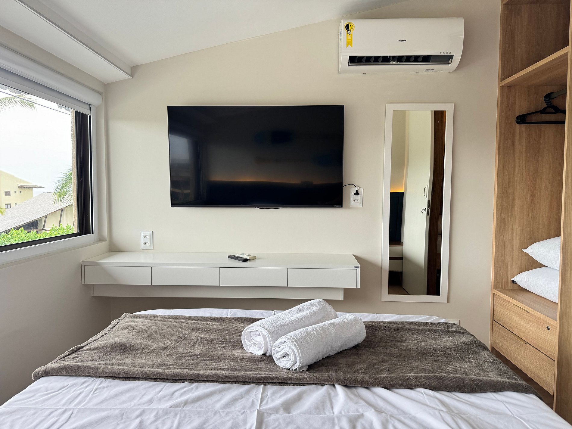 A Praia do Muro Alto é uma excelente opção para viajantes que buscam clima tropical, litoral e muito sol. Escolha se hospedar nesta unidade perfeita para famílias ou grupos de amigos, acomodando até 5 pessoas, com amplo espaço, decoração de bom gosto e estrutura de resort impressionante. O imóvel possui uma suíte com cama de casal, uma beliche para duas pessoas, TV, ar-condicionado, guarda-roupa e varanda. A sala conta com sofá-cama para duas pessoas, TV e ar-condicionado.
