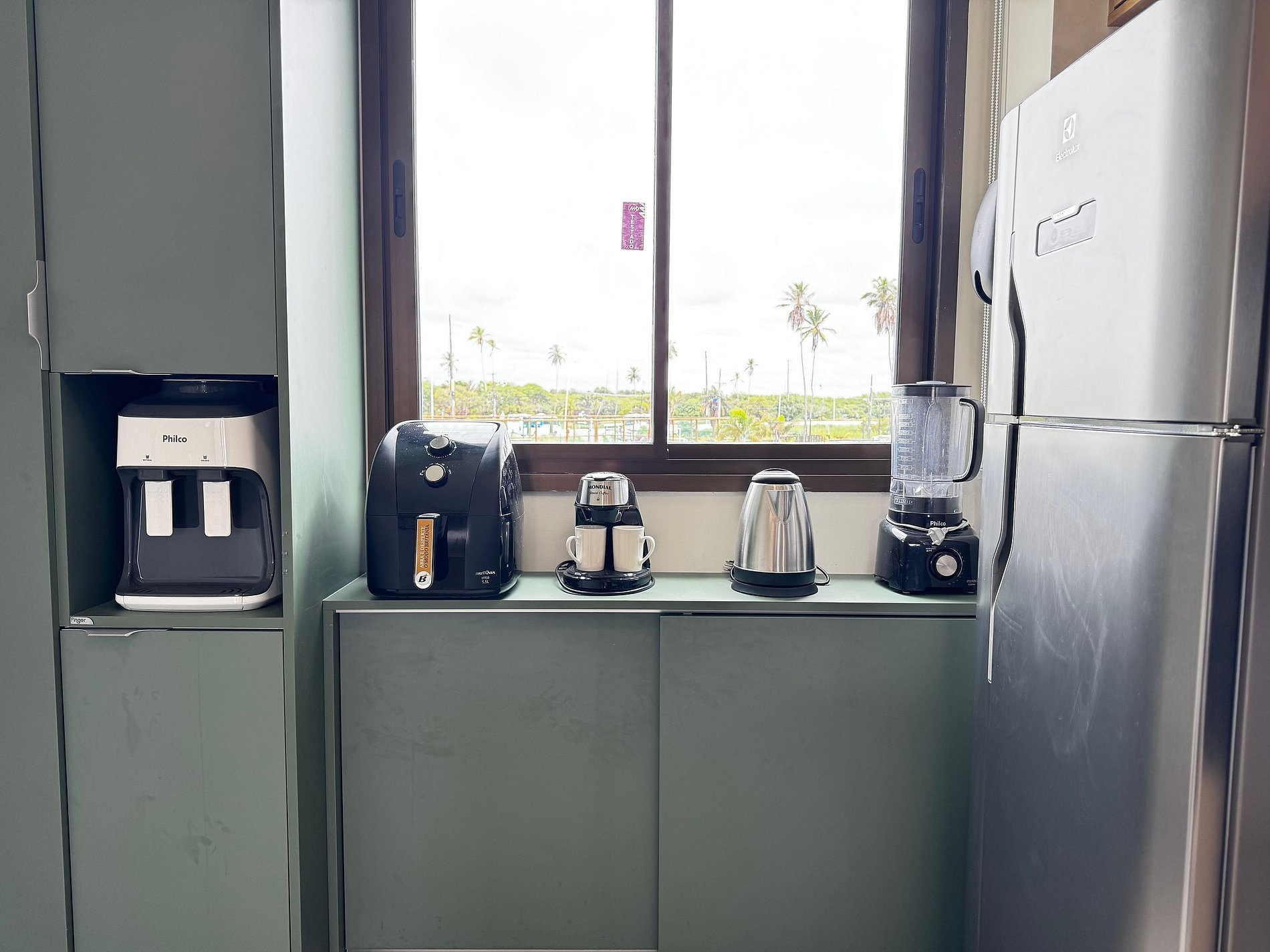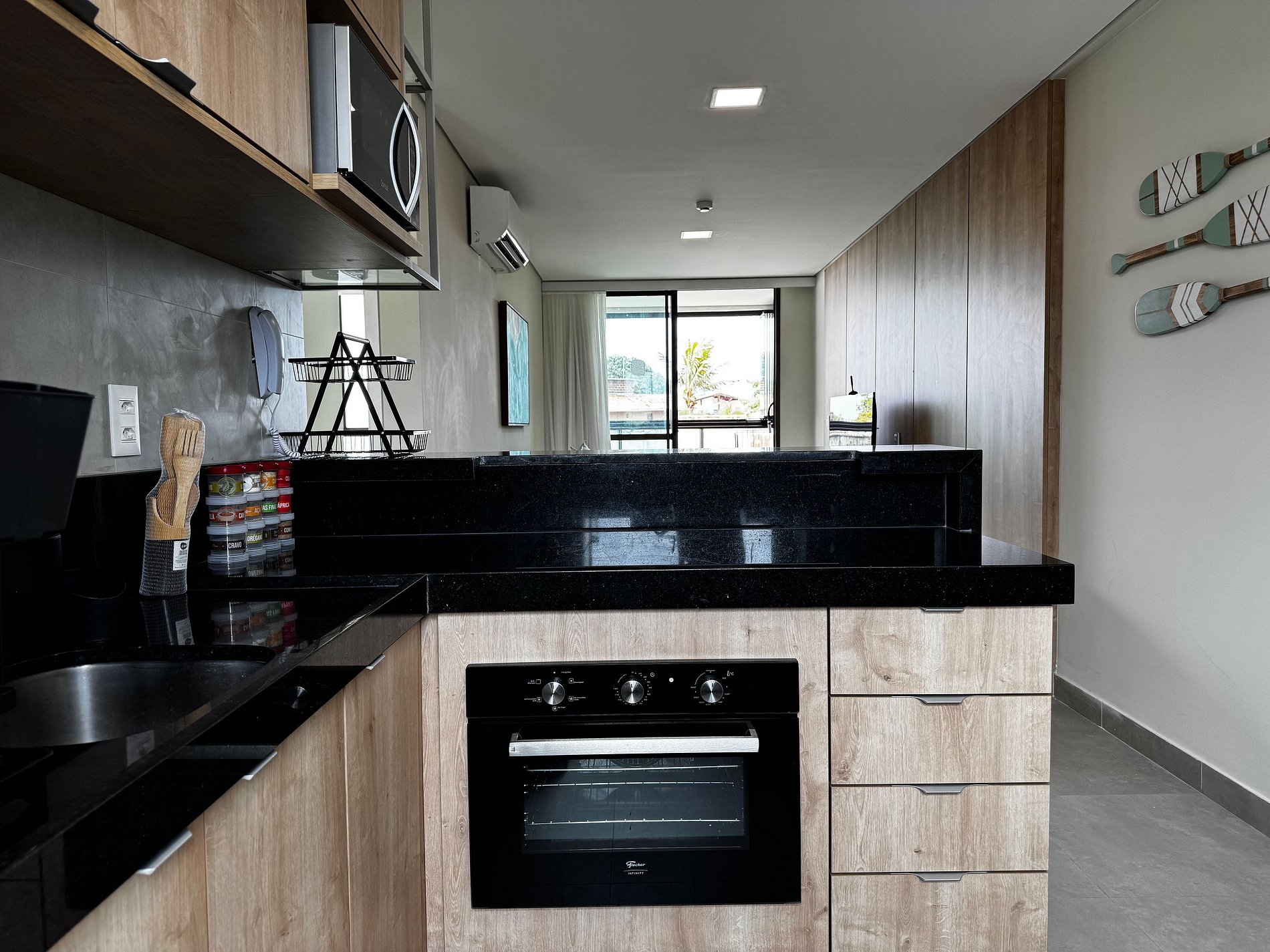 Cozinha completa equipada com micro-ondas, geladeira, forno, fogão, sanduicheira, liquidificador, utensílios e louças — tudo para uma estadia prática.