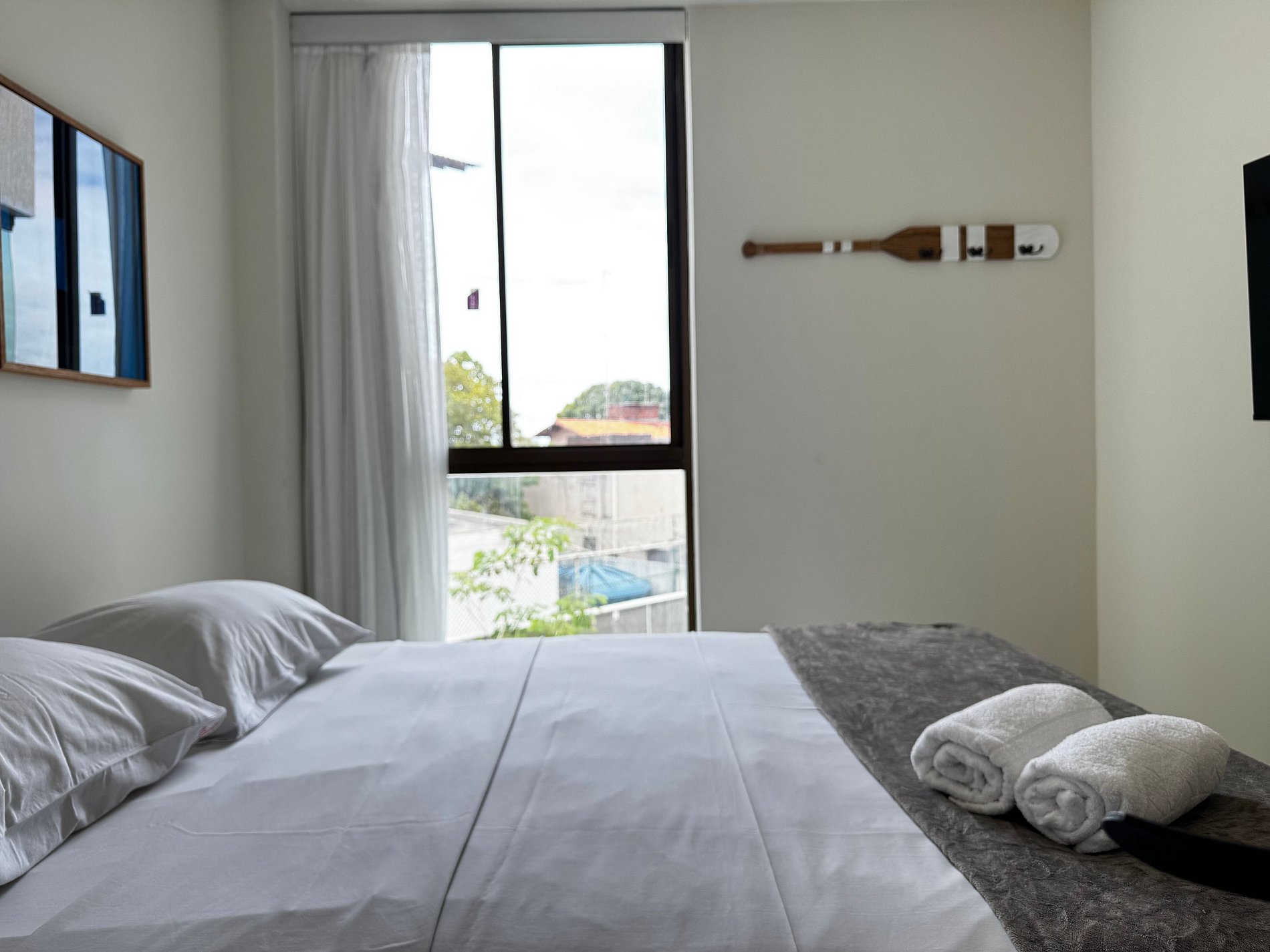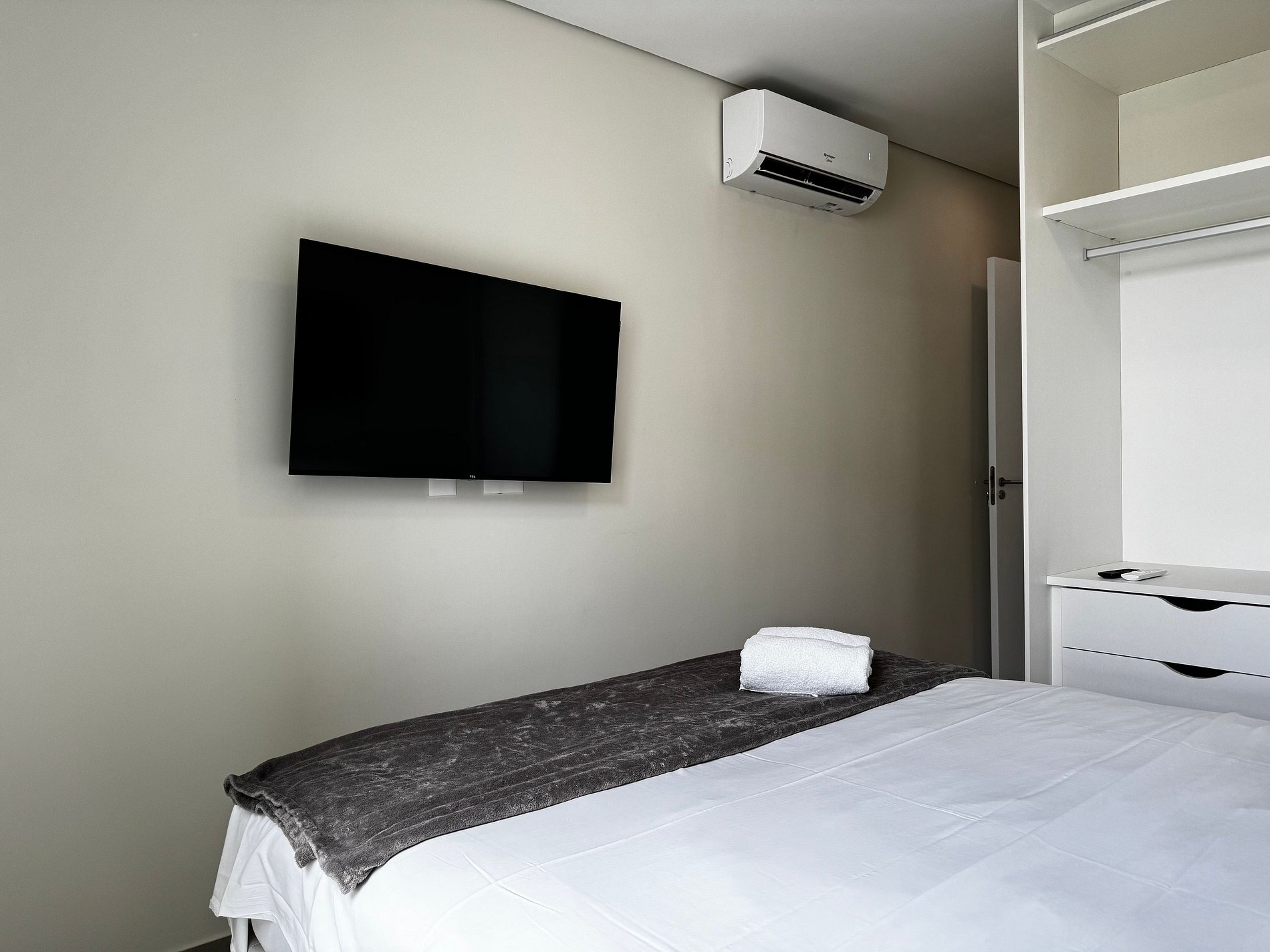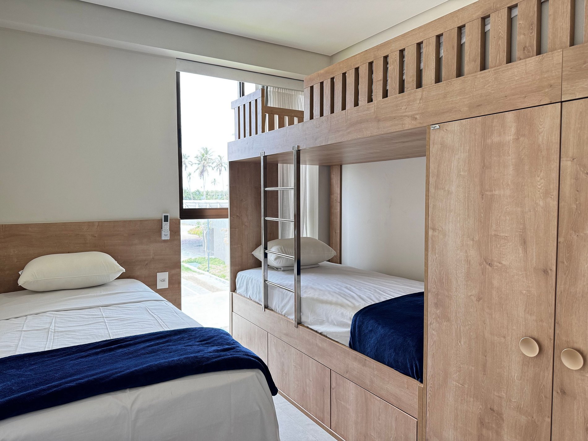 Flat de aproximadamente 60 m², acomoda até 6 pessoas (cama de casal, cama solteiro, beliche e sofá-cama), com ar-condicionado, TV, Wi-Fi, dois quartos sendo uma suíte, dois banheiros, sala e varanda com vista para as piscinas.