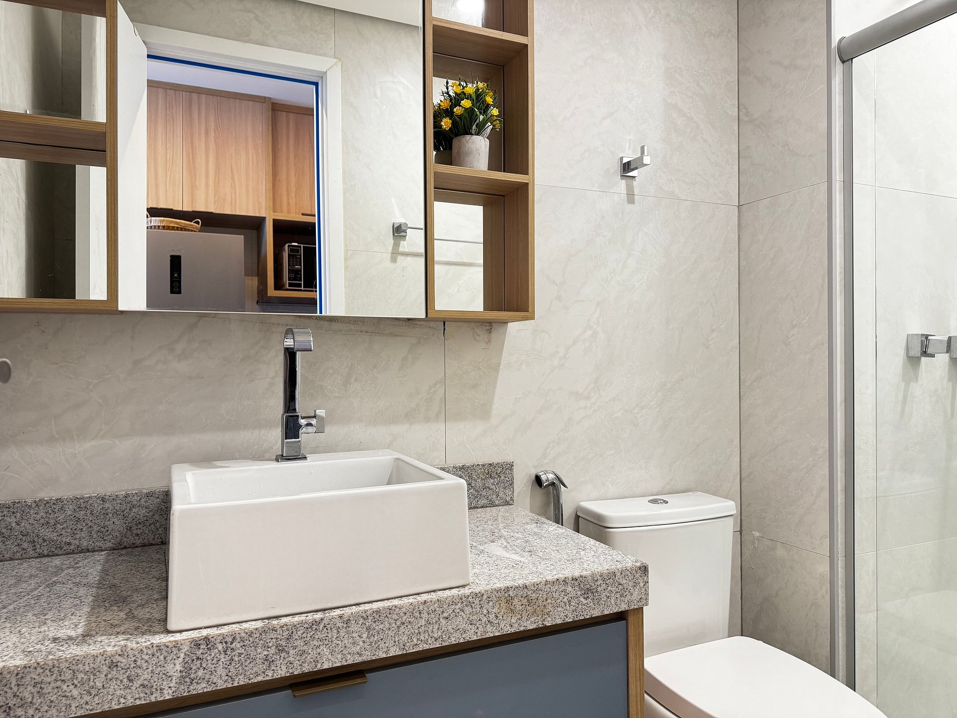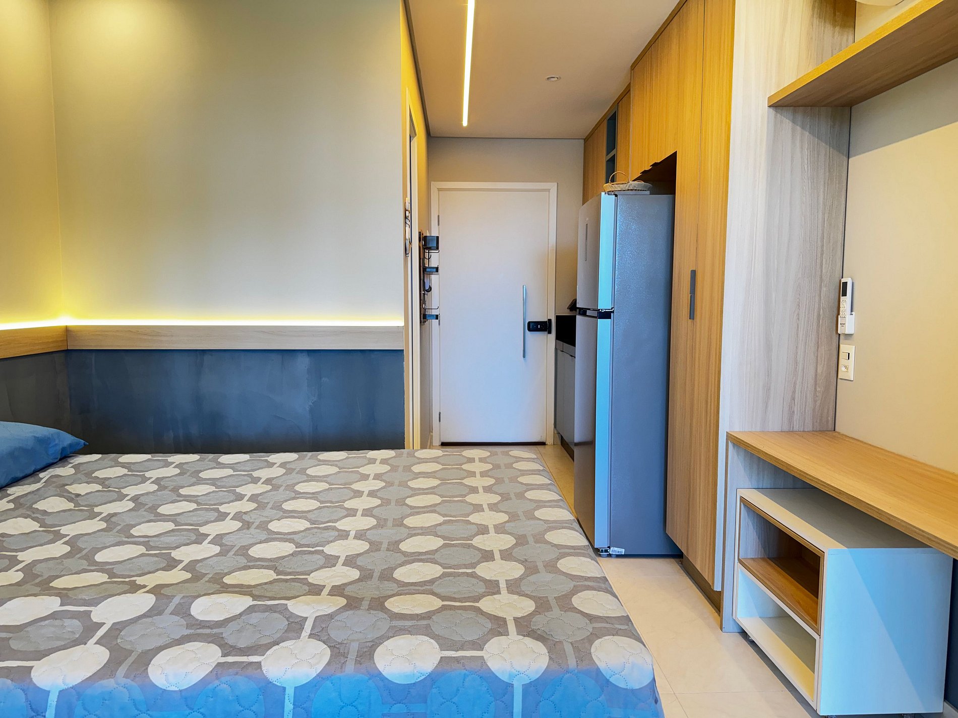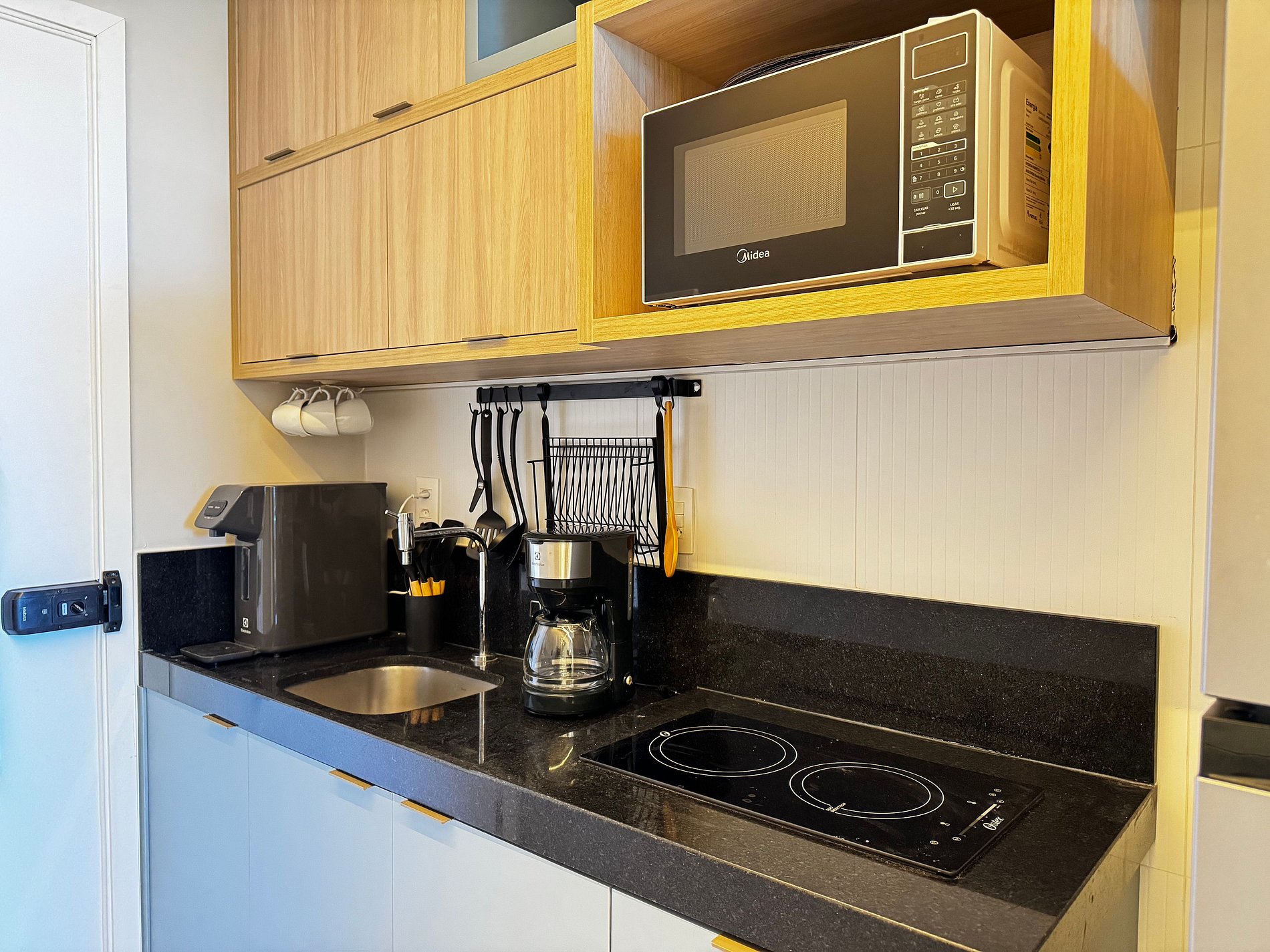 Cozinha compacta equipada com micro-ondas, geladeira, fogão, sanduicheira, liquidificador, utensílios e louças — tudo para uma estadia prática.