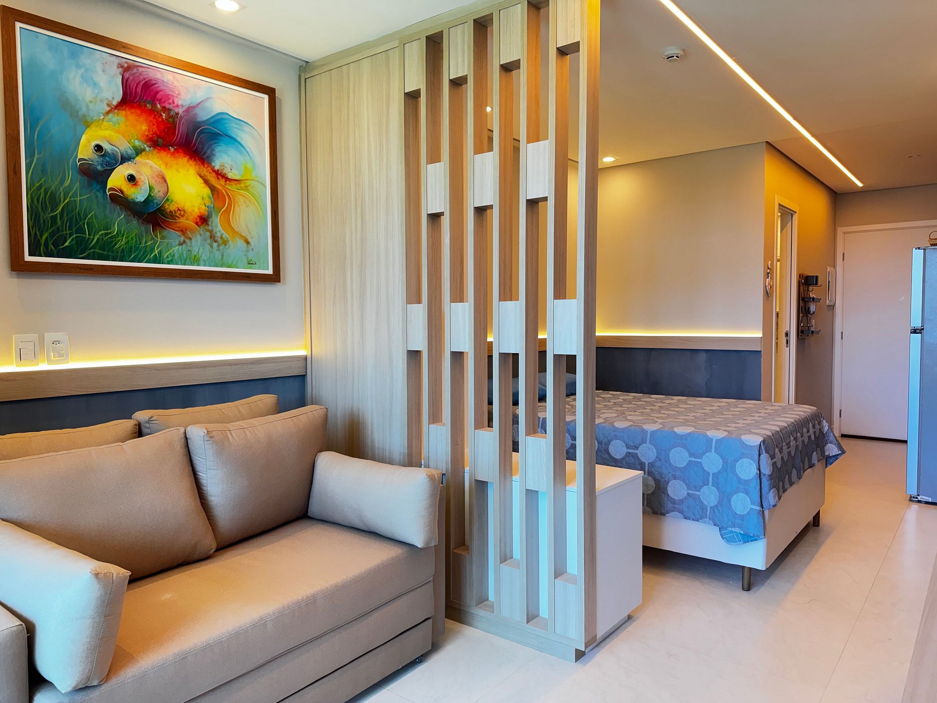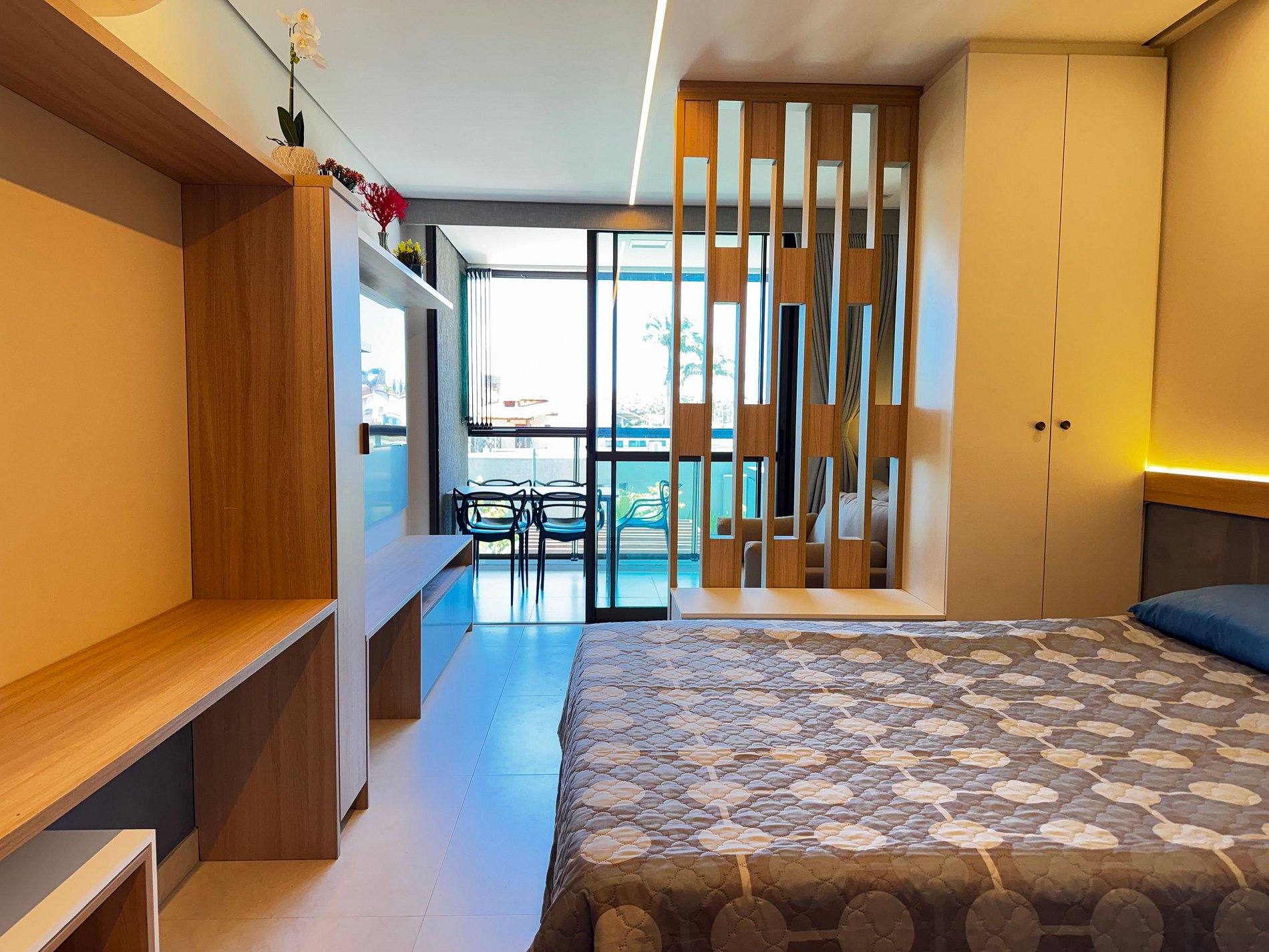 Flat de aproximadamente 32 m², acomoda até 4 pessoas (cama de casal e sofá-cama), com ar-condicionado, TV, Wi-Fi, banheiro privativo e varanda com vista.