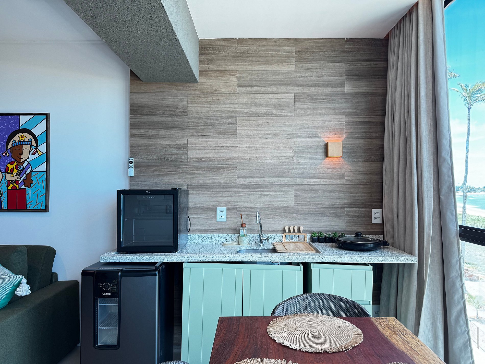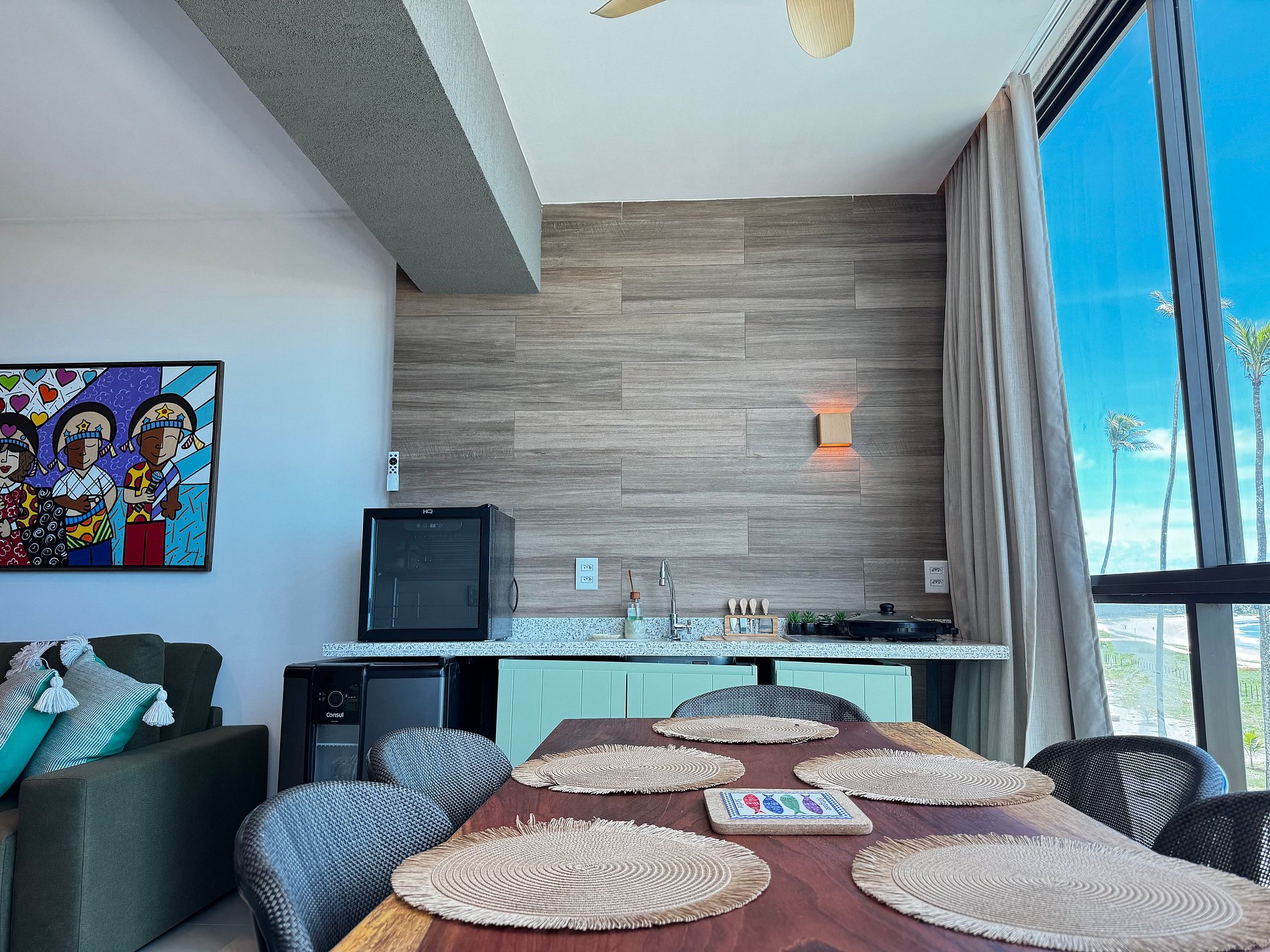 Um dos destaques é a varanda gourmet com vista para o mar, perfeita para começar o dia com um café apreciando a brisa do litoral ou relaxar no fim da tarde.