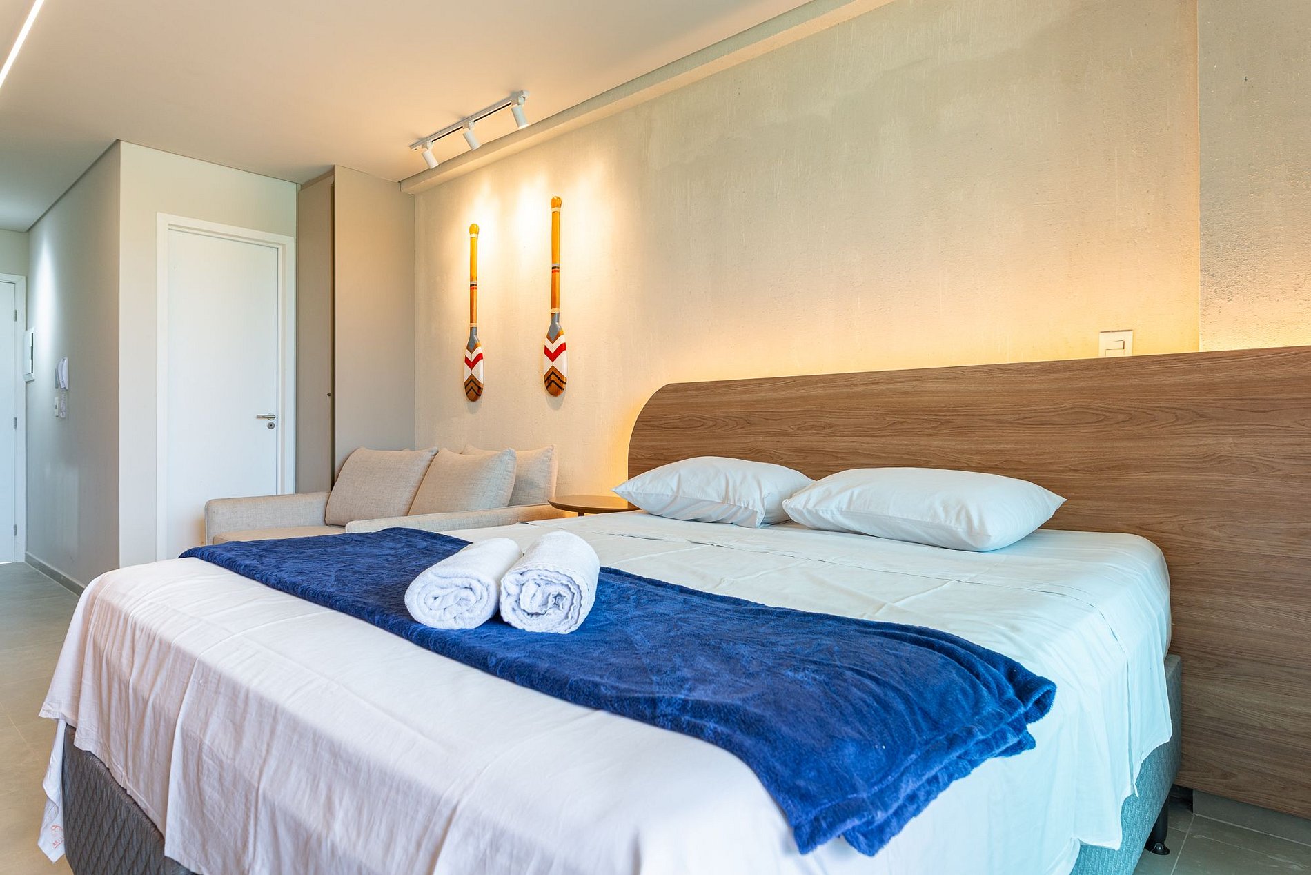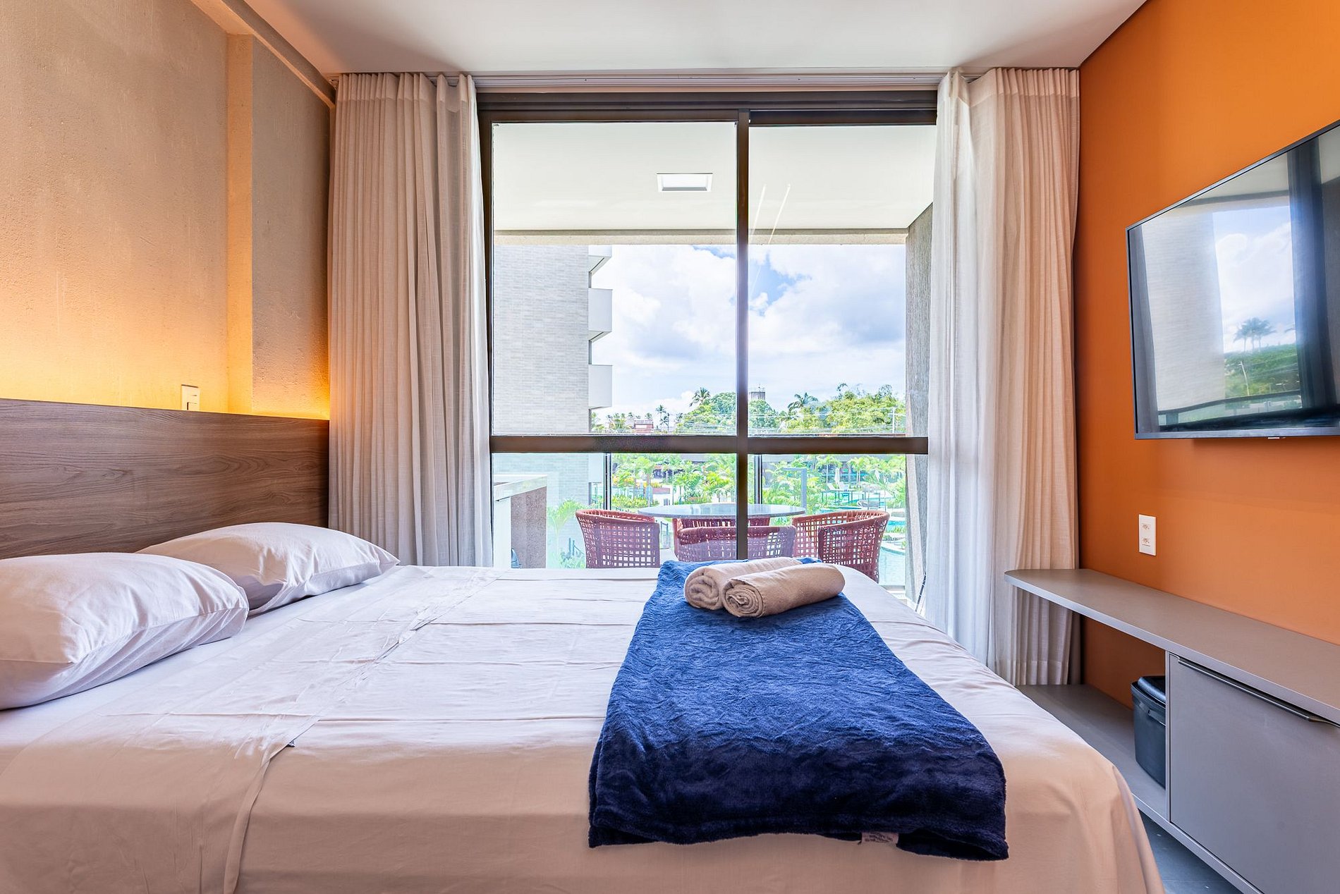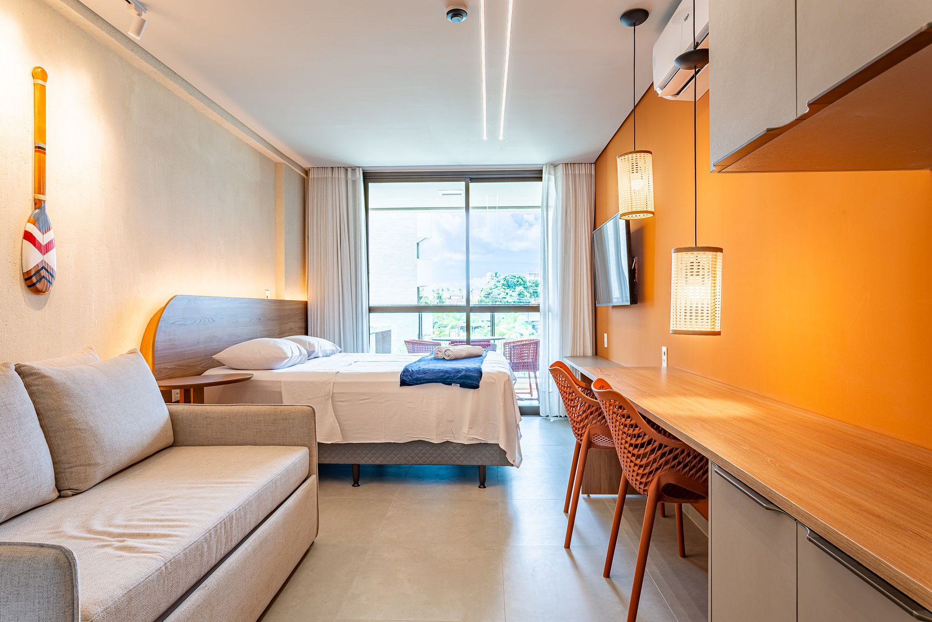 As acomodações são modernas, confortáveis e prontas pra uso — com ar-condicionado, cozinha equipada, Wi-Fi e varanda, ideais tanto pra uma viagem rápida quanto pra uma estadia mais longa.