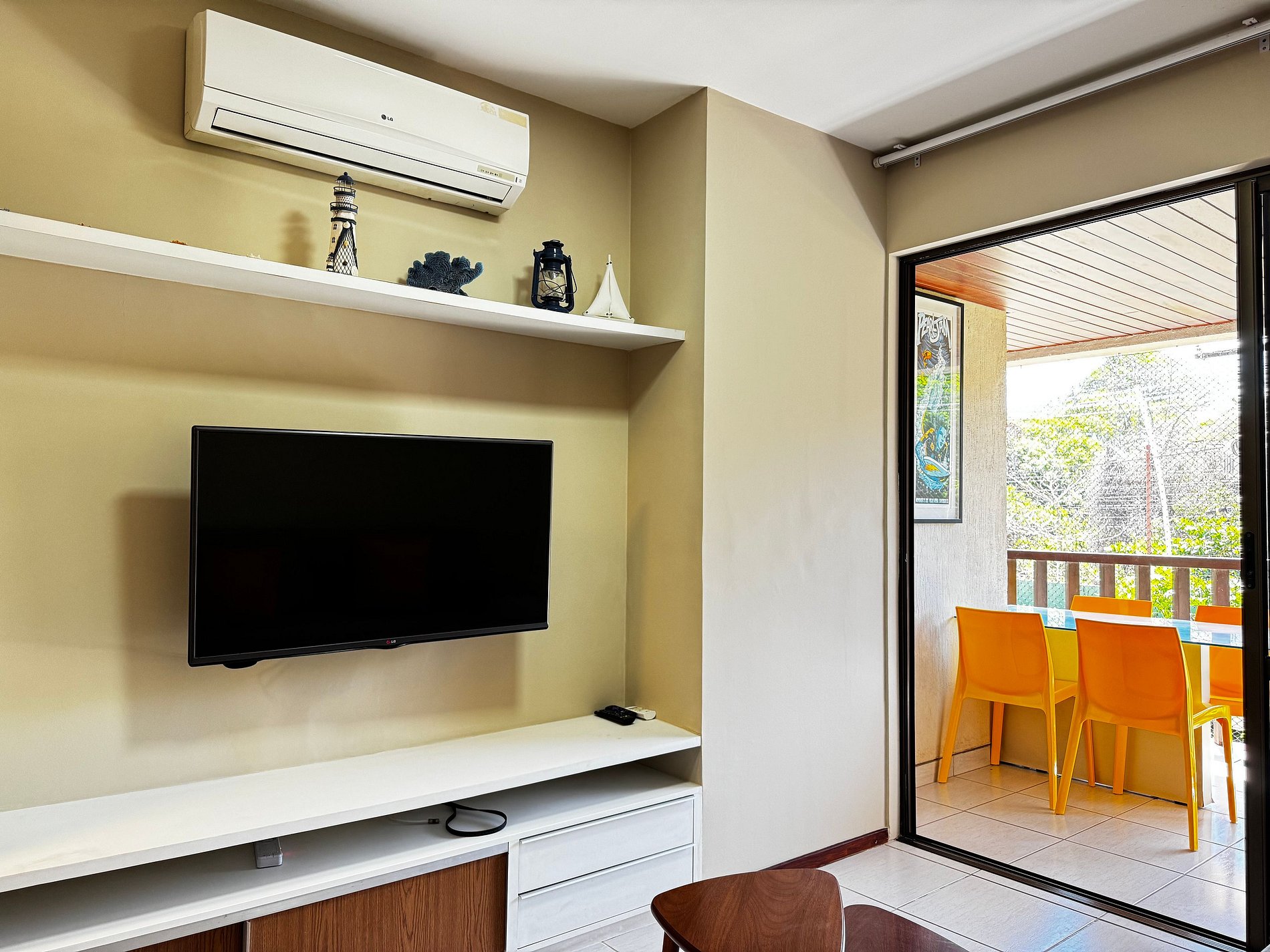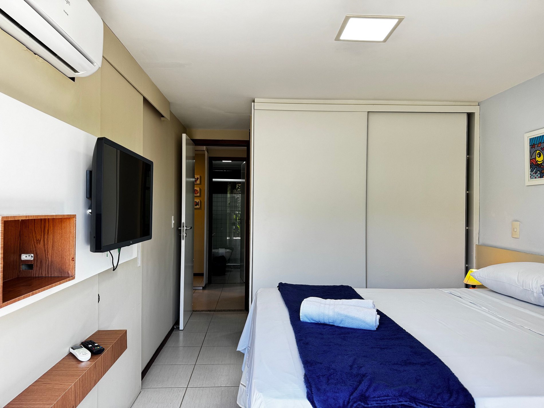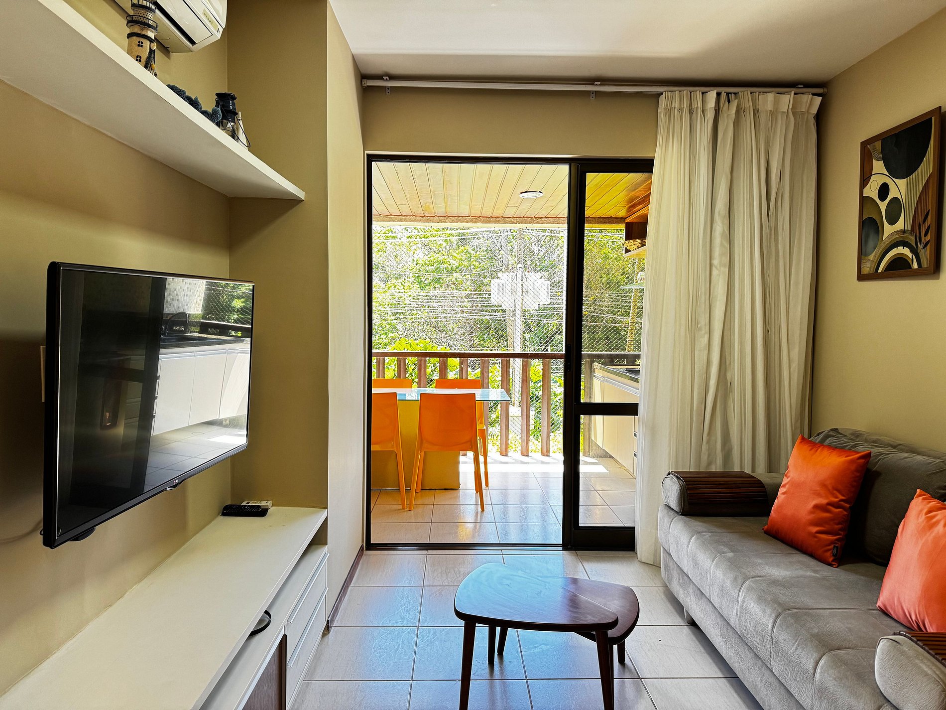 O apartamento dispõe ainda de um banheiro social, mesa de jantar, sala de estar com TV, sofá e cadeiras, varanda equipada com arcondicionado, mesas e cadeiras. Na cozinha, você encontra tudo o que precisa: geladeira, micro-ondas, fogão, forno, jogo de pratos, talheres, copos, xícaras, taças, panelas, abridor de vinho, gelágua e sanduicheira.
