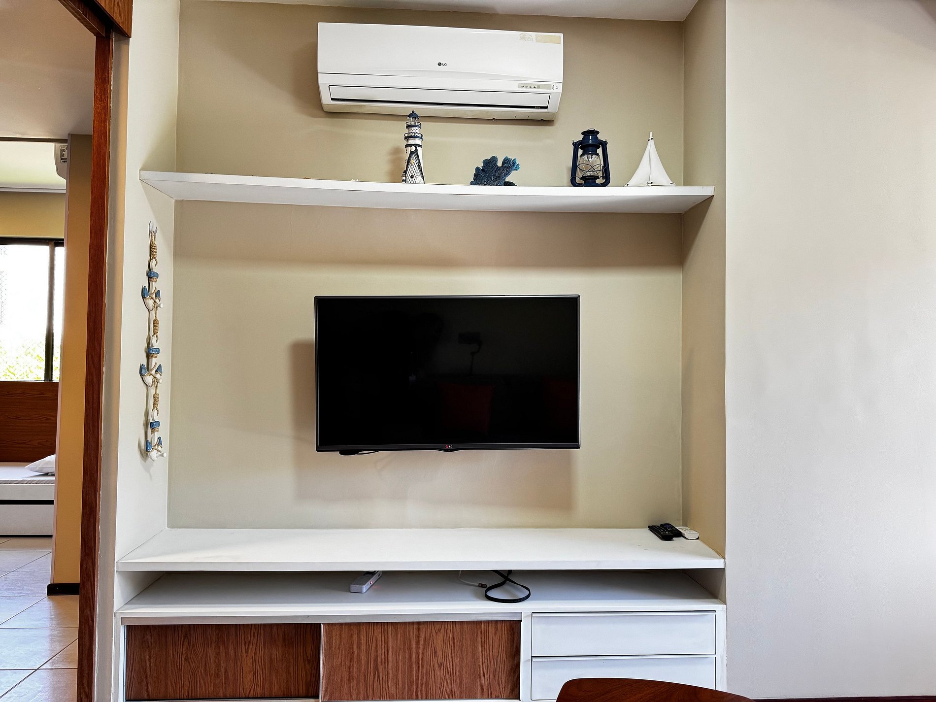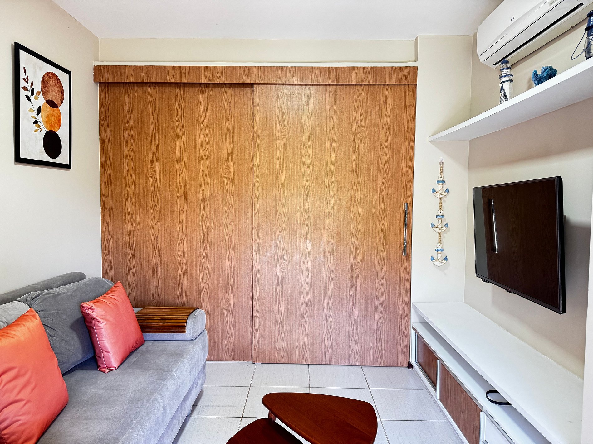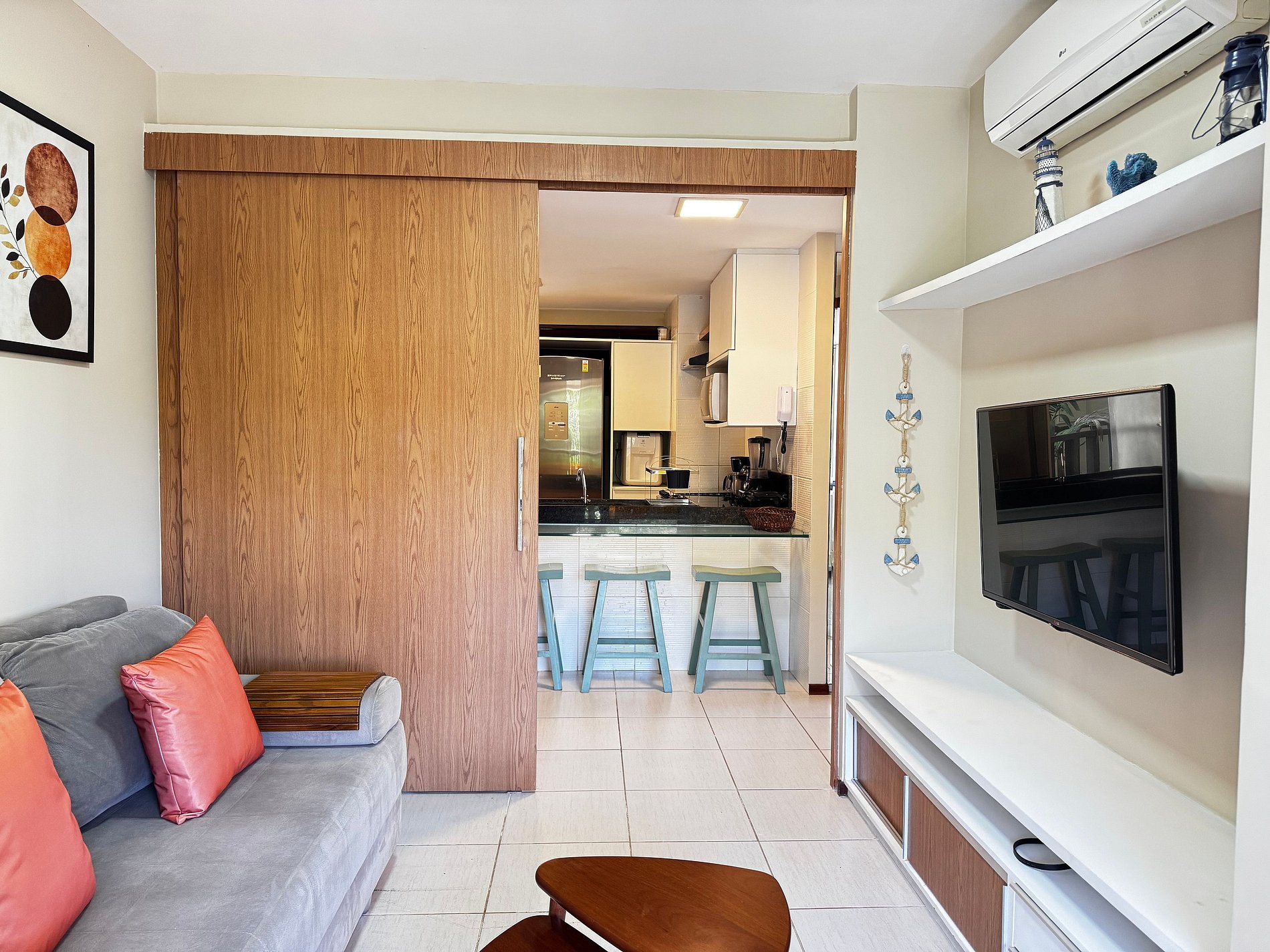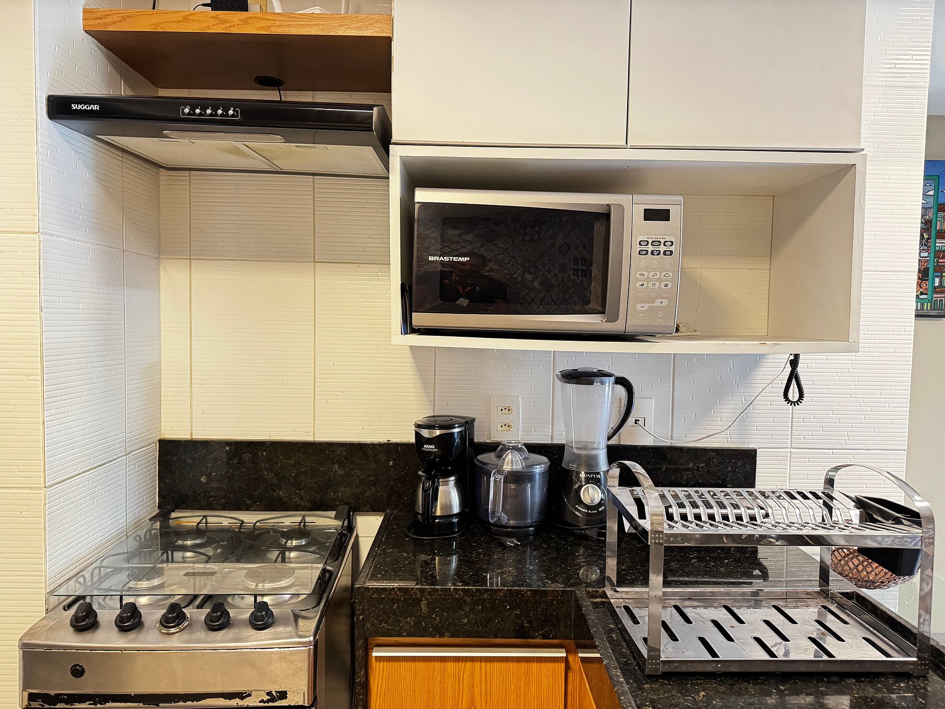 O apartamento dispõe ainda de um banheiro social, mesa de jantar, sala de estar com TV, sofá e cadeiras, varanda equipada com arcondicionado, mesas e cadeiras. Na cozinha, você encontra tudo o que precisa: geladeira, micro-ondas, fogão, forno, jogo de pratos, talheres, copos, xícaras, taças, panelas, abridor de vinho, gelágua e sanduicheira.