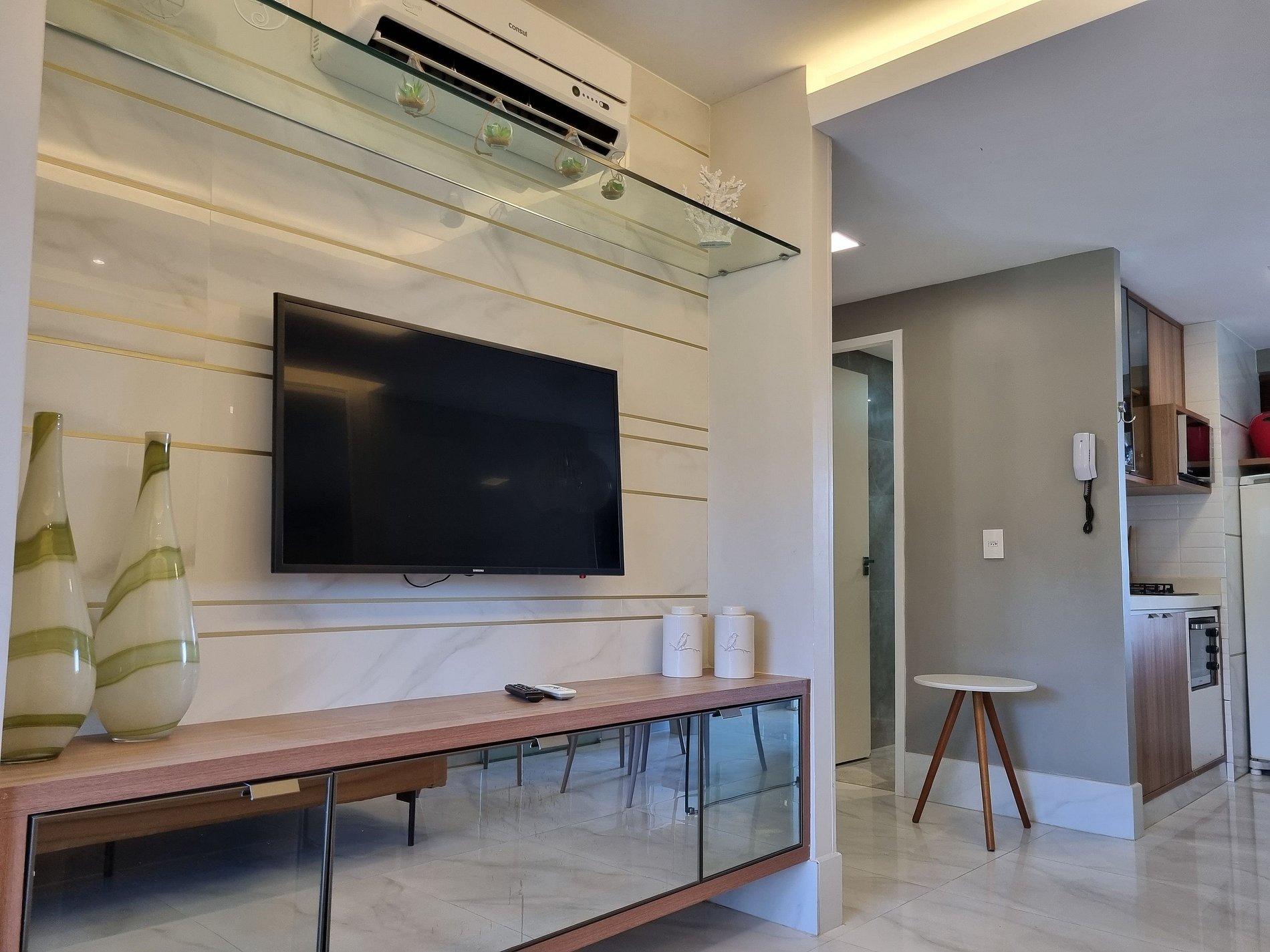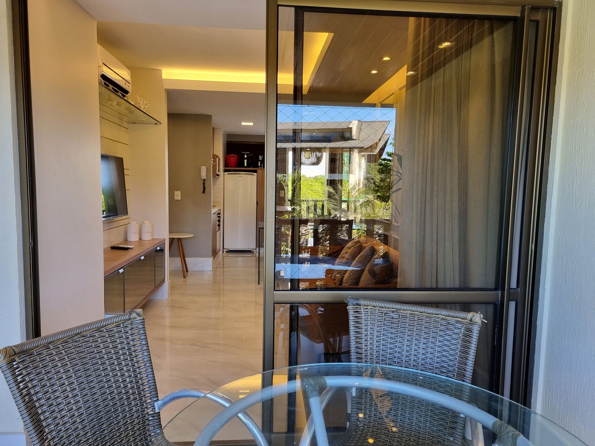 No mais, você vai encontrar 1 banheiro social, mesa para jantar, sala de estar com TV, sofá e cadeiras, varanda com mesas, cadeiras. Na cozinha você tem tudo que precisa: geladeira, micro-ondas, Airfry, fogão, forno, jogo de prato, talheres, copos, xícaras, taças, e panelas, abridor de vinho, gelágua e sanduicheira.