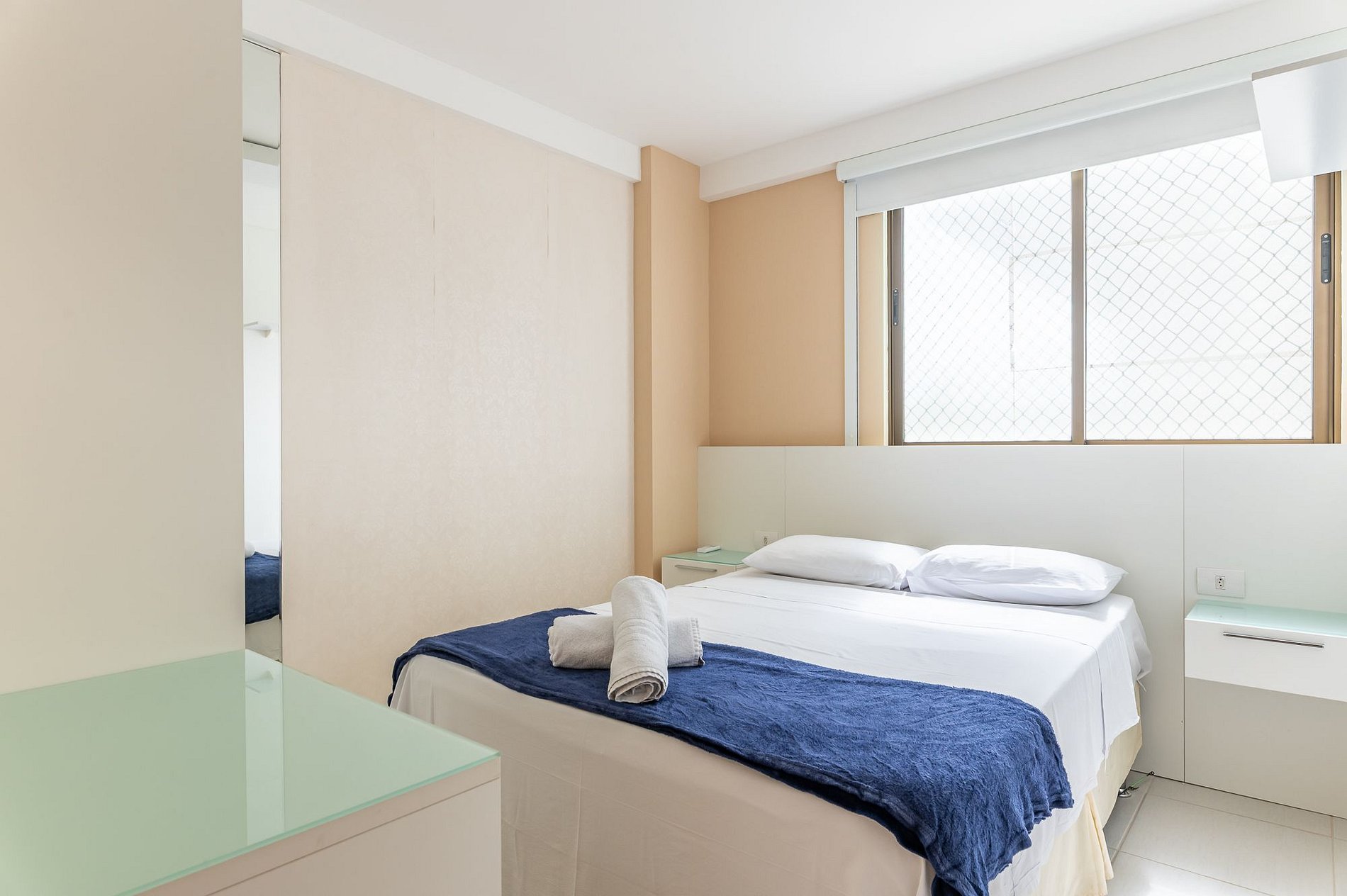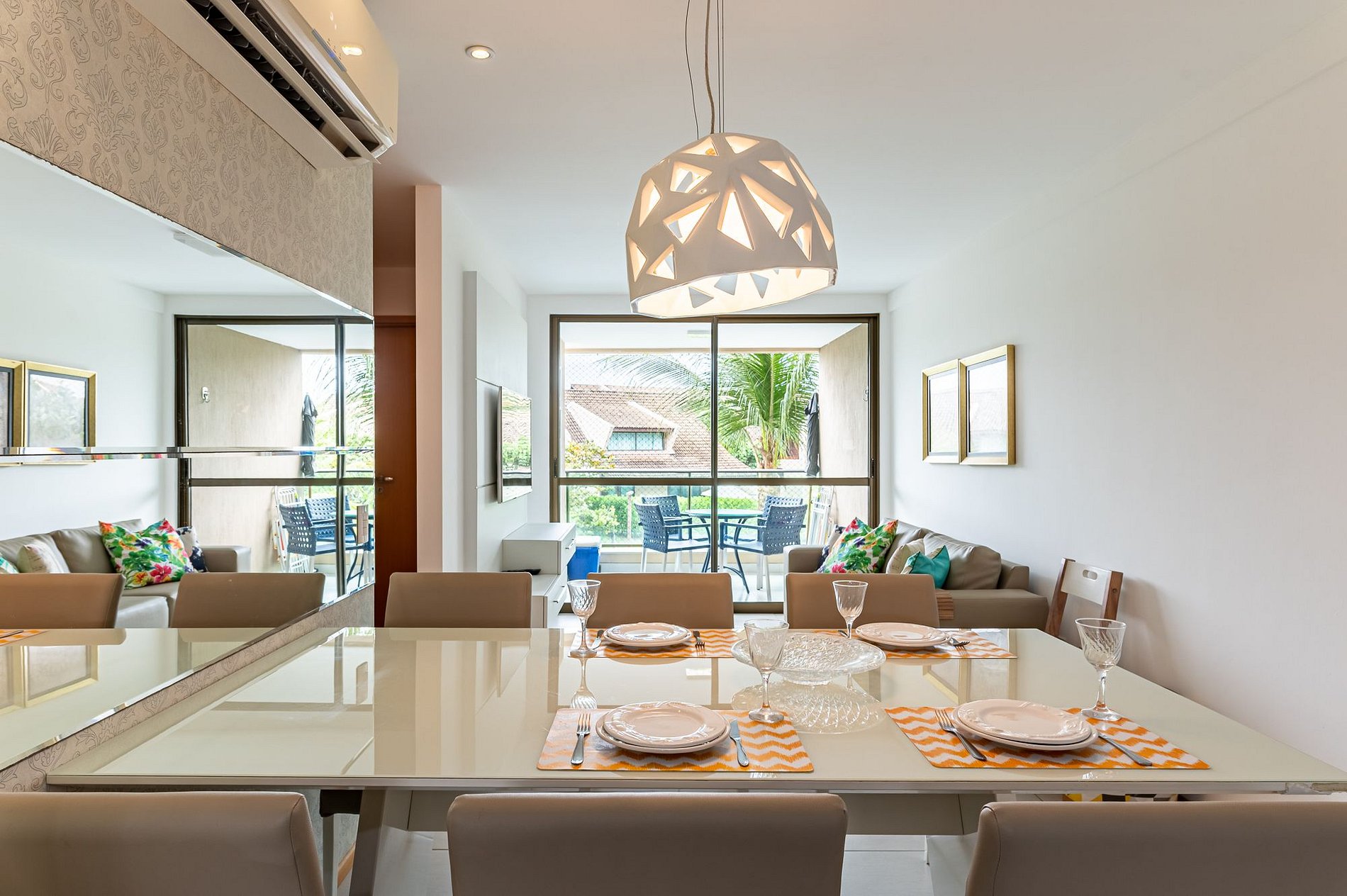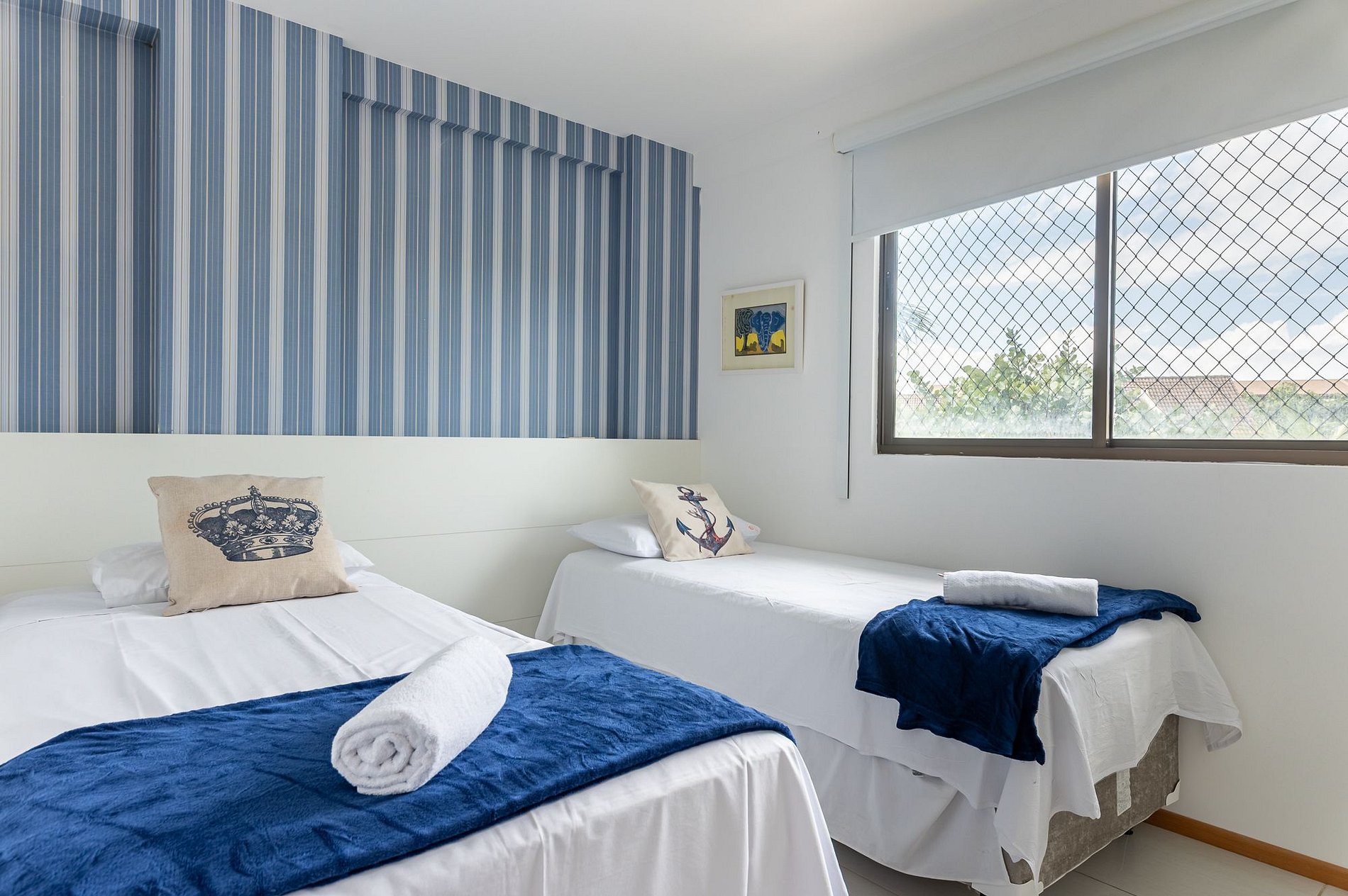 • Acomodações: O flat é totalmente mobiliado com três quartos sendo 2 camas de casal e 2 camas de solteiro e com espaços modernos e bem equipados. O apartamento é nascente e todos os quartos possui Ar-condicionado. Sala ampla com 2 ambientes e cozinha completa.