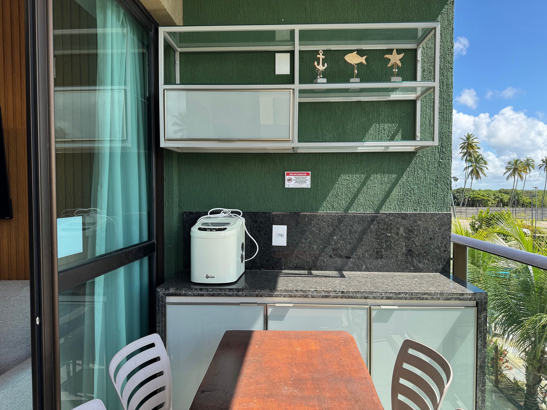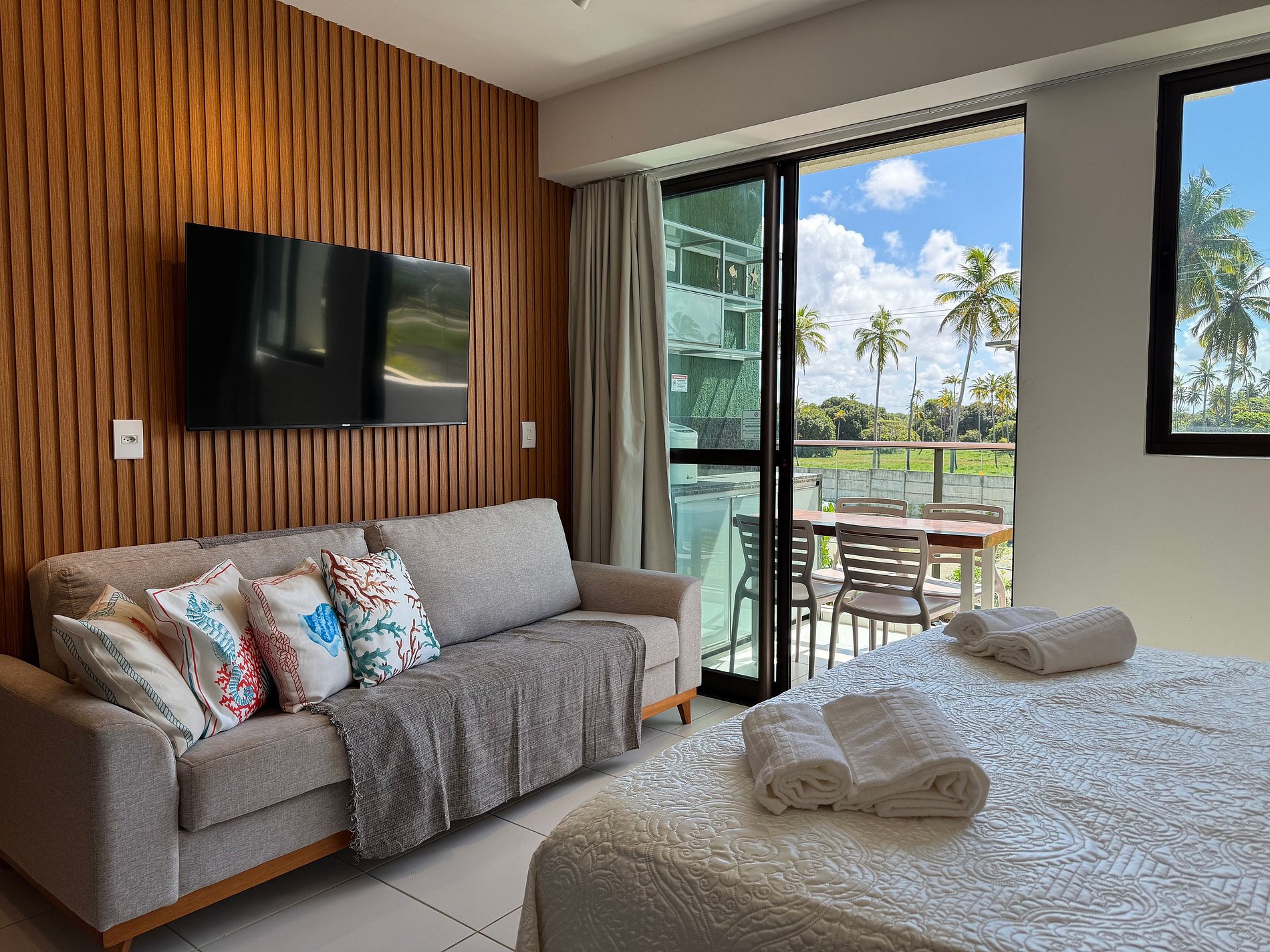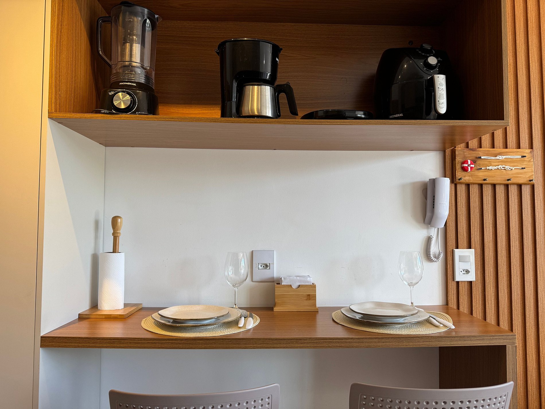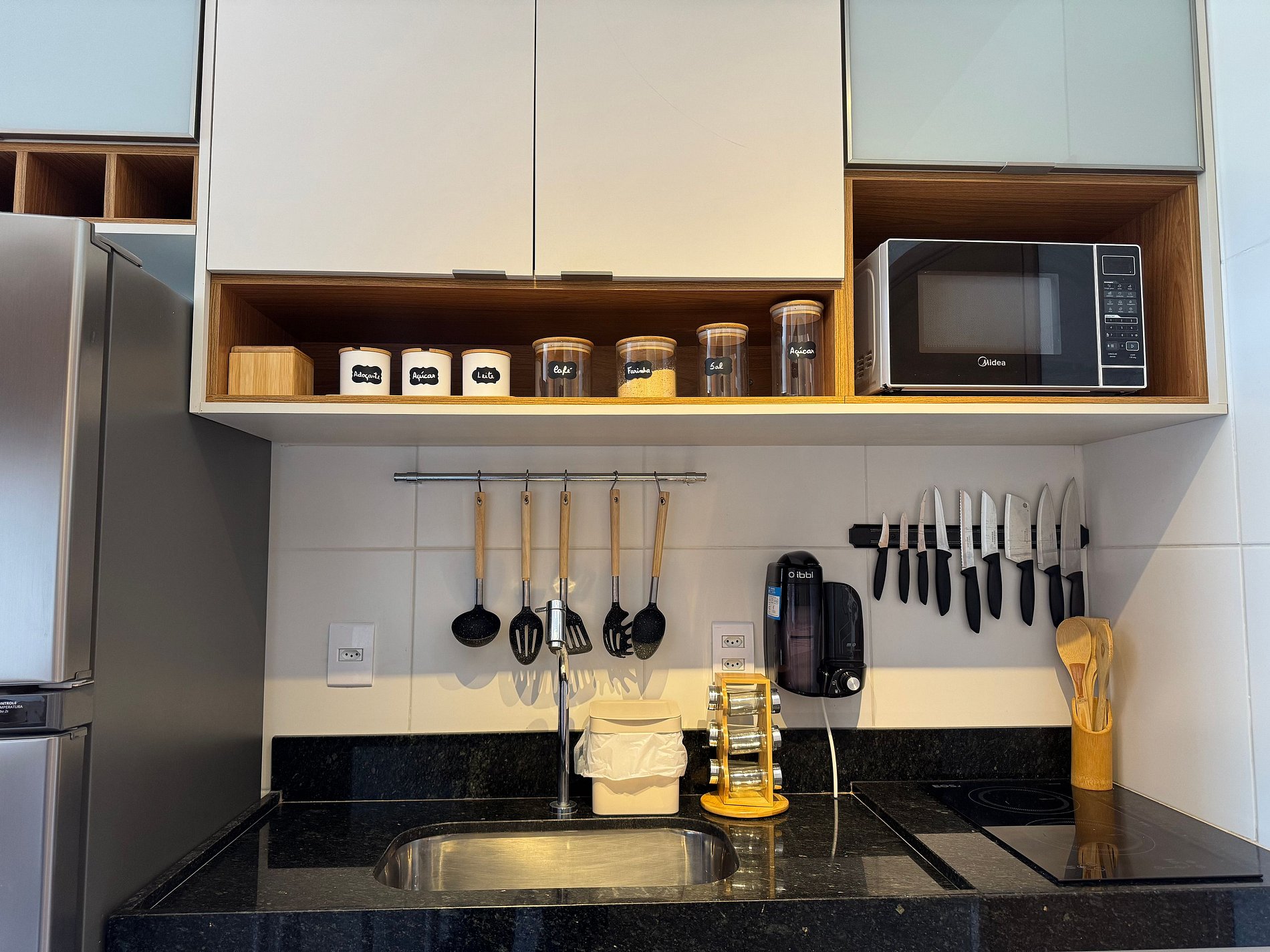 O apartamento tem 26m2, uma suíte completa com Smart TV 50", Arcondicionado 19mil Btus, Geladeira, Fogão Elétrico 2 bocas, Forno Microondas e Cama Casal.